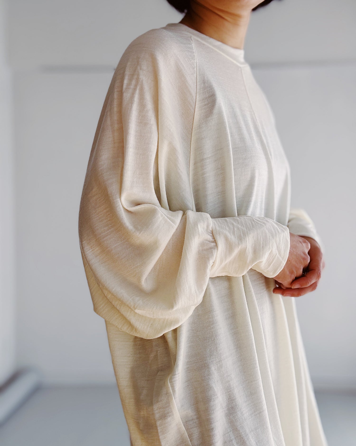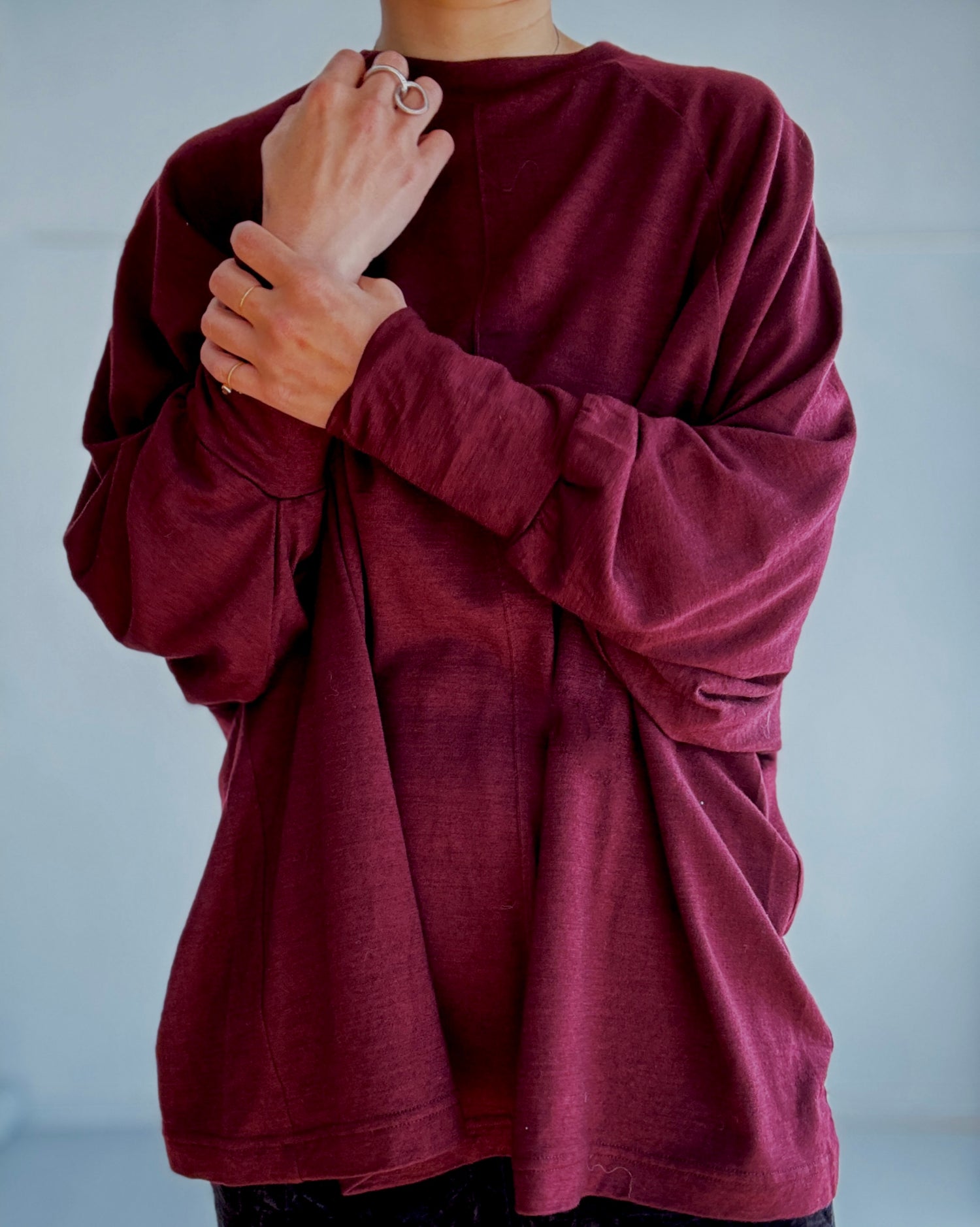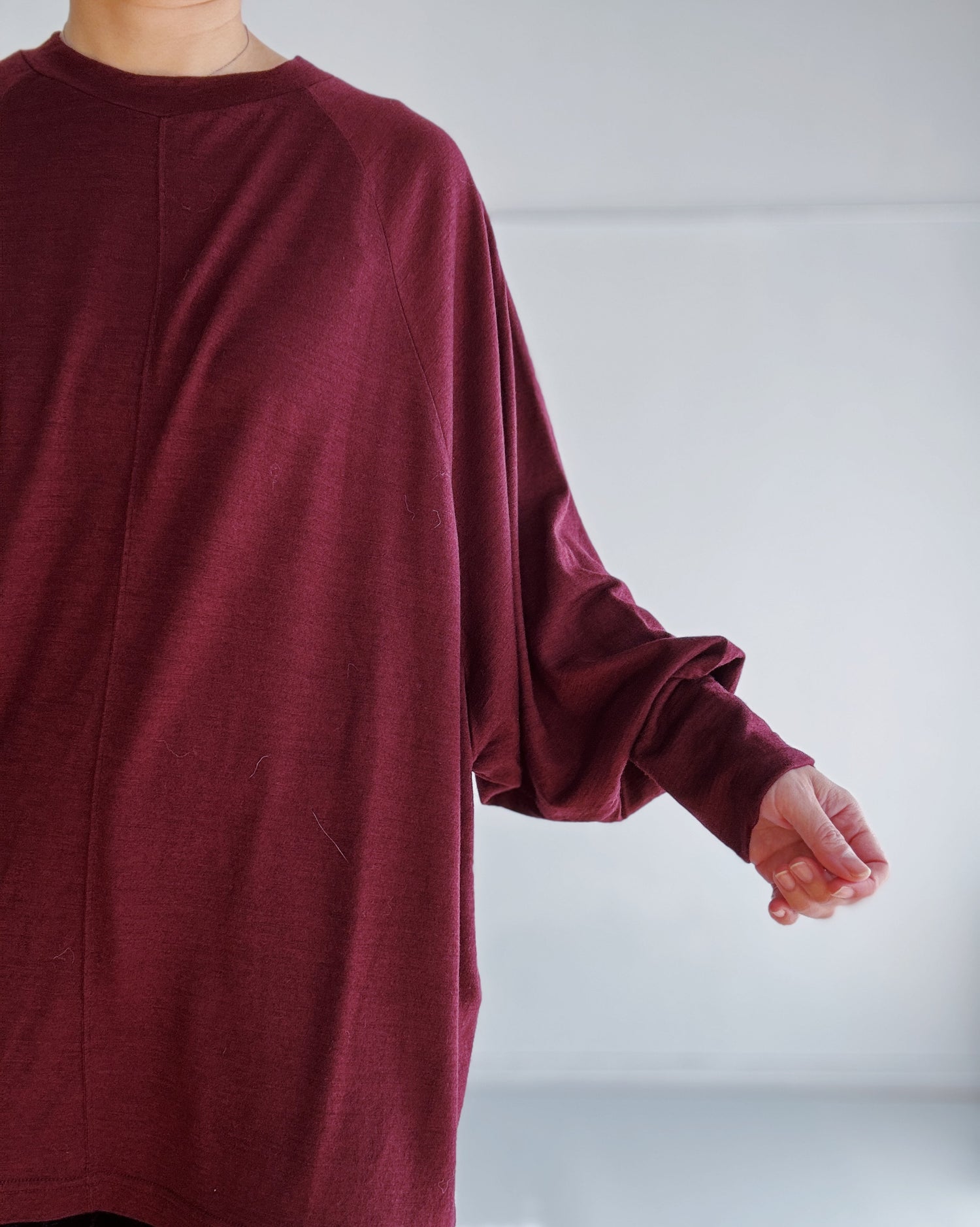 手洗い可能なウール100%の素材を使用しています。ゆったりシルエットのドルマンスリーブのプルオーバーです。袖口のカフスがデザインのポイント。ゆるっとたゆむ袖口のシルエットがとても素敵です。