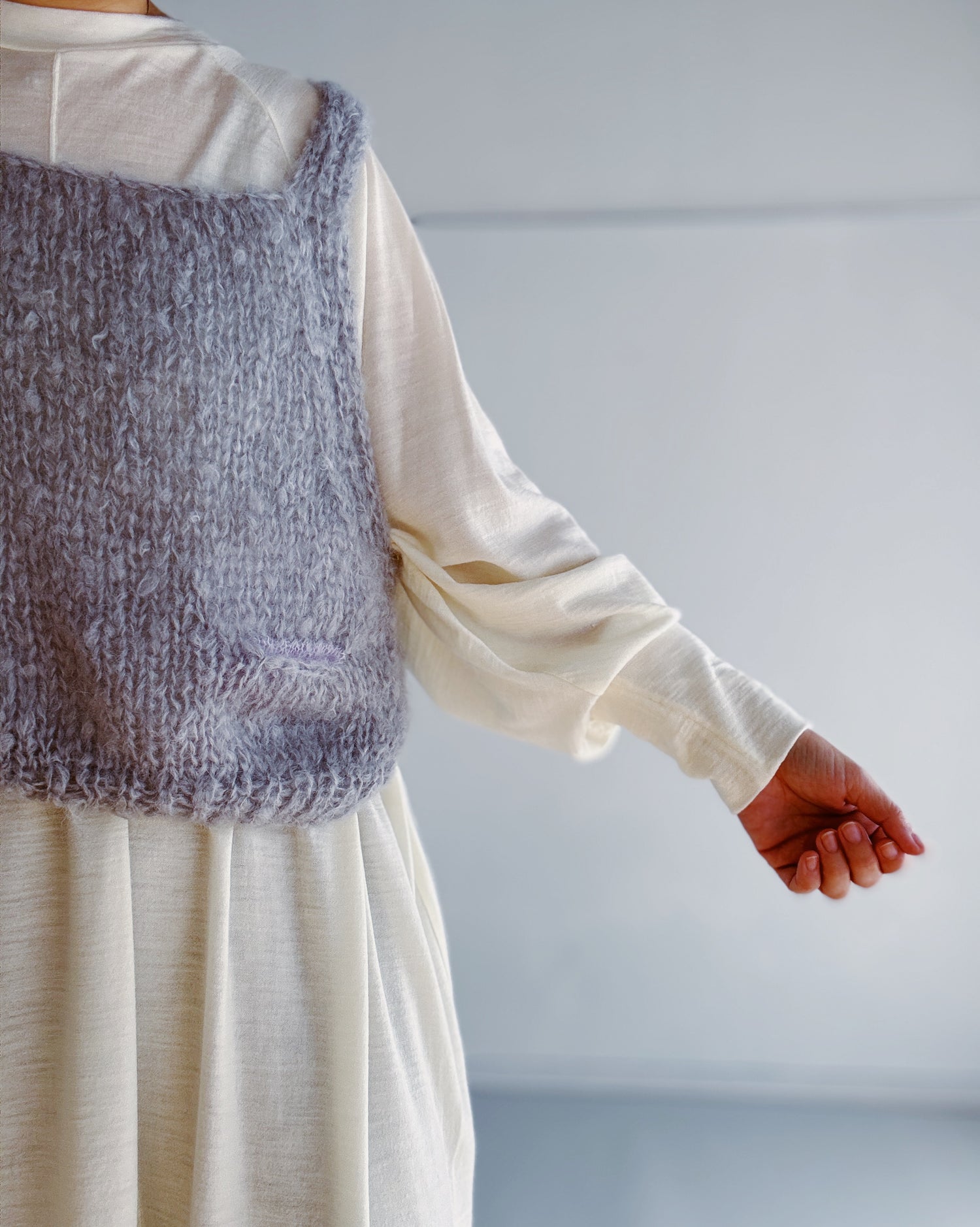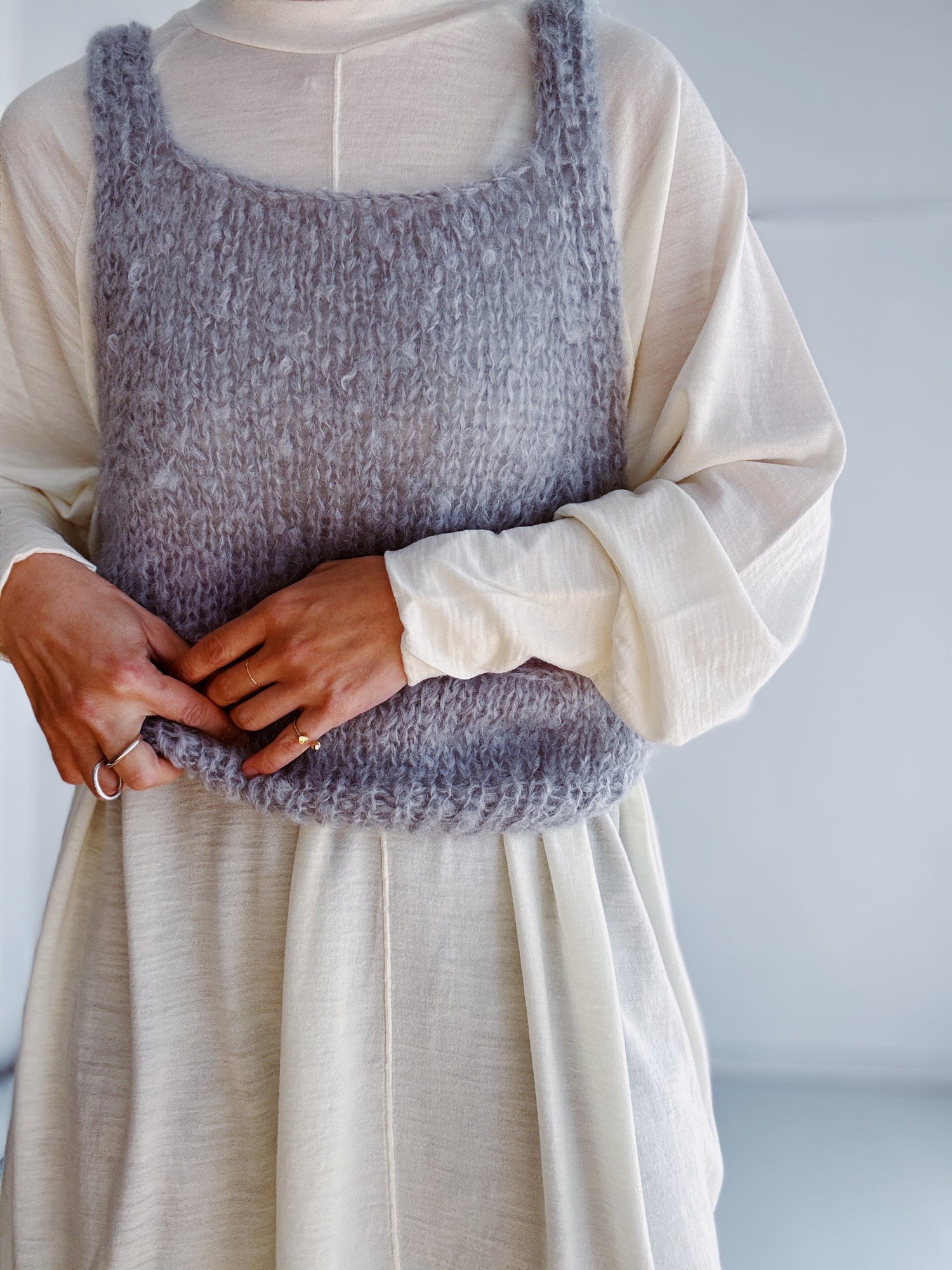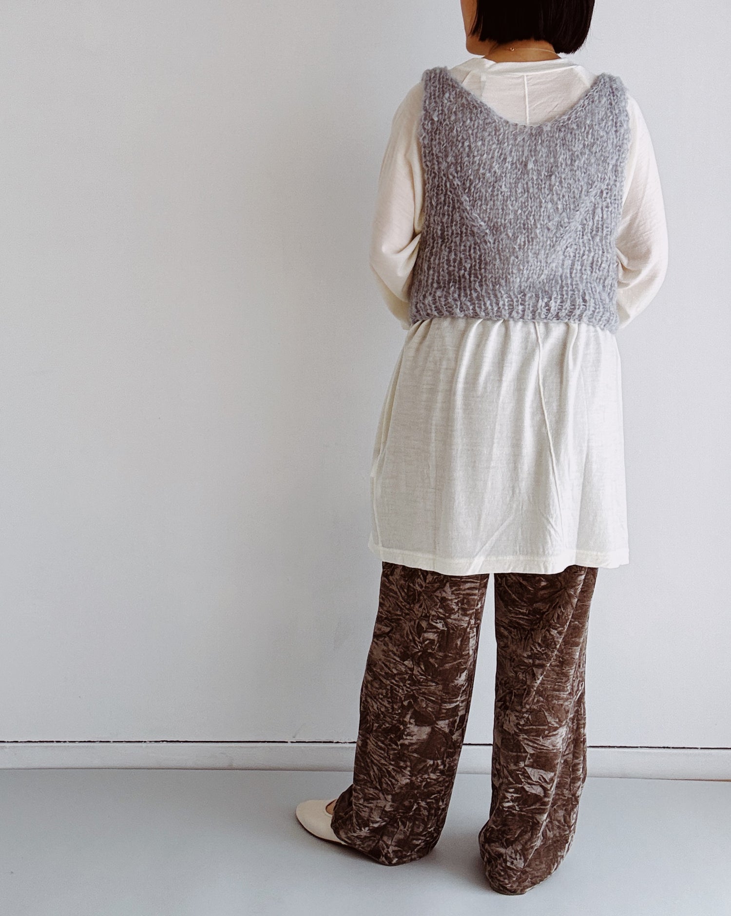 軽やかで暖かく、一枚ではもちろん、ざっくりニットのインナーやベストのインナーとしても活躍します。