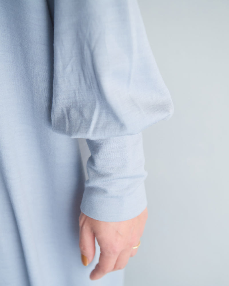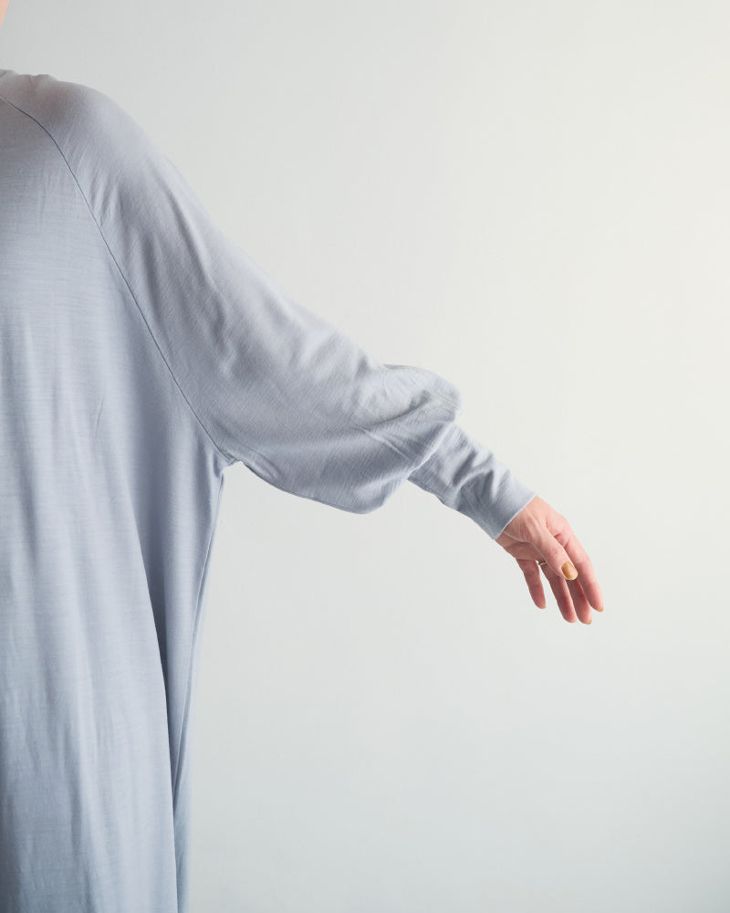 手洗い可能なウール100%の素材を使用しています。ゆったりシルエットのドルマンスリーブのプルオーバーです。袖口のカフスがデザインのポイント。ゆるっとたゆむ袖口のシルエットがとても素敵です。落ち感が美しく、重ねてもボリュームが出にくいのが嬉しいです。