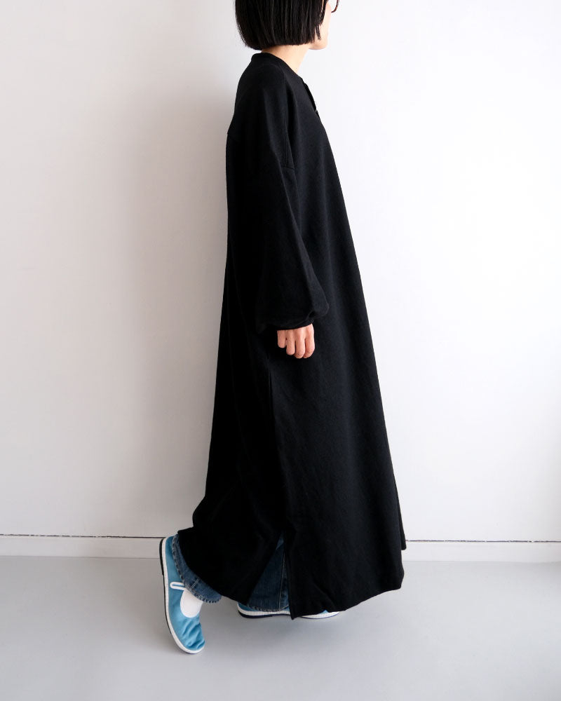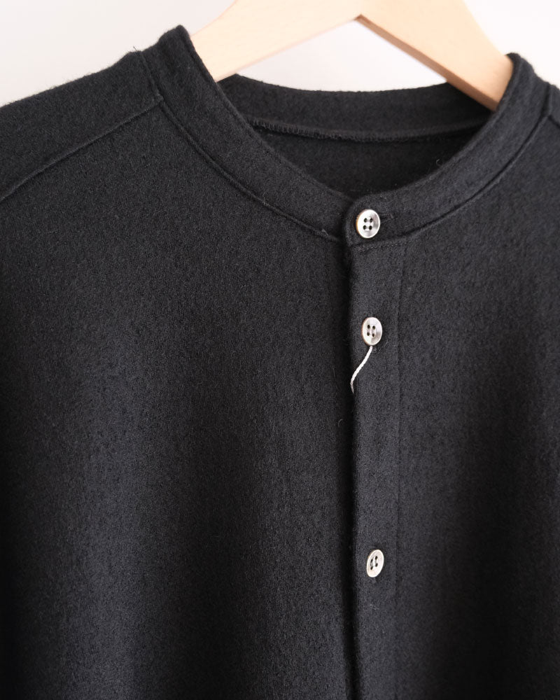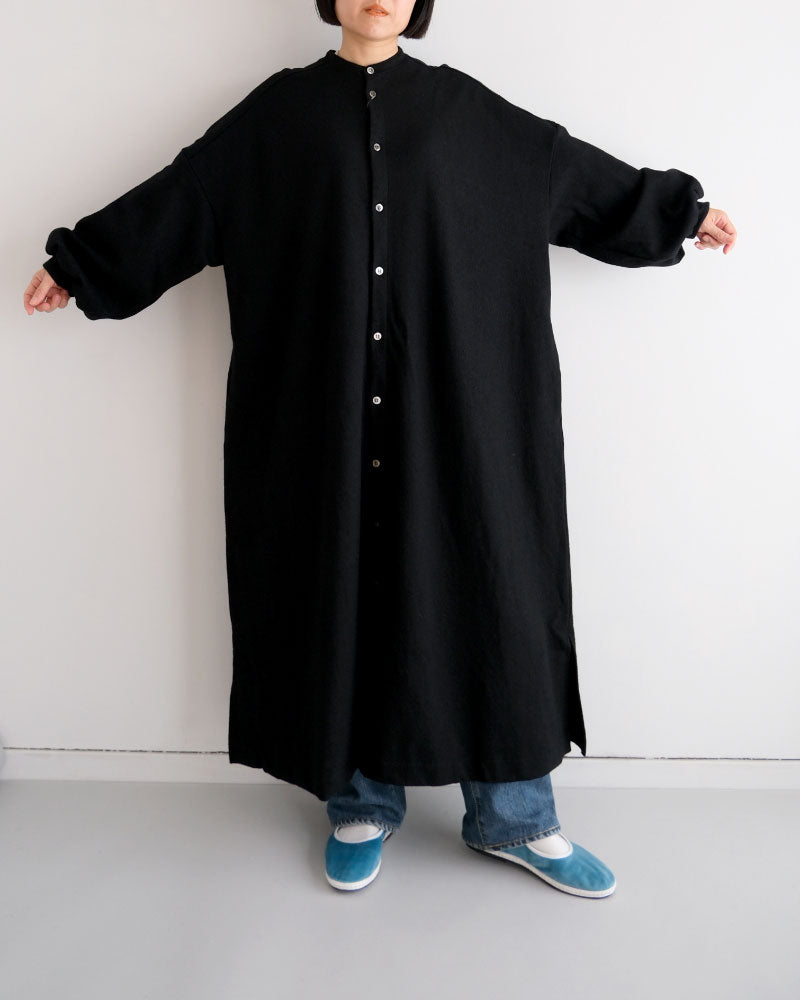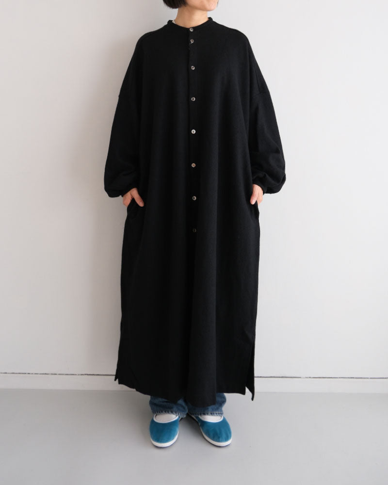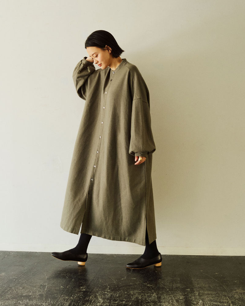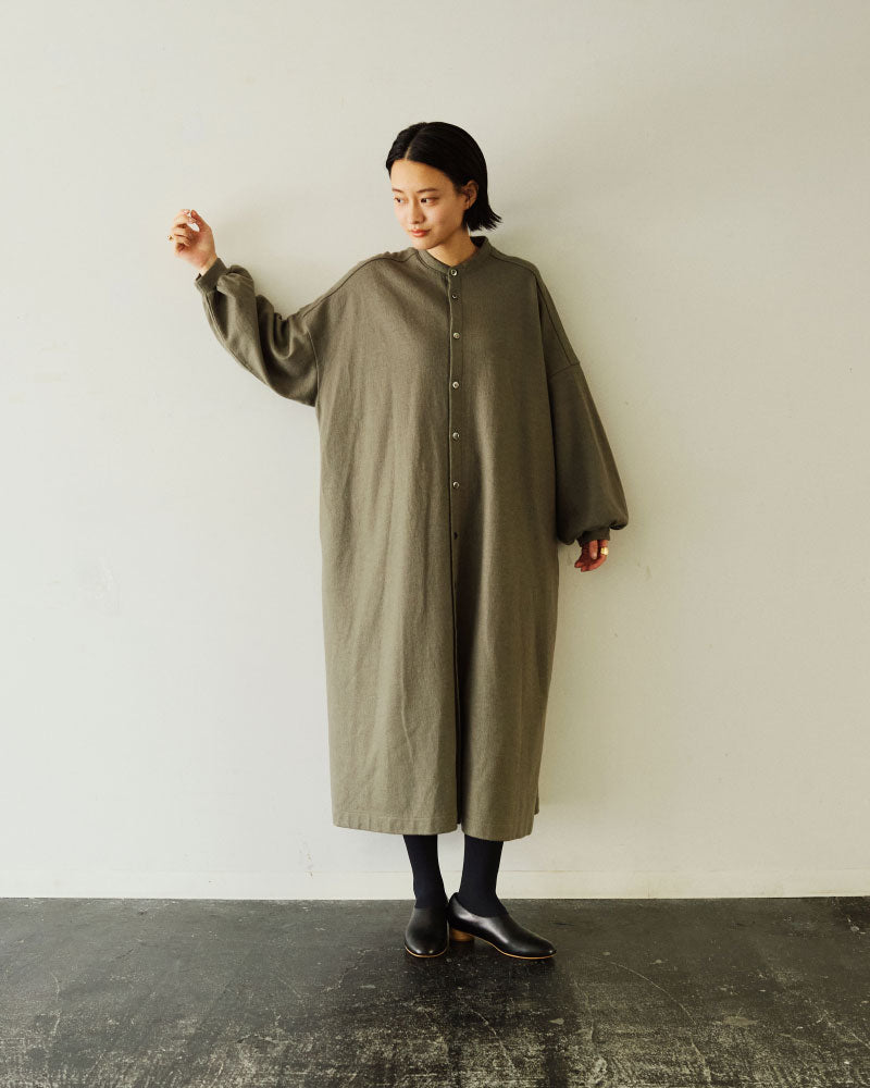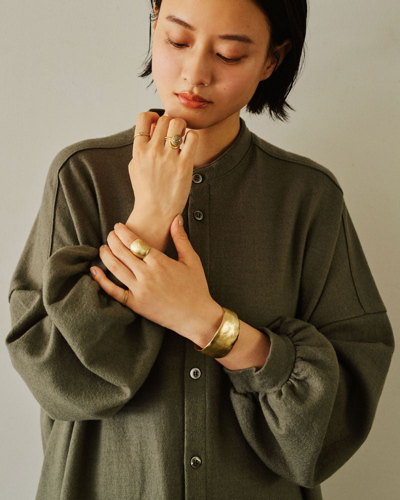 襟元は上品な印象のバンドカラー。ふわりと広がるボリューム袖が女性らしいニュアンスを添え、ゆったりとした身幅と背中の切り替えが生み出す立体的なシルエットで、インに薄手のニットやブラウスを重ねても快適に着られる仕様になっています。
