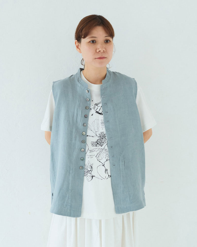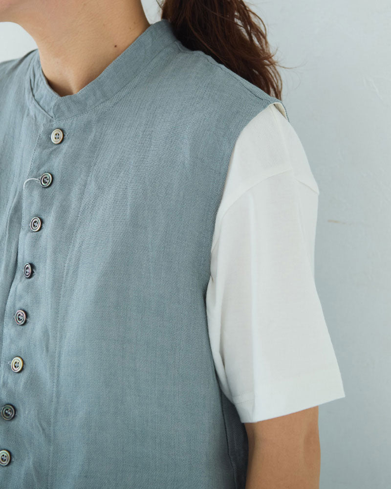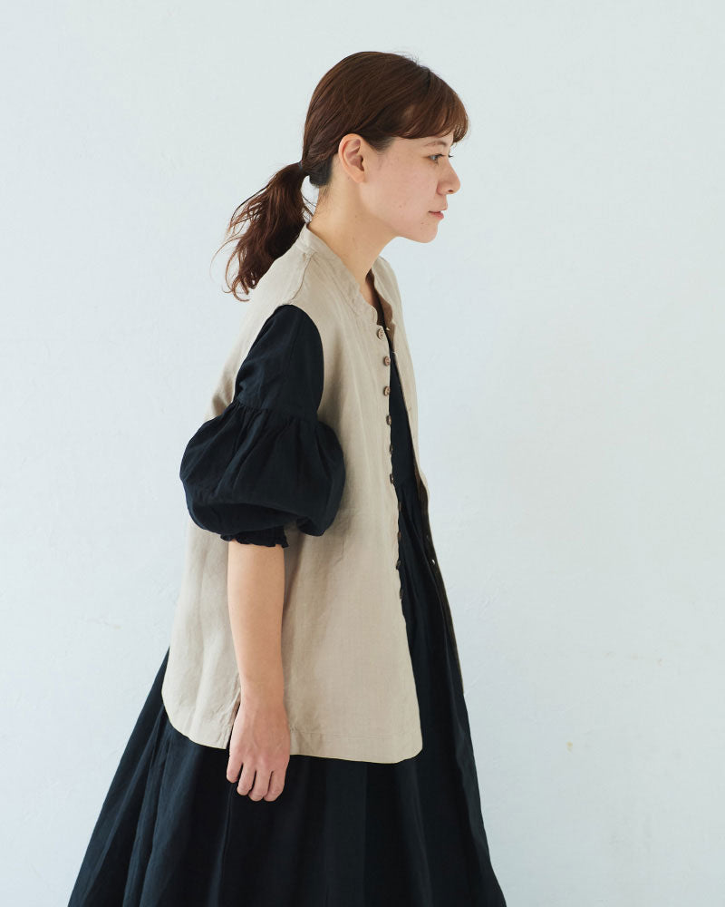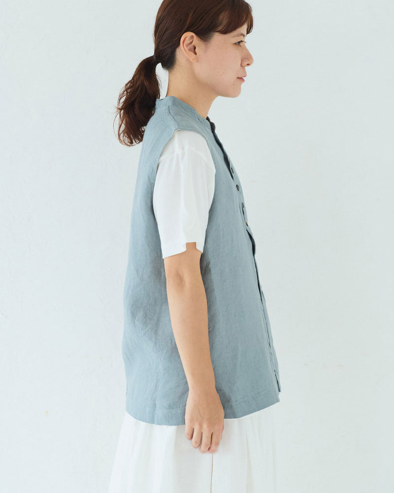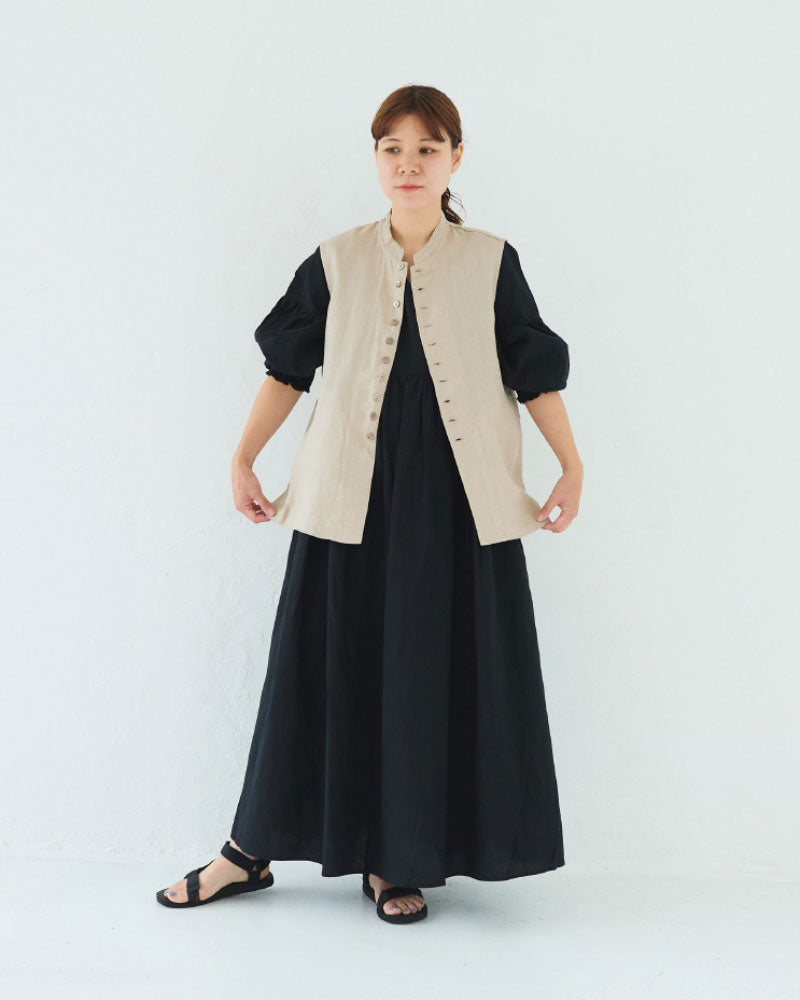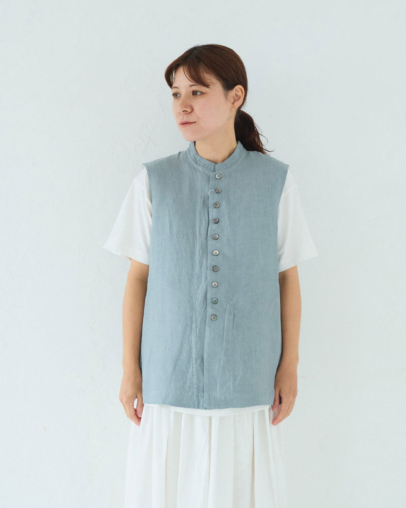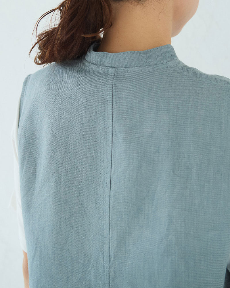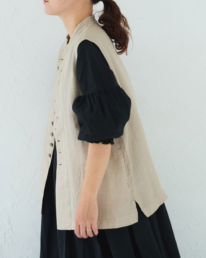 風合い豊かなオーガニックリネンのベスト。小さめのスタンドカラーがクラシカルな印象です。ワンピースと重ねたり、シンプルなTシャツに一枚足したり、コーディネートの幅を広げてくれるアイテムです。