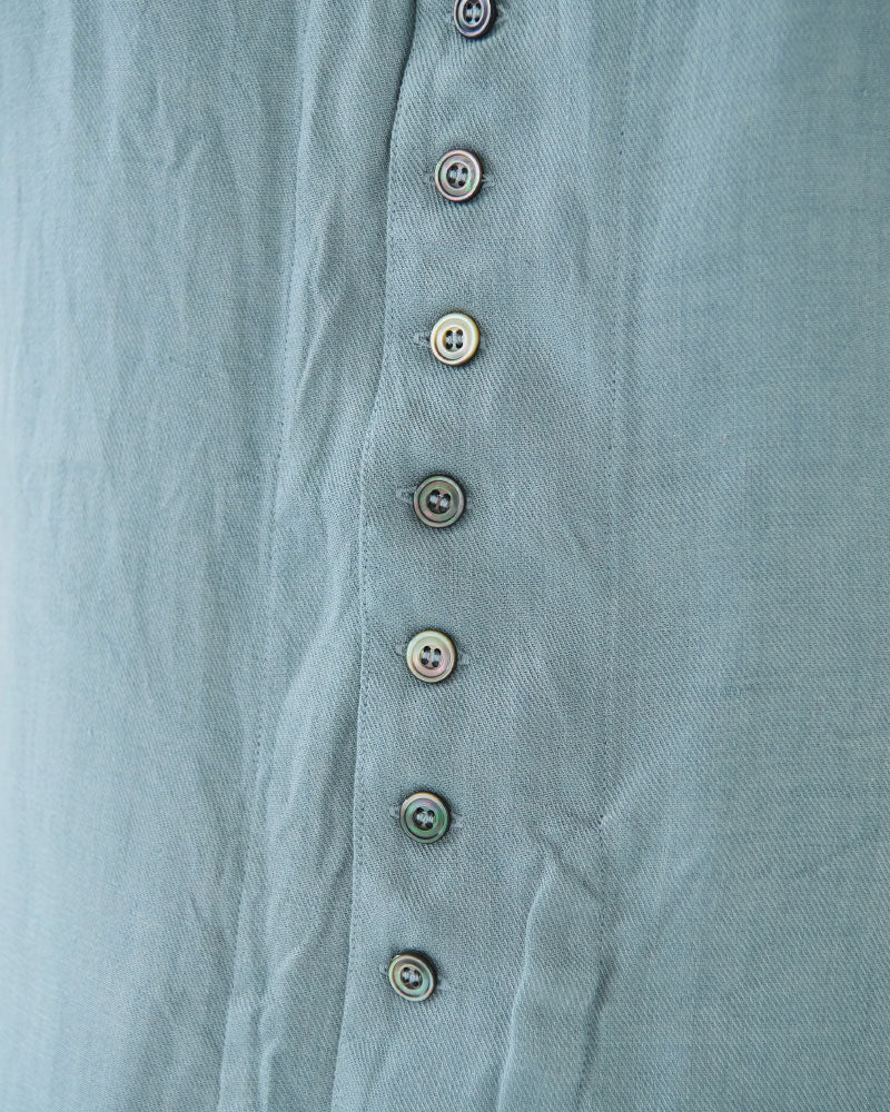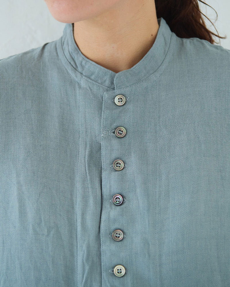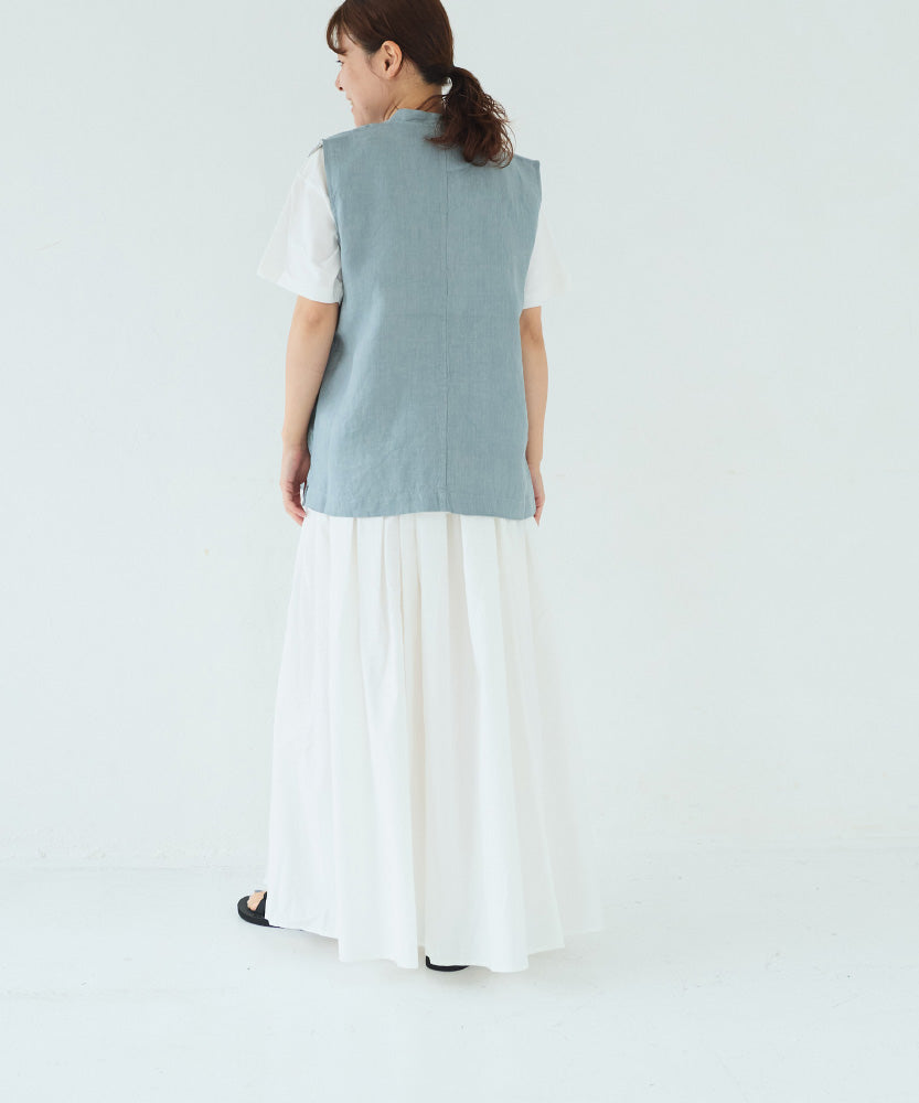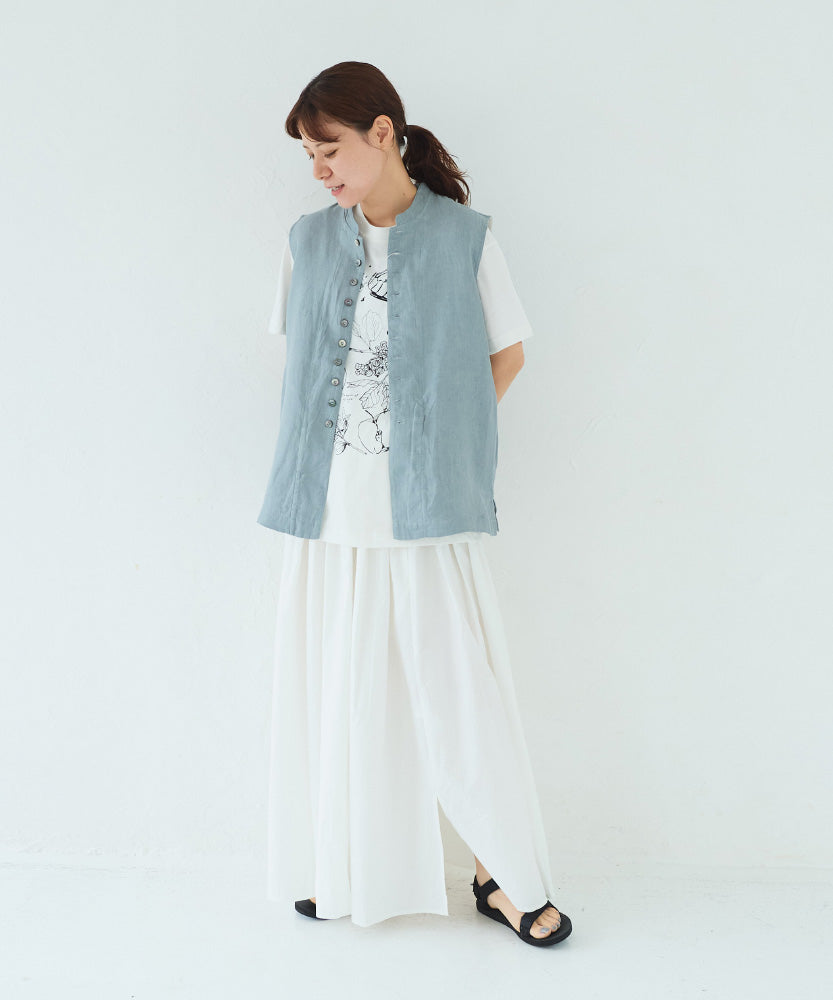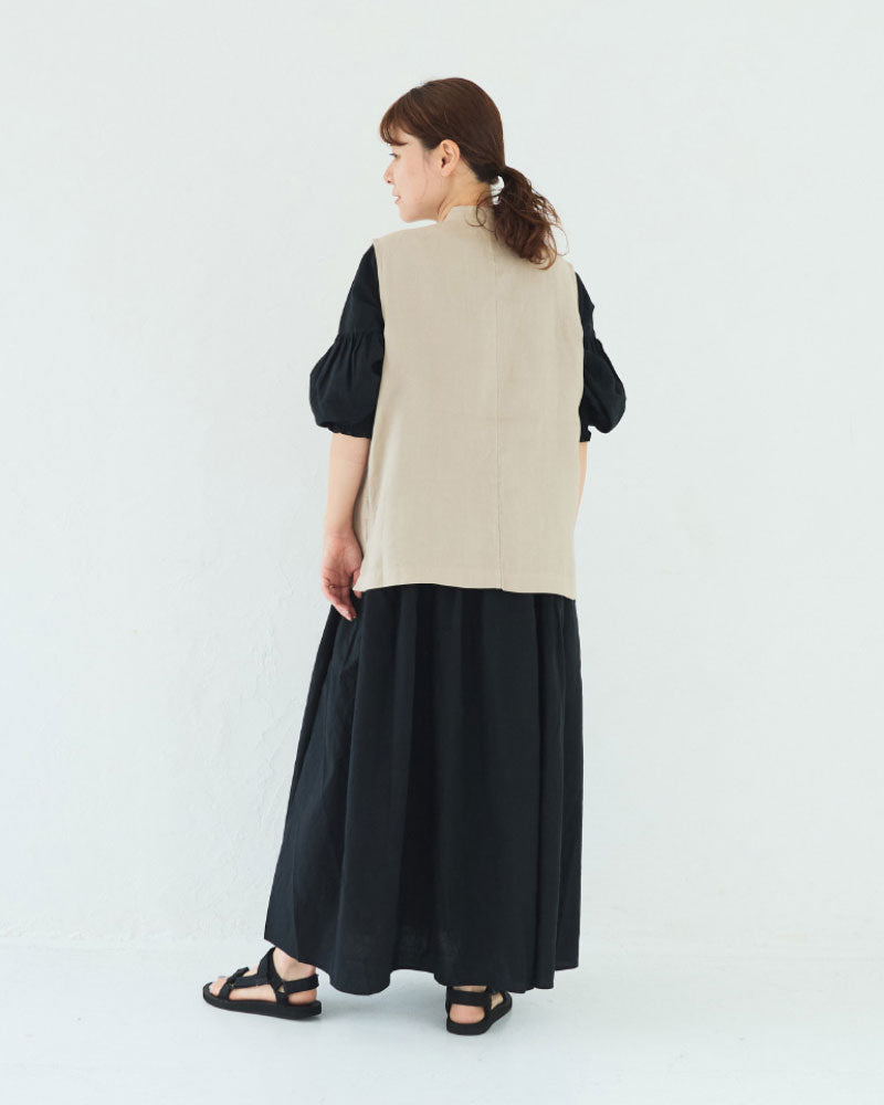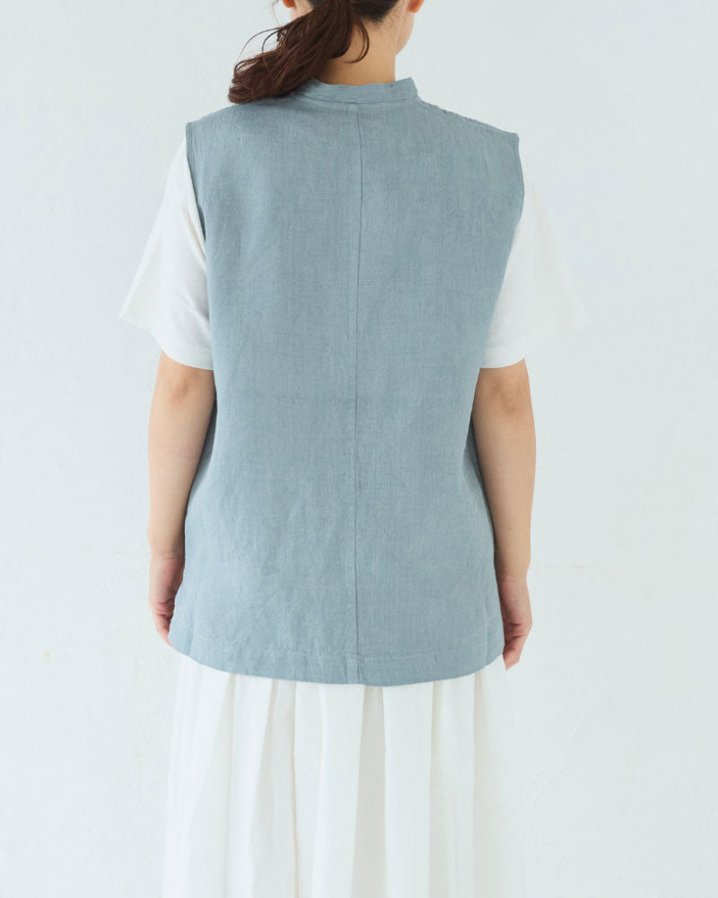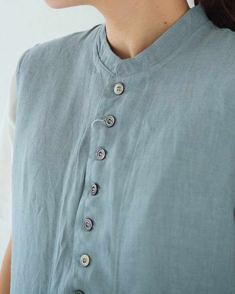 風合い豊かなオーガニックリネンのベスト。小さめのスタンドカラーがクラシカルな印象です。ワンピースと重ねたり、シンプルなTシャツに一枚足したり、コーディネートの幅を広げてくれるアイテムです。