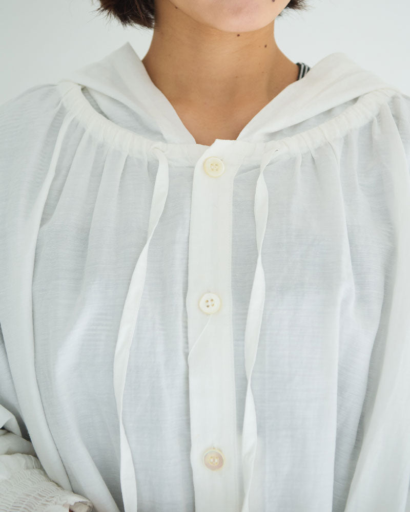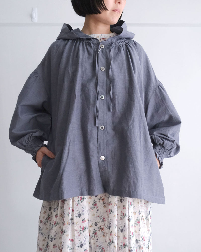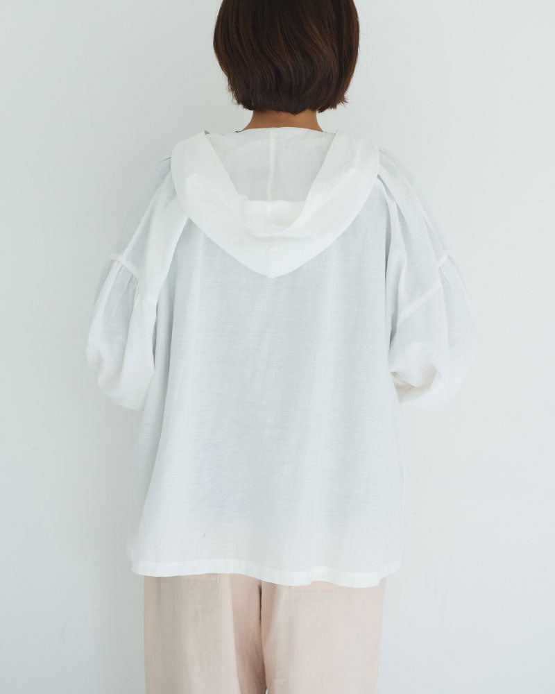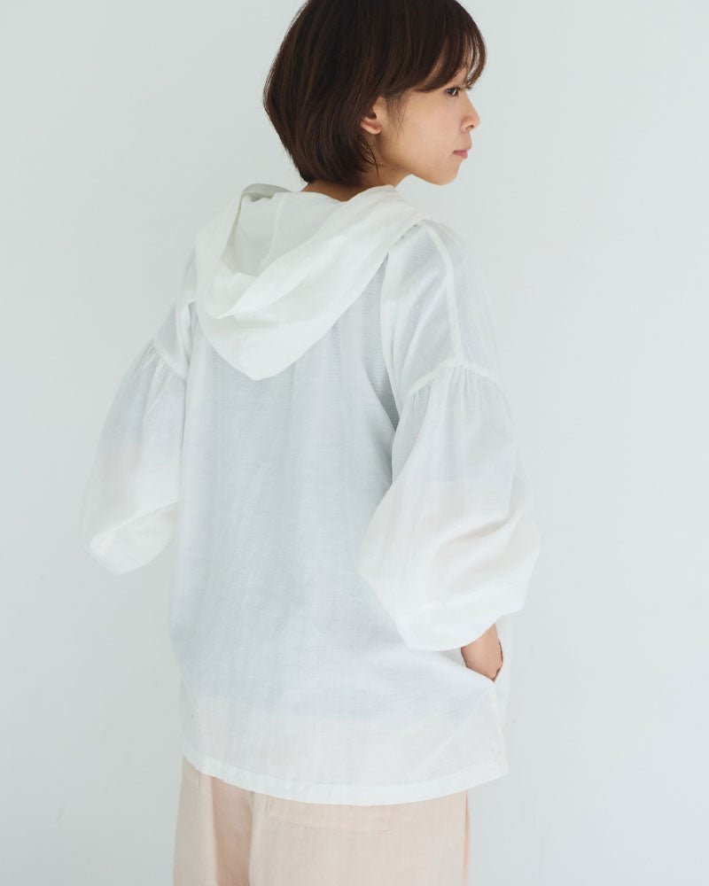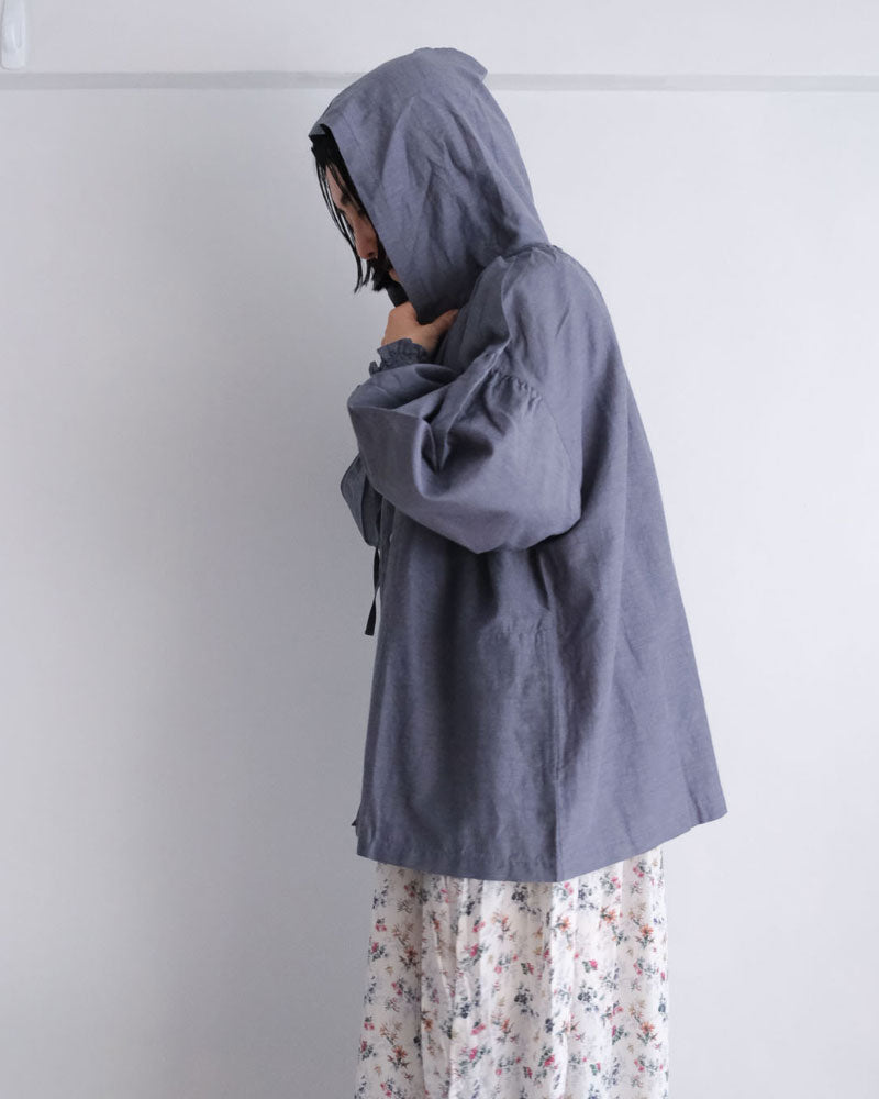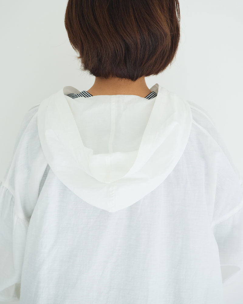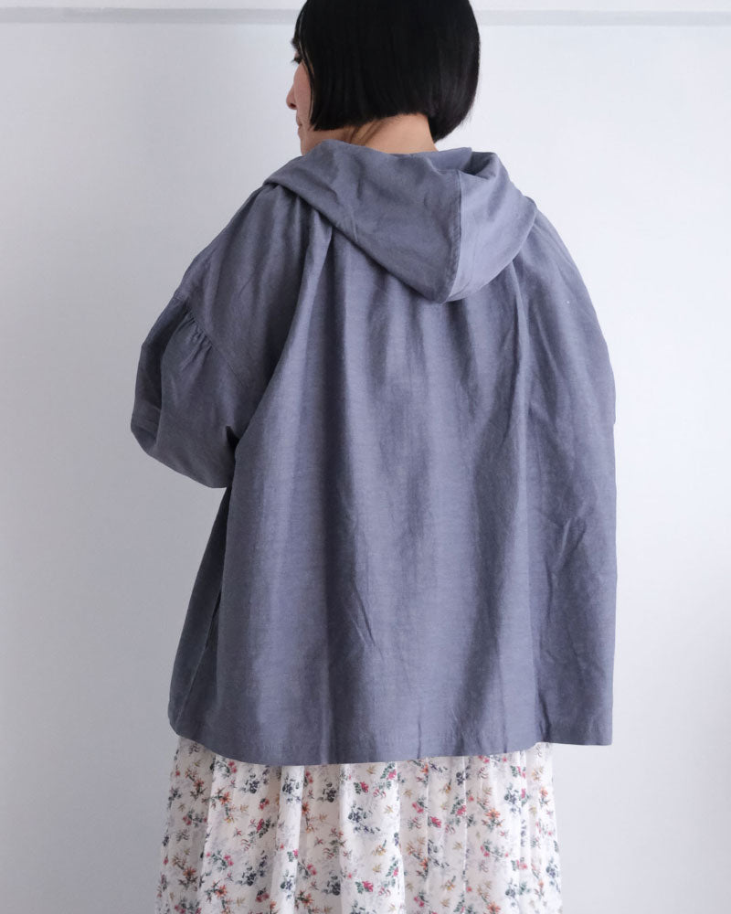 オリジナルのコットンキュプラリネン素材を使用した、軽やかな着心地のフード付き羽織アイテム。経糸にキュプラ、緯糸に綿麻を用いて織り上げた平織り生地に、トリプルワッシャー加工を施した新素材です。