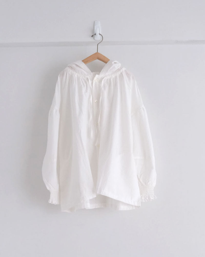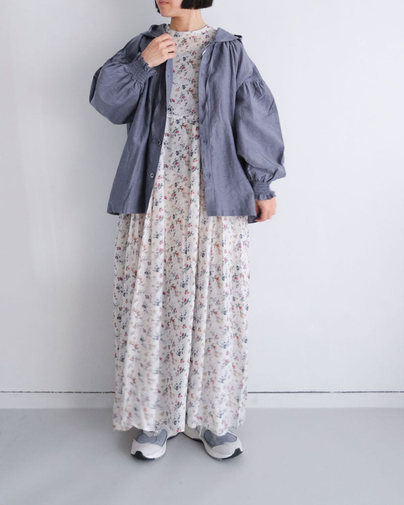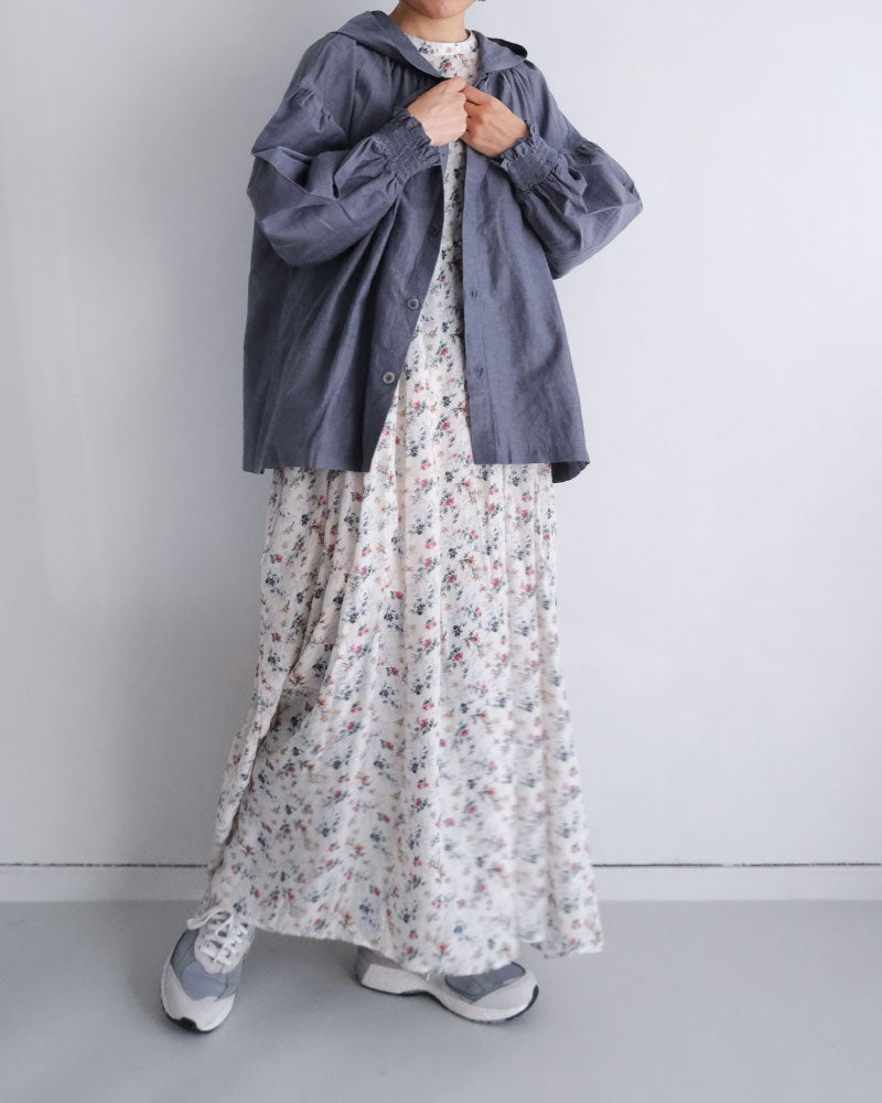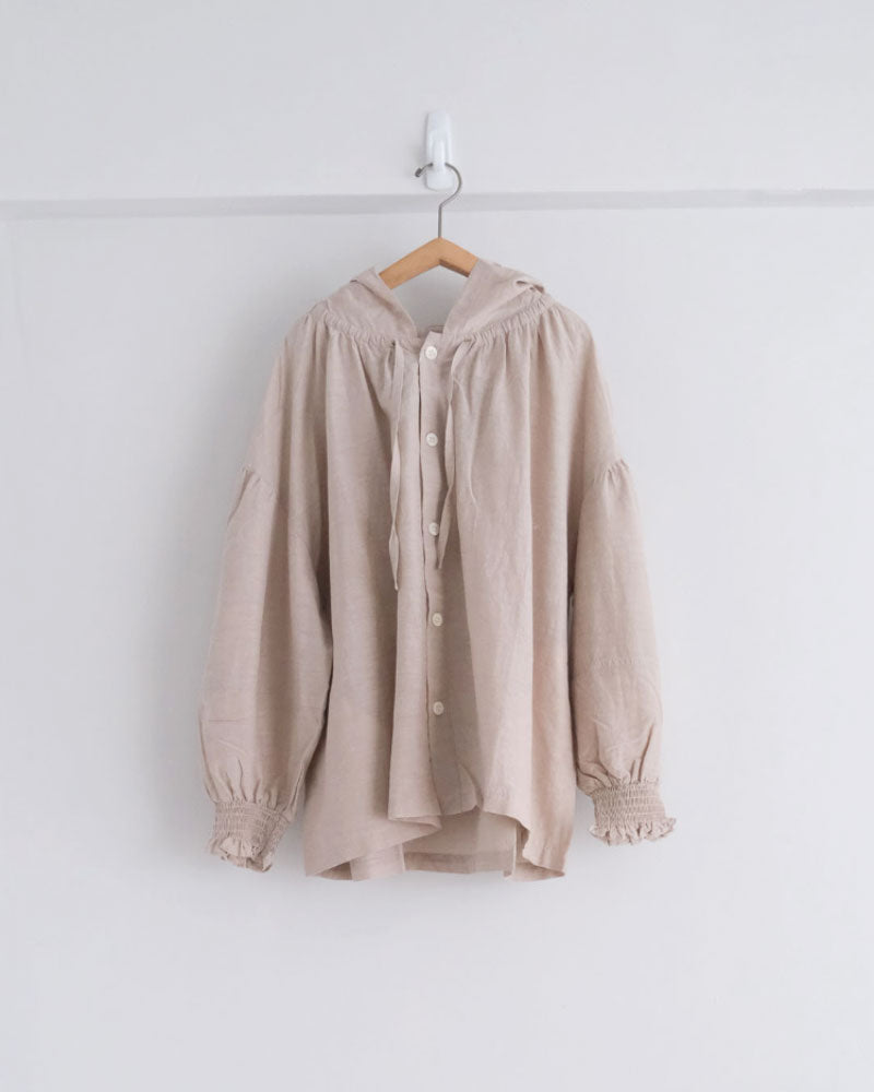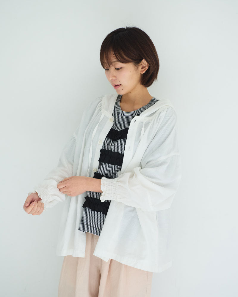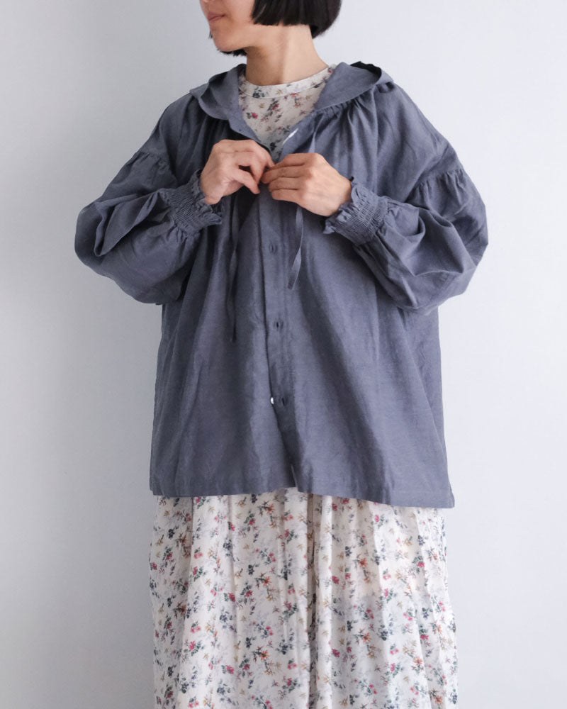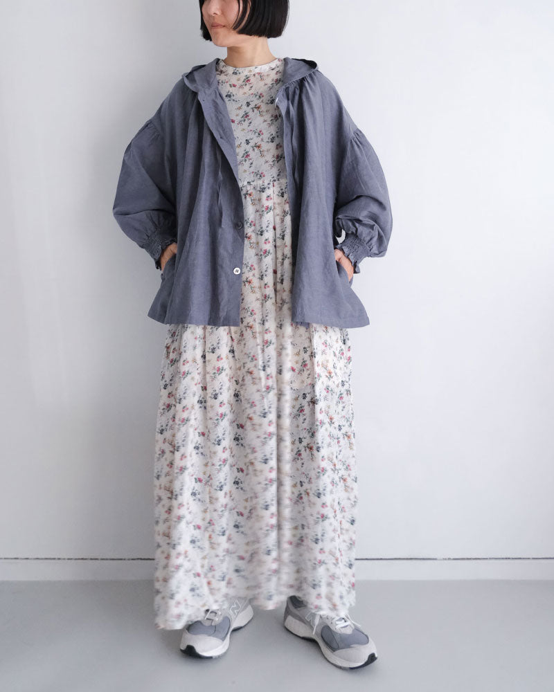 オリジナルのコットンキュプラリネン素材を使用した、軽やかな着心地のフード付き羽織アイテム。経糸にキュプラ、緯糸に綿麻を用いて織り上げた平織り生地に、トリプルワッシャー加工を施した新素材です。