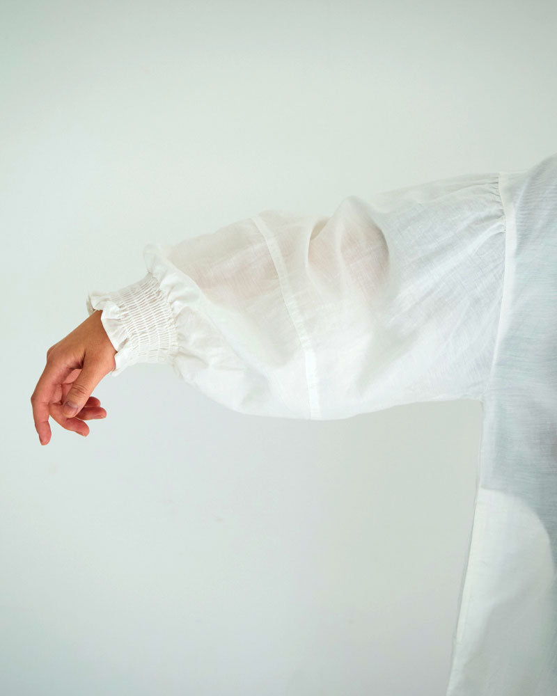 袖口はシャーリング仕様で、袖丈のアレンジが可能。