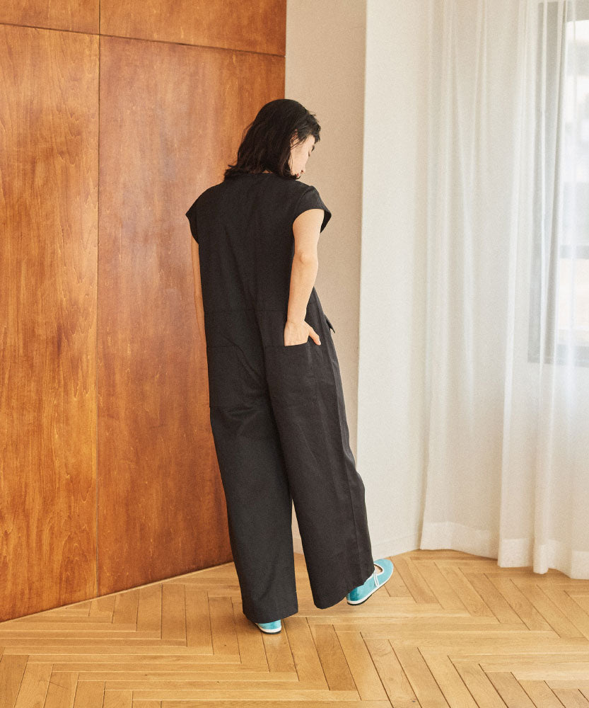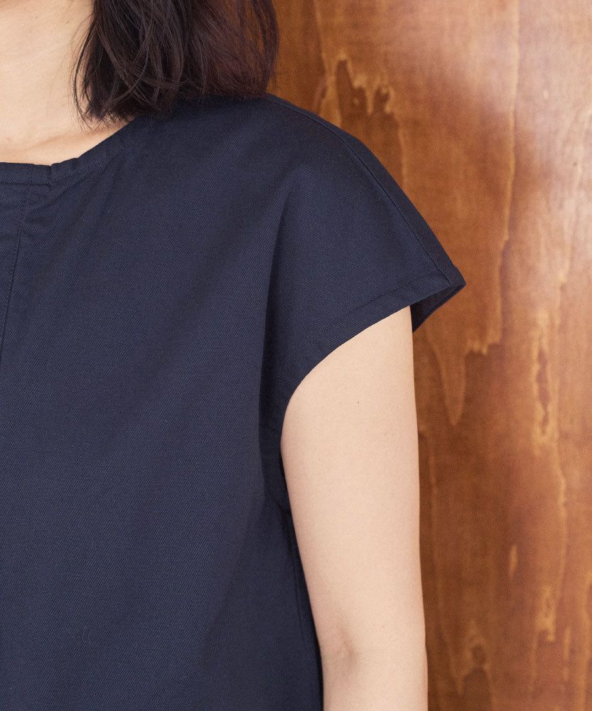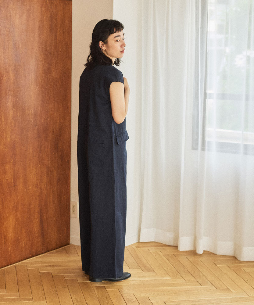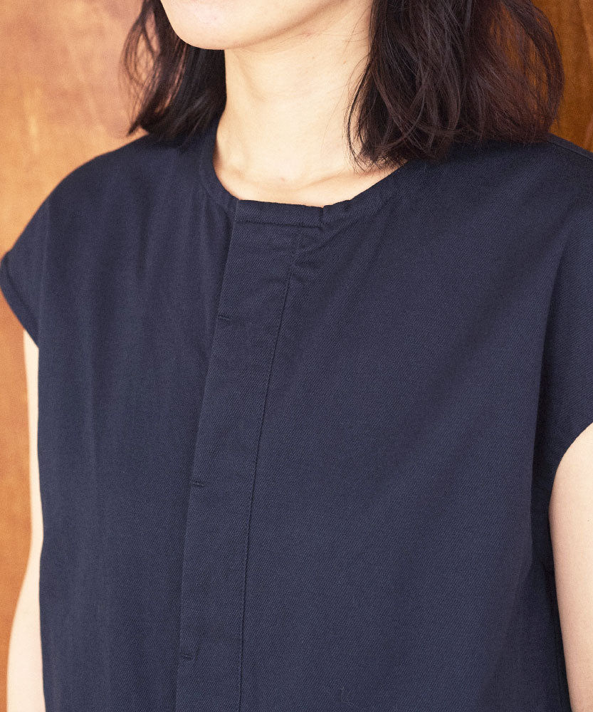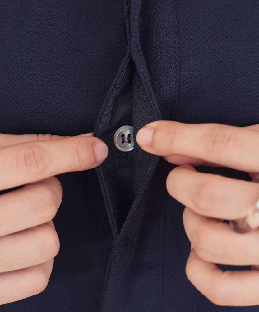 比翼仕立てでフロントはすっきりとした印象に仕上げ、 洗練されたミニマルデザインが魅力の一つです。 夏に一枚で様になるのはもちろん、 インナーとレイヤードしたりジャケットをコーディネートすれば秋までお楽しみいただけます。