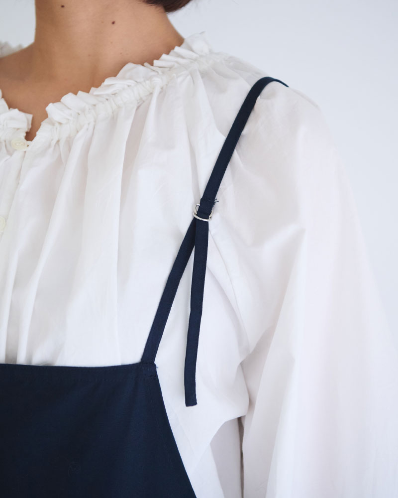 肩紐は長さ調節が可能で、幅広い身長の方に対応。サイドのボタンはデザインのアクセントになりつつ、着脱しやすい実用性も兼ね備えています。オールシーズン活躍し、コーディネートの幅が広がる、ワードローブに加えておきたい一着です。