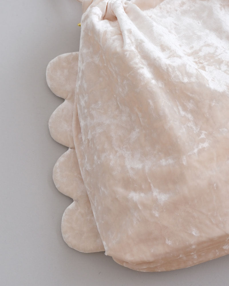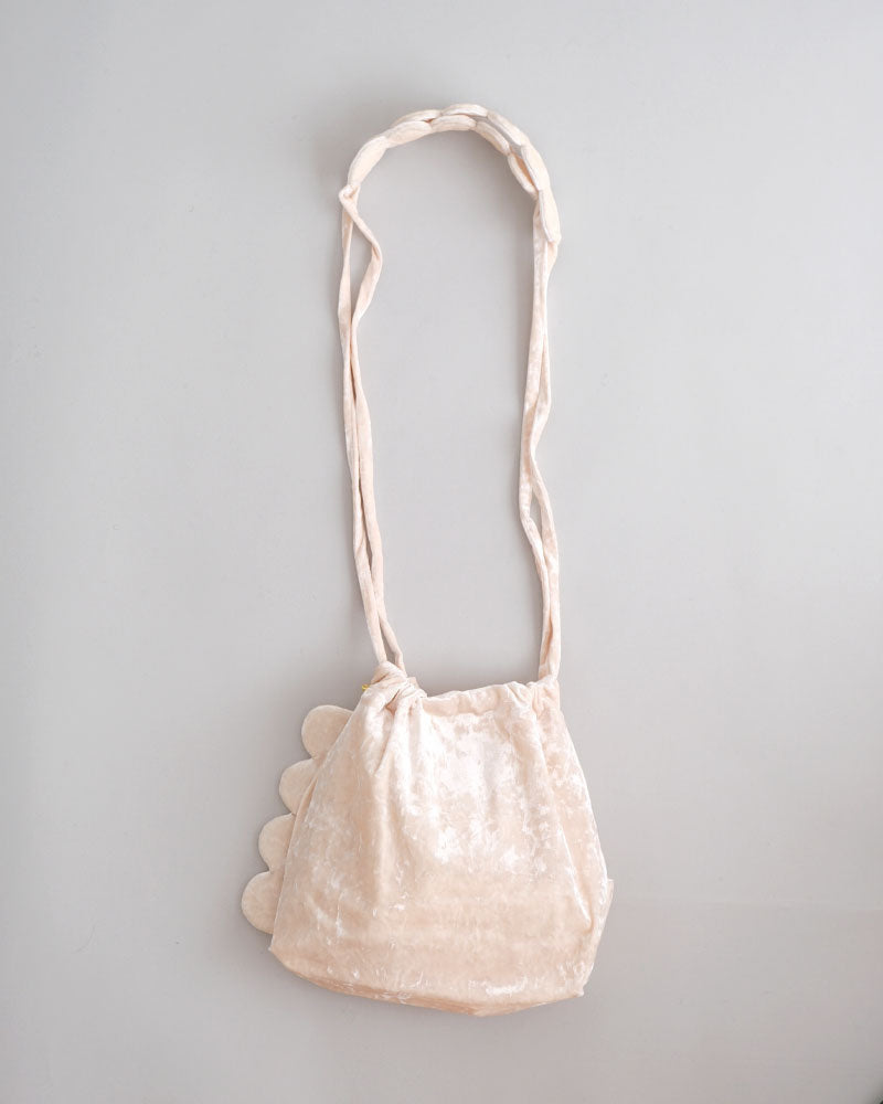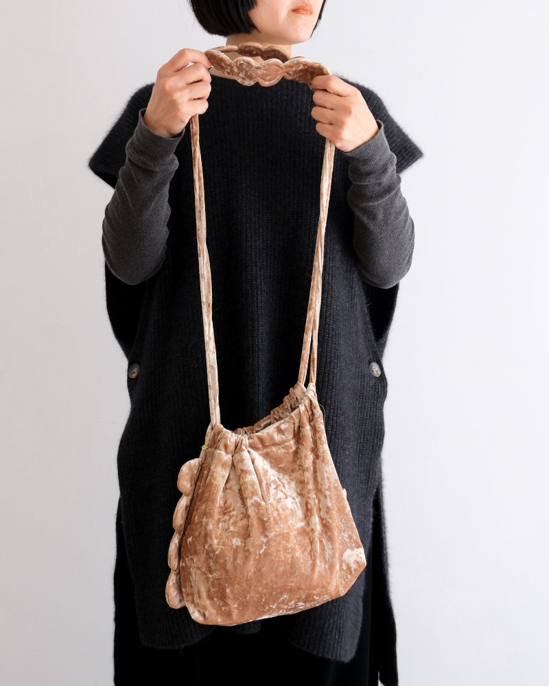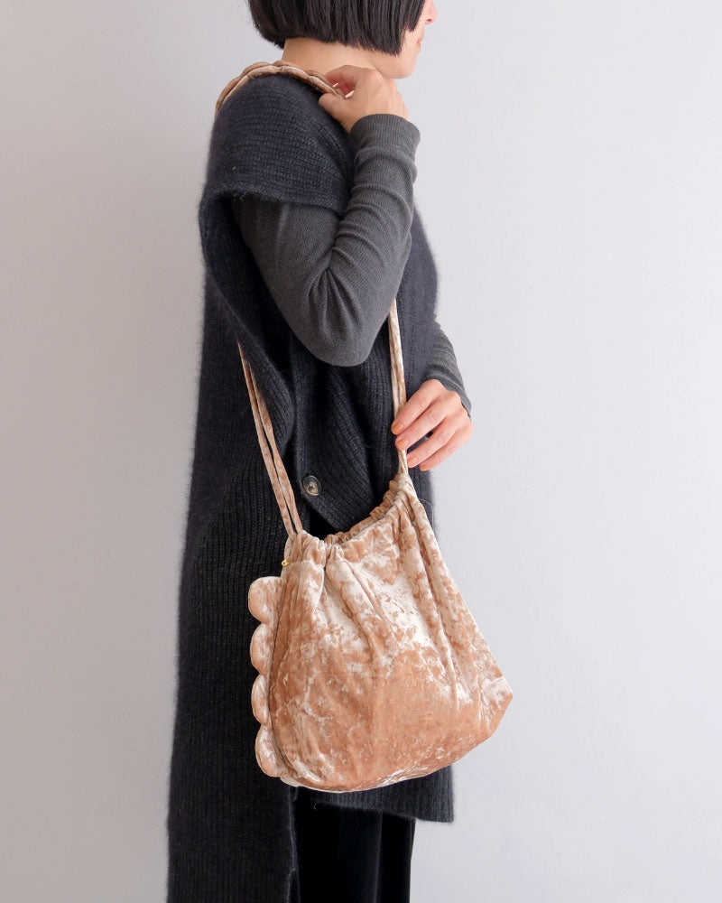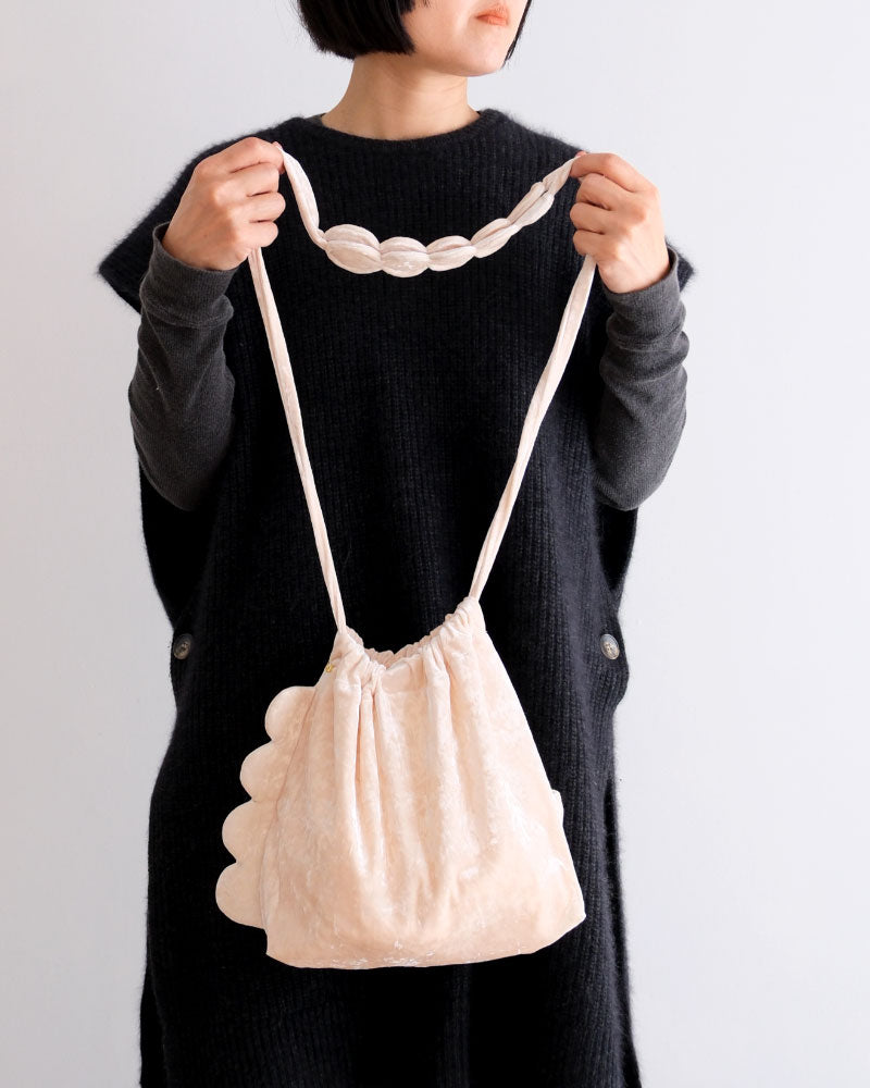 バッグのサイドと、肩の部分についたスカラップのモチーフがポイント。ストレッチの効いた素材のため、斜めがしやすくたくさんものが入ります。