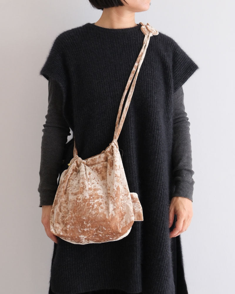 お財布とポーチ、携帯、ハンカチ、小さめのペットボトルやマイボトルなどがちょうど入るサイズ感です。ぎゅっと絞って、斜めがけにしたり、肩からかけたりその日の装いに合わせてお使いいただけます。