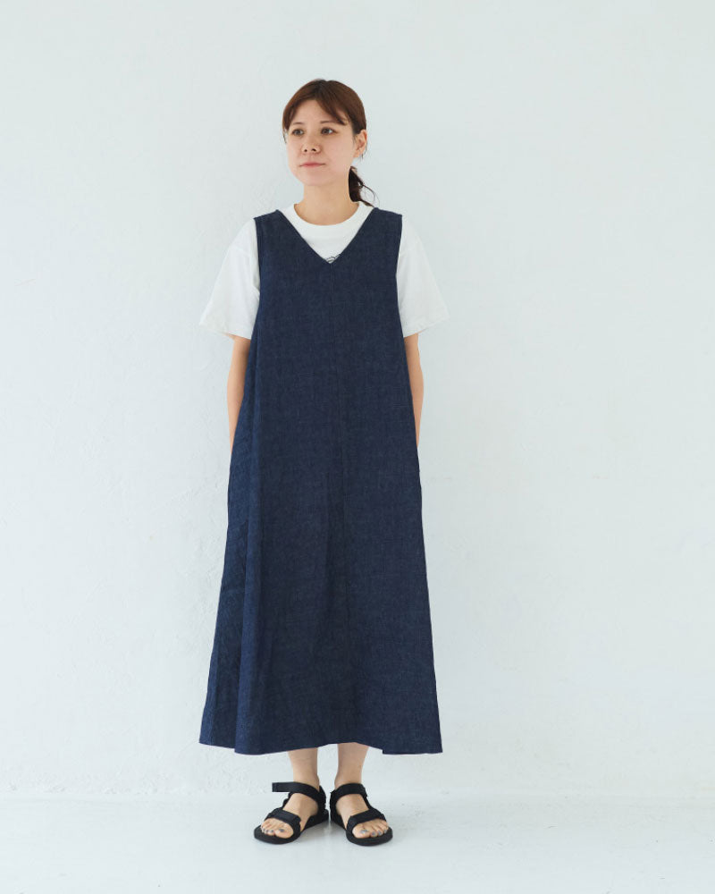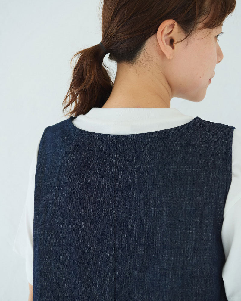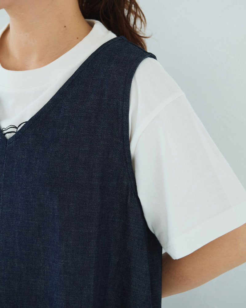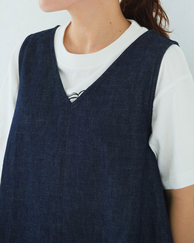浅めのVネック。アームホールも程よく広く、下に半袖や長袖のカットソーを重ねやすいデザインです。裾に向かって綺麗に広がるフレアシルエットです。8オンスのデニムなので、ごわつかず綺麗な形が表現されます。透け感を気にせず楽に着られるのも嬉しいです。
