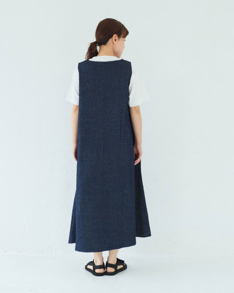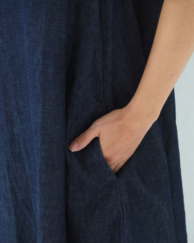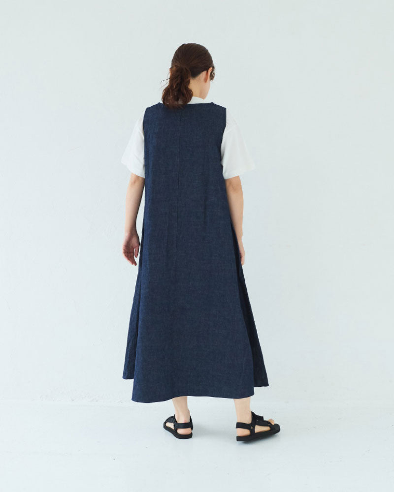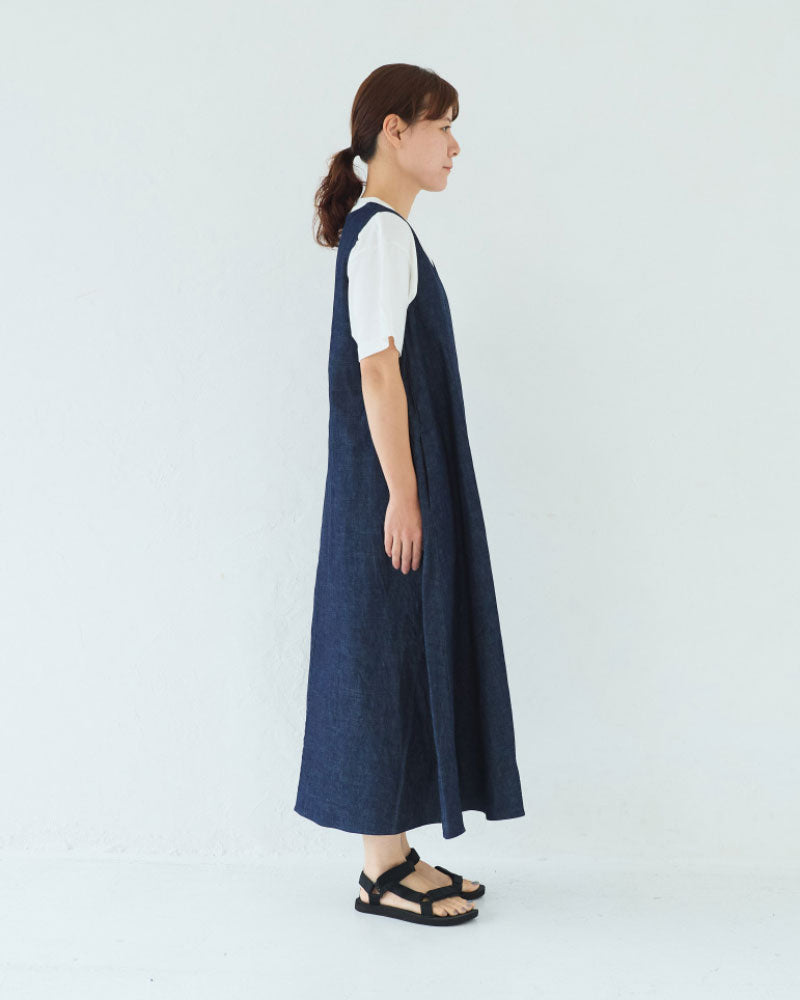 浅めのVネック。アームホールも程よく広く、下に半袖や長袖のカットソーを重ねやすいデザインです。裾に向かって綺麗に広がるフレアシルエットです。8オンスのデニムなので、ごわつかず綺麗な形が表現されます。透け感を気にせず楽に着られるのも嬉しいです。