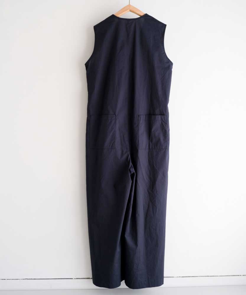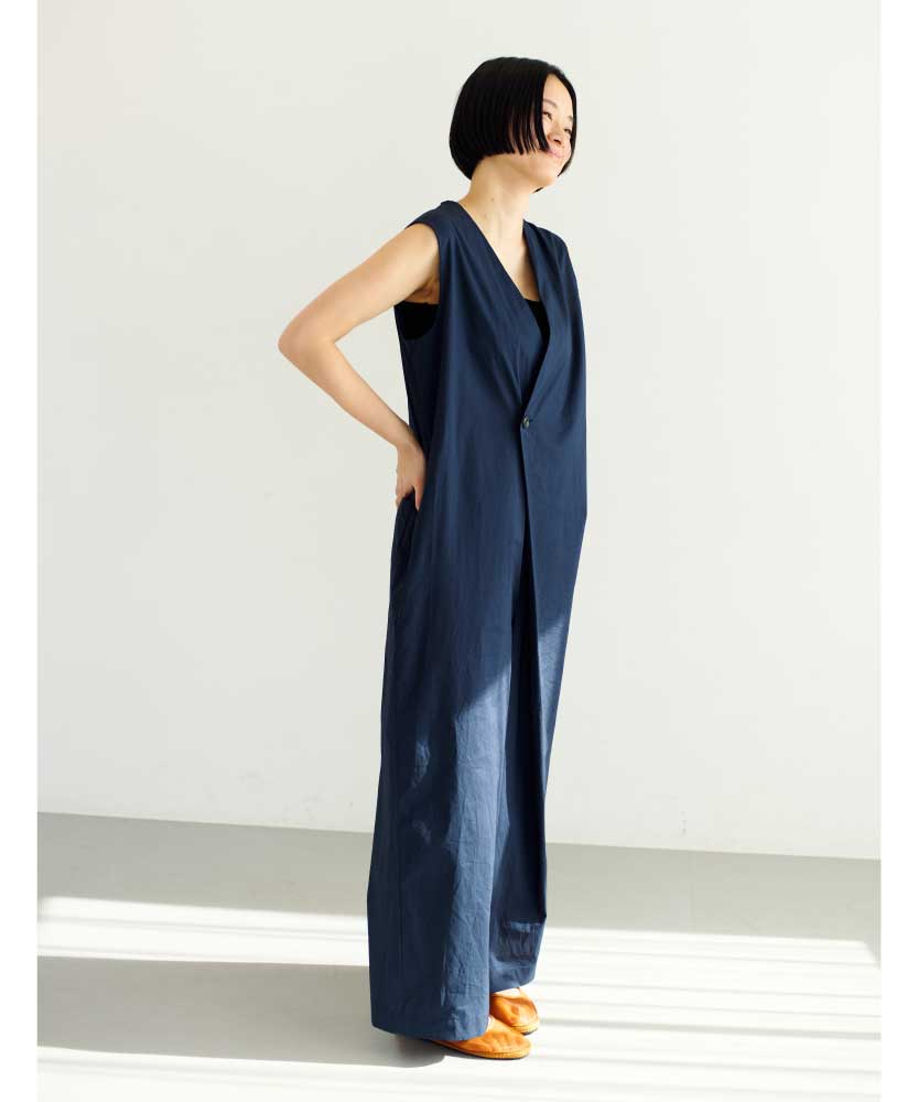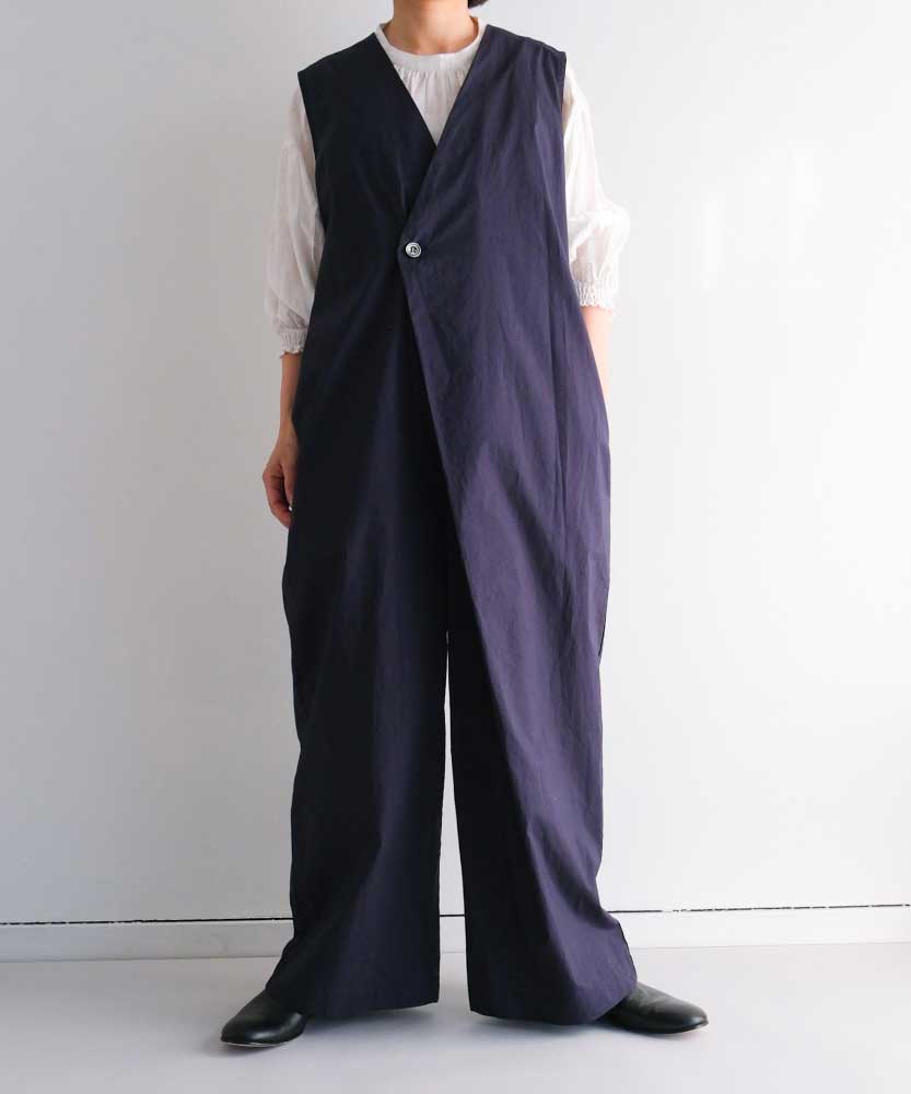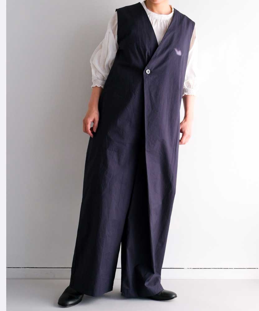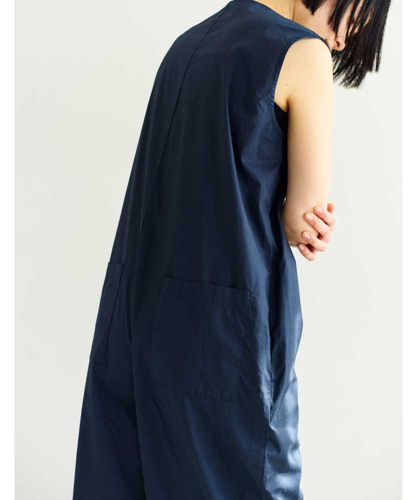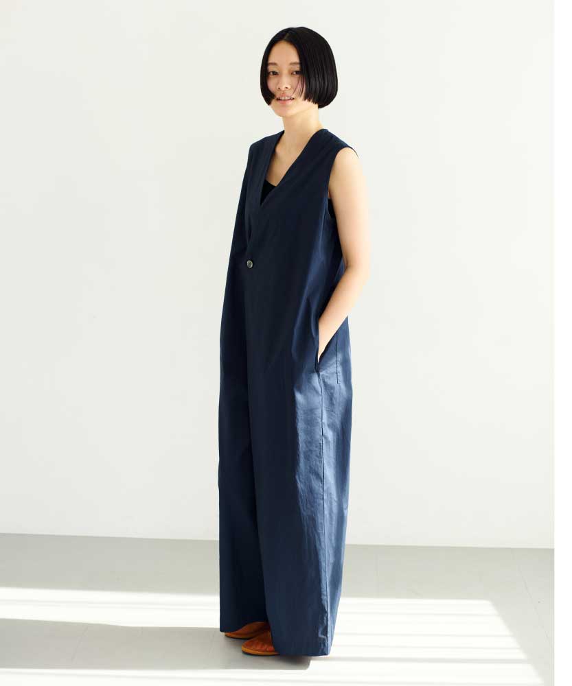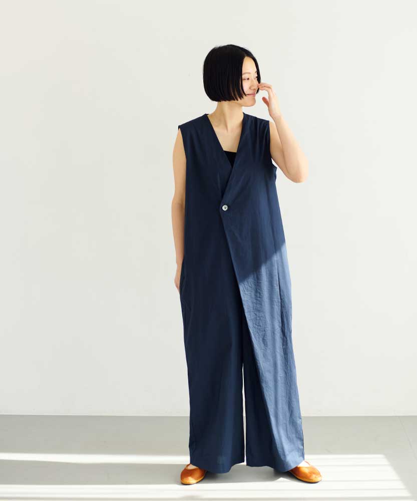 シルキーな手触りのオリジナルタイプライターを使用したオールインワン。フロント部分をボタンで留めるデザインです。内側にファスナーがついていて、楽に着脱することができます。ゆったりとしたサイズ感ですが、ボタン部分がアクセントになり、スッキリとした印象で着用いただけます。ノースリーブはもちろん、中にTシャツやブラウスを合わせたりして、様々な着こなしを楽しんでいただけます。
