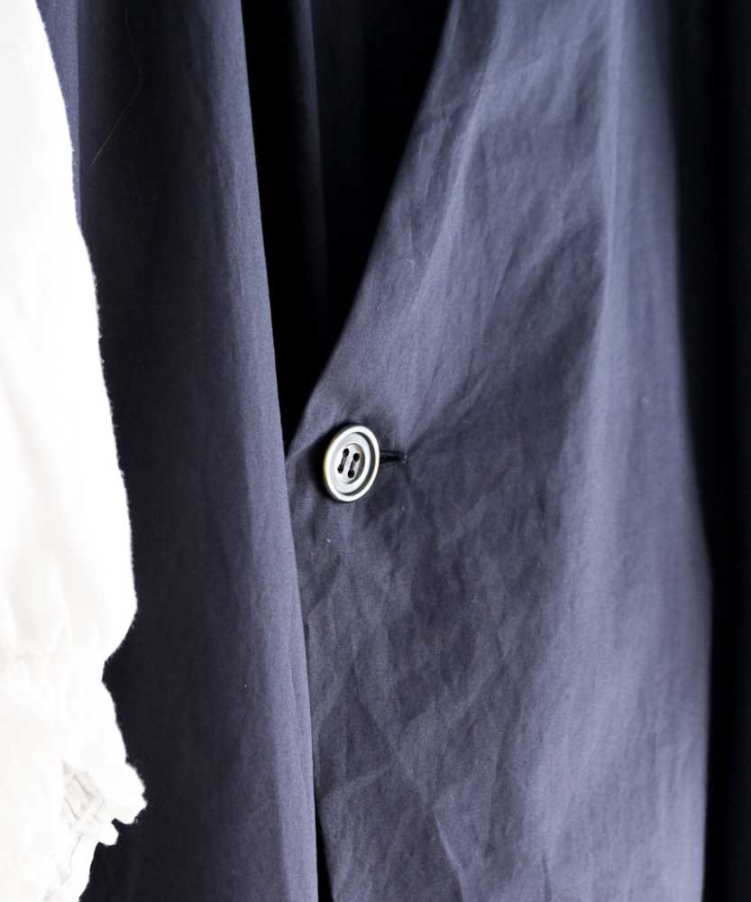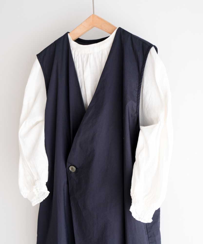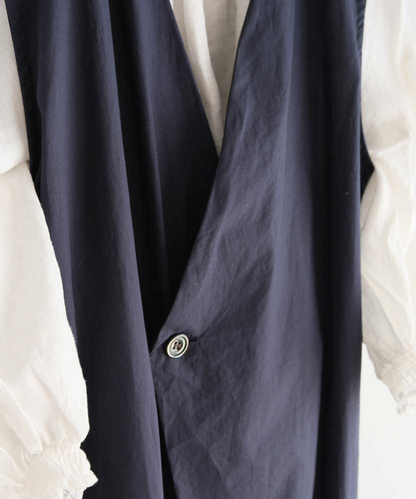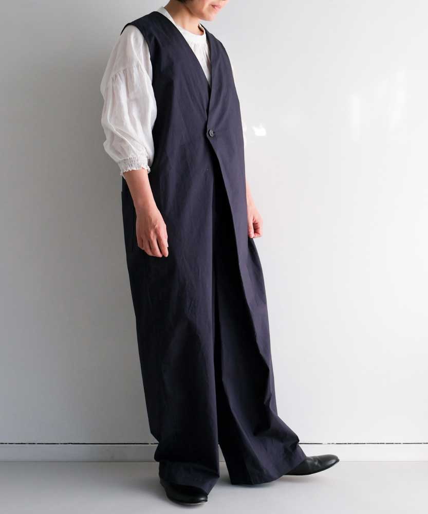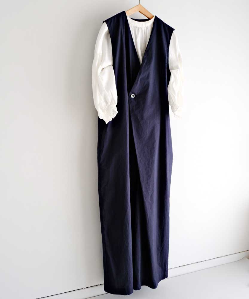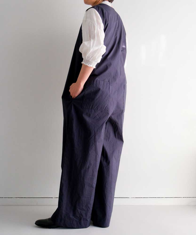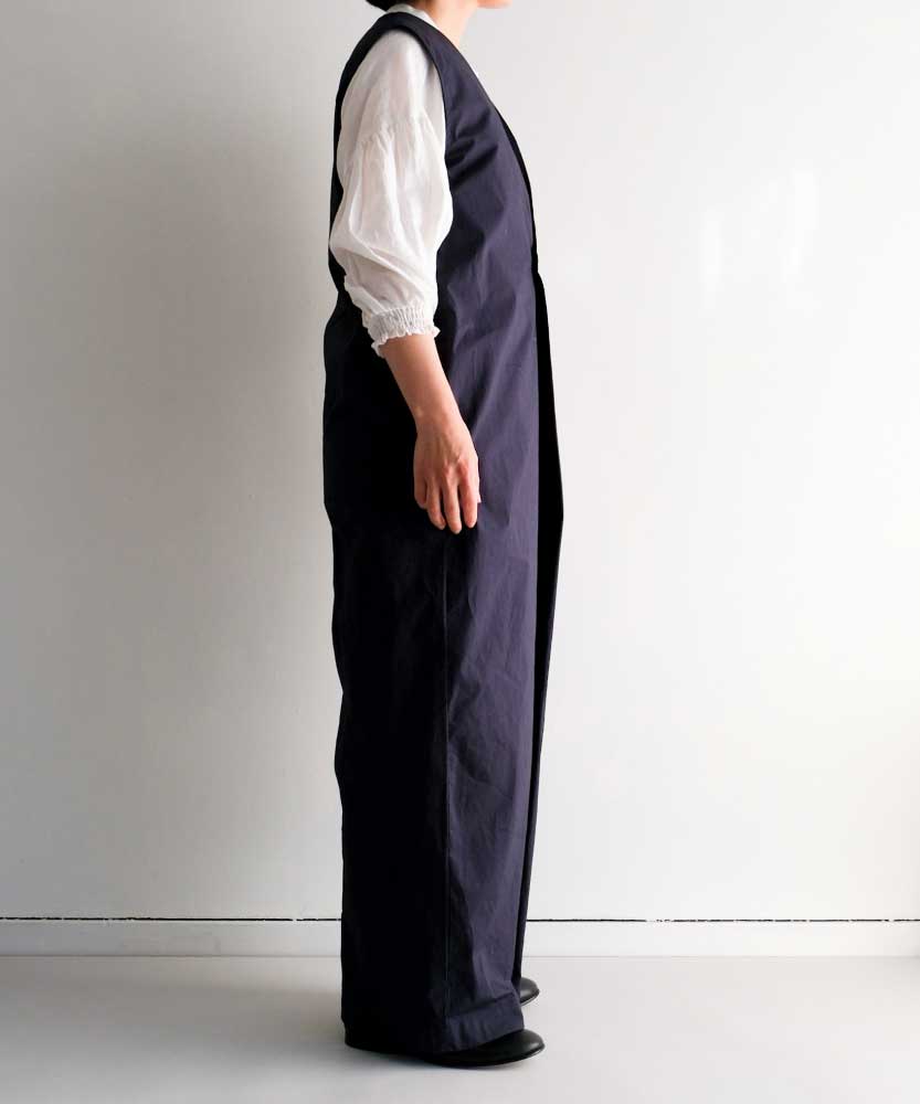 シルキーな手触りのオリジナルタイプライターを使用したオールインワン。フロント部分をボタンで留めるデザインです。内側にファスナーがついていて、楽に着脱することができます。ゆったりとしたサイズ感ですが、ボタン部分がアクセントになり、スッキリとした印象で着用いただけます。ノースリーブはもちろん、中にTシャツやブラウスを合わせたりして、様々な着こなしを楽しんでいただけます。