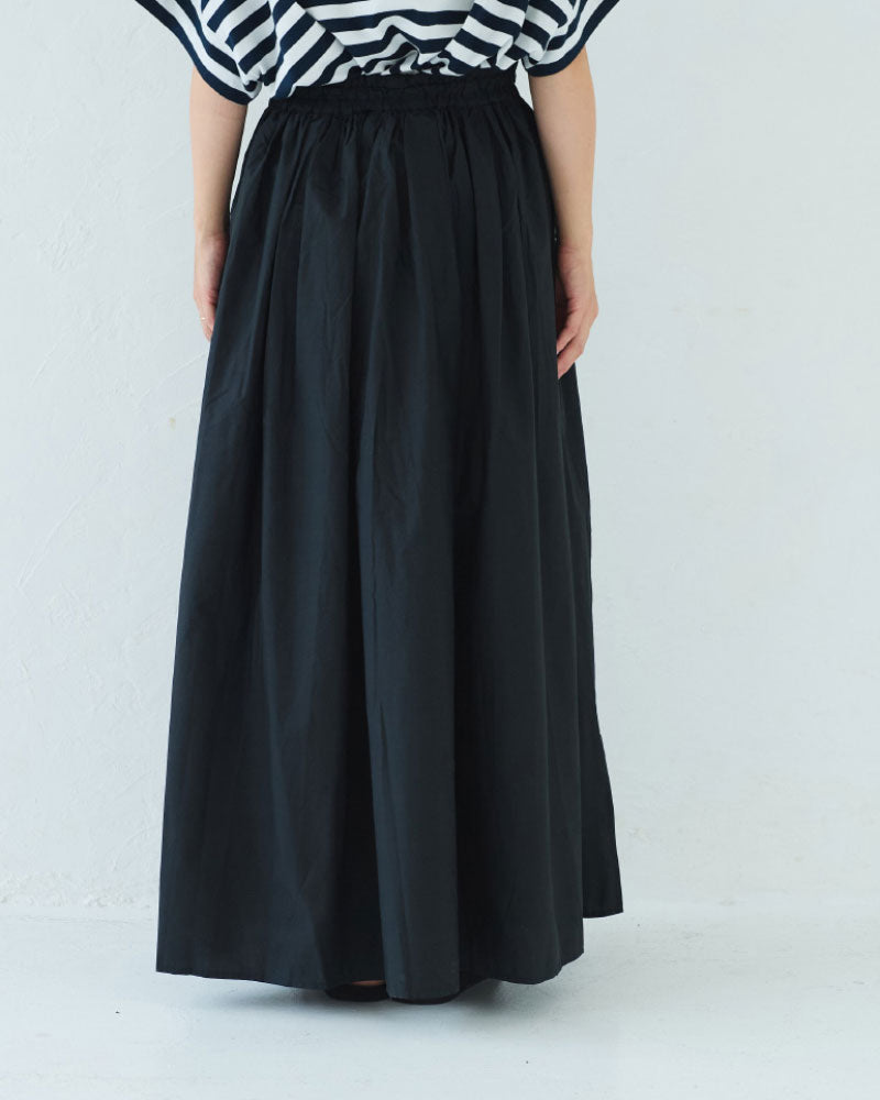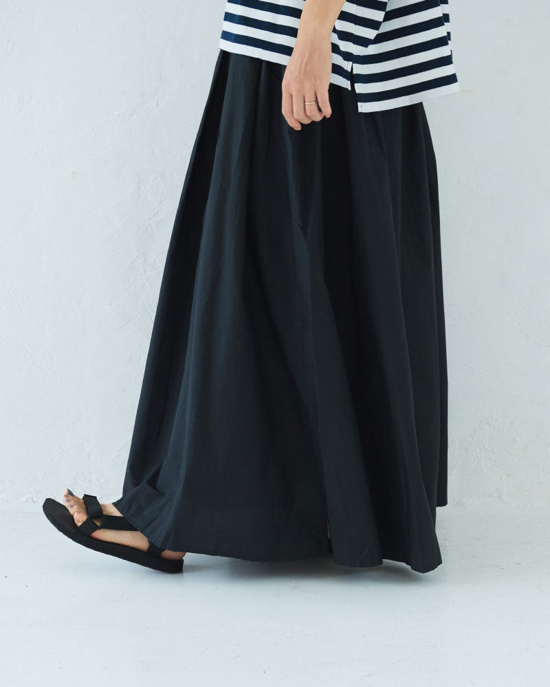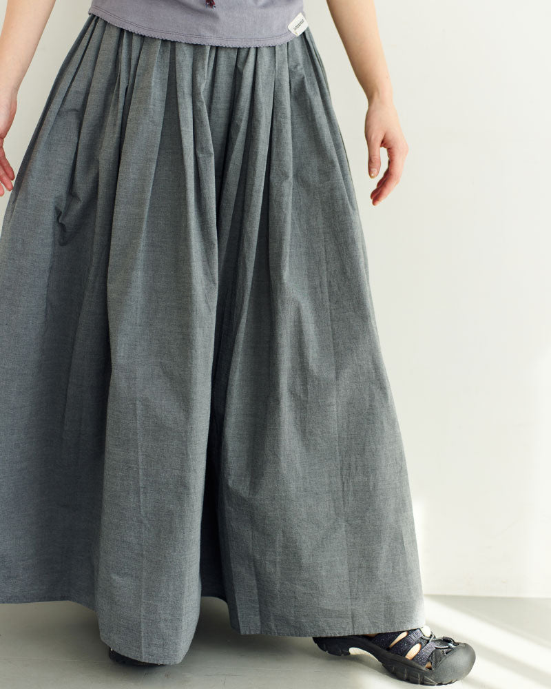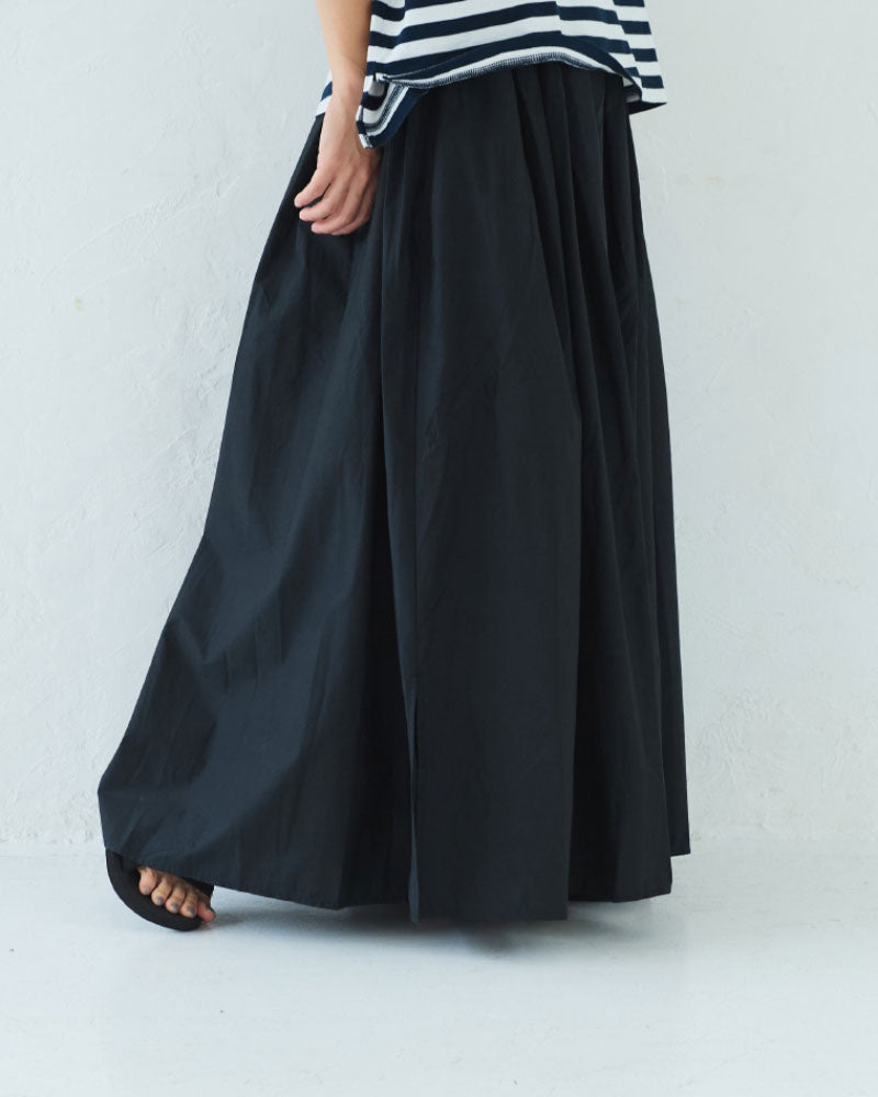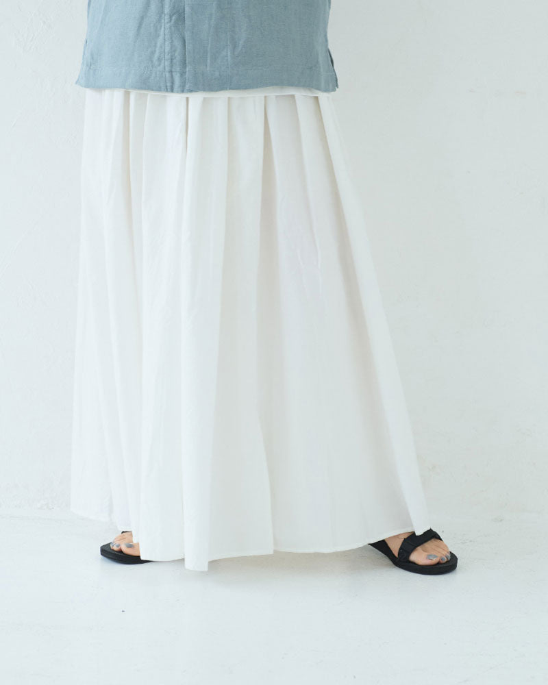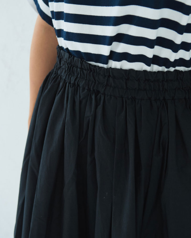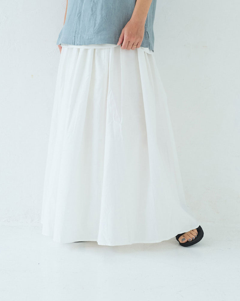 タイプライターを使用したギャザースカート。 細かいギャザーを寄せて作った、自然なボリュームが目を惹きます。ウエストはゴムで、涼しく楽に着ることができるのもポイントです。長めの着丈で、カジュアルなTシャツやサンダルと合わせても落ち着いた雰囲気に纏まります。