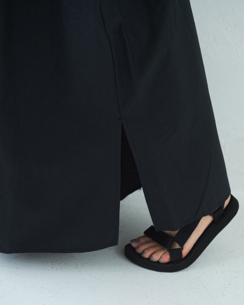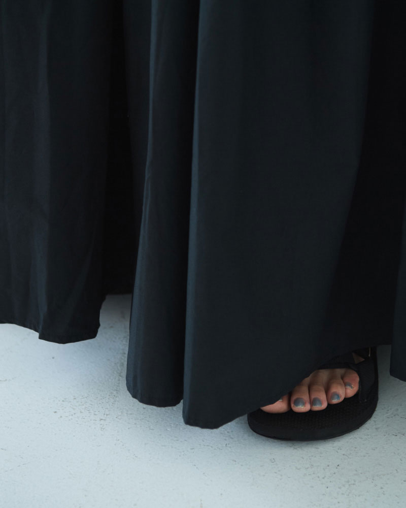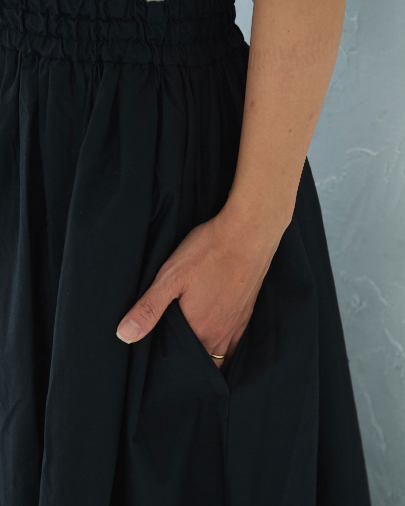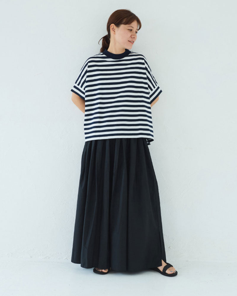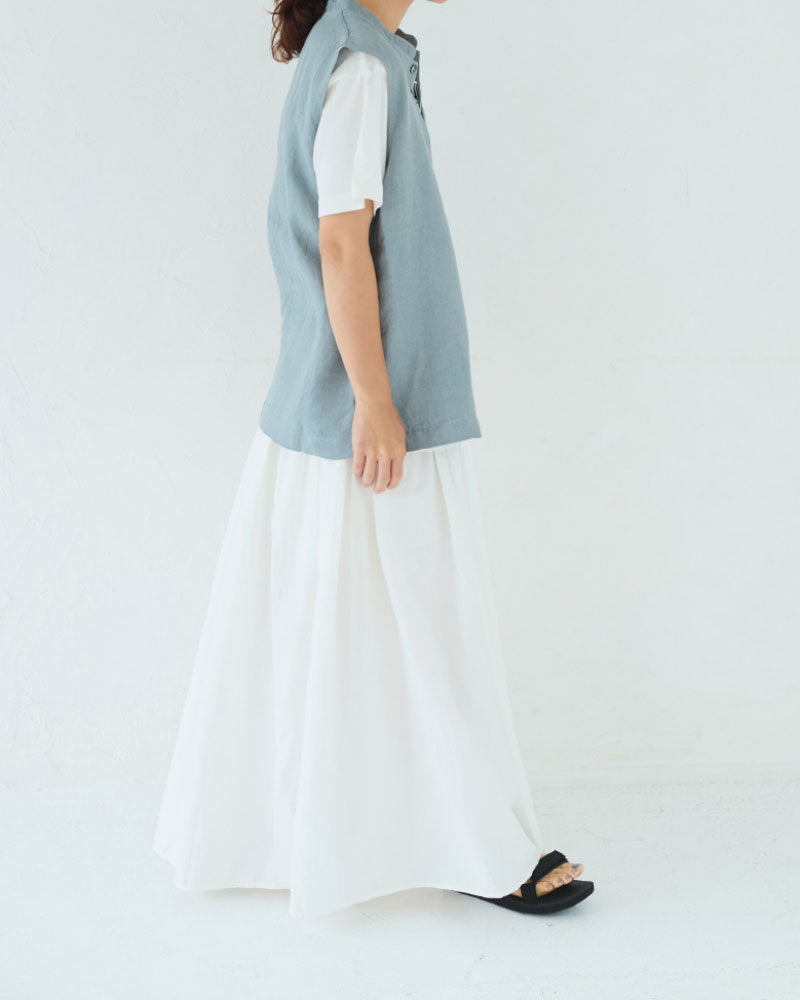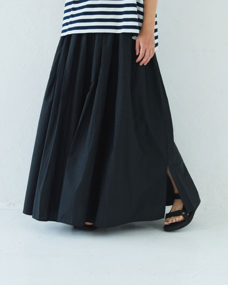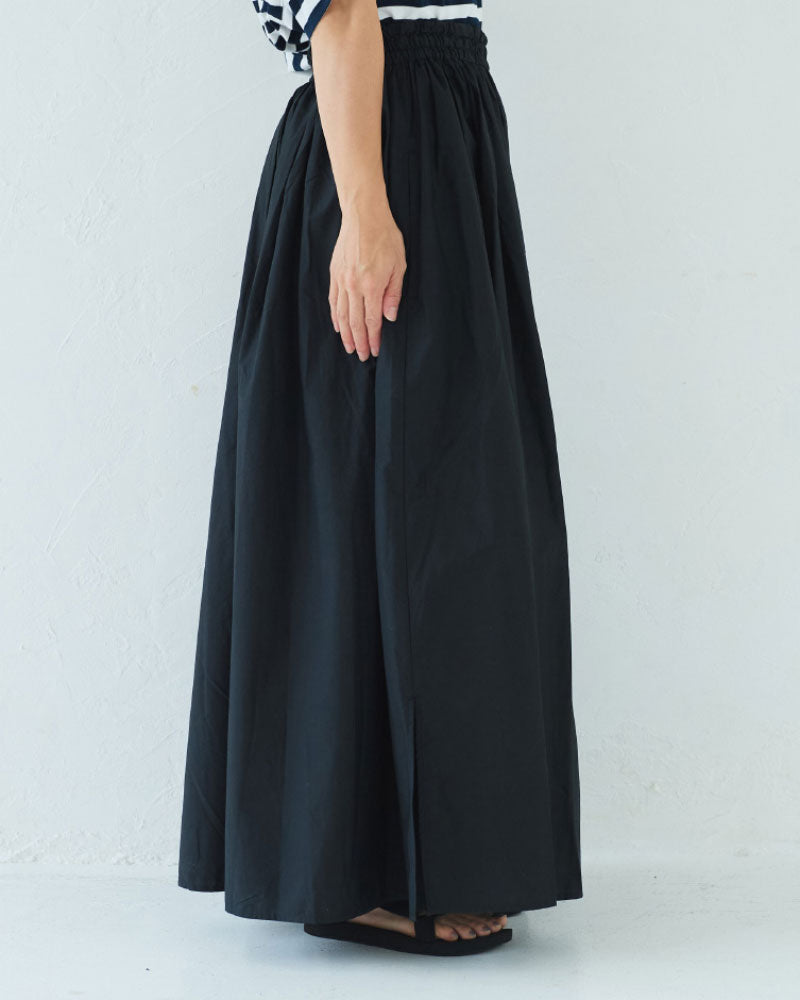 タイプライターを使用したギャザースカート。 細かいギャザーを寄せて作った、自然なボリュームが目を惹きます。ウエストはゴムで、涼しく楽に着ることができるのもポイントです。長めの着丈で、カジュアルなTシャツやサンダルと合わせても落ち着いた雰囲気に纏まります。