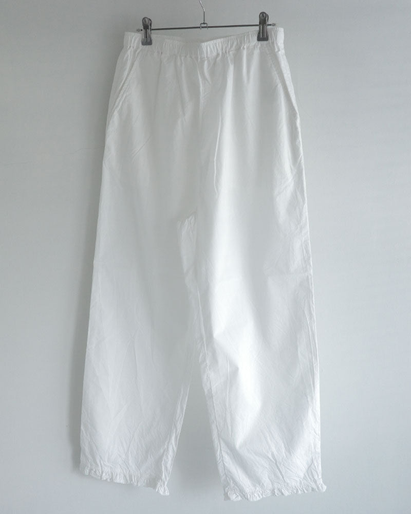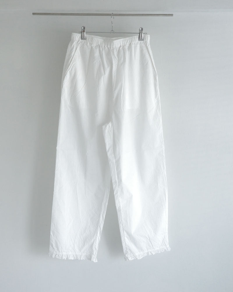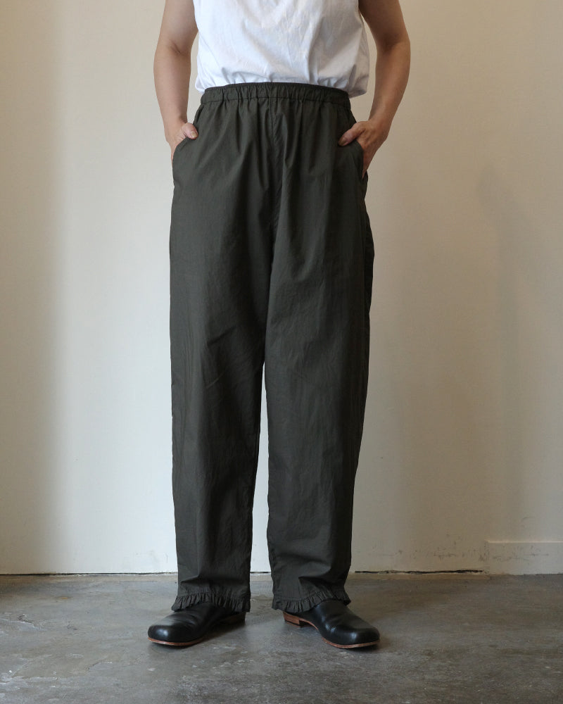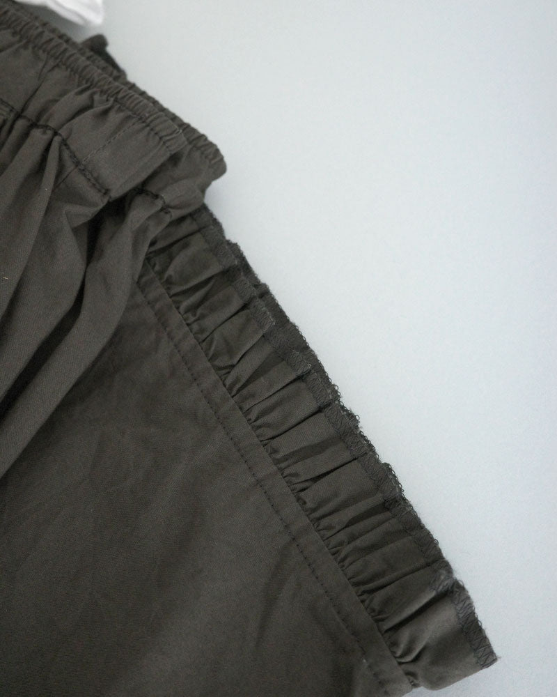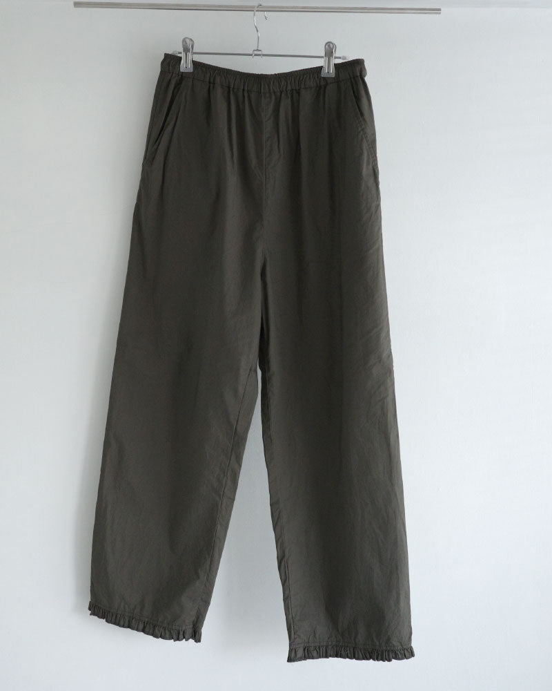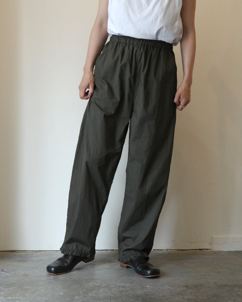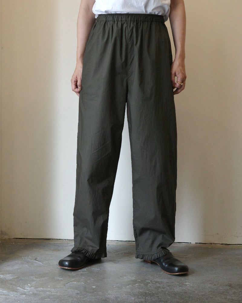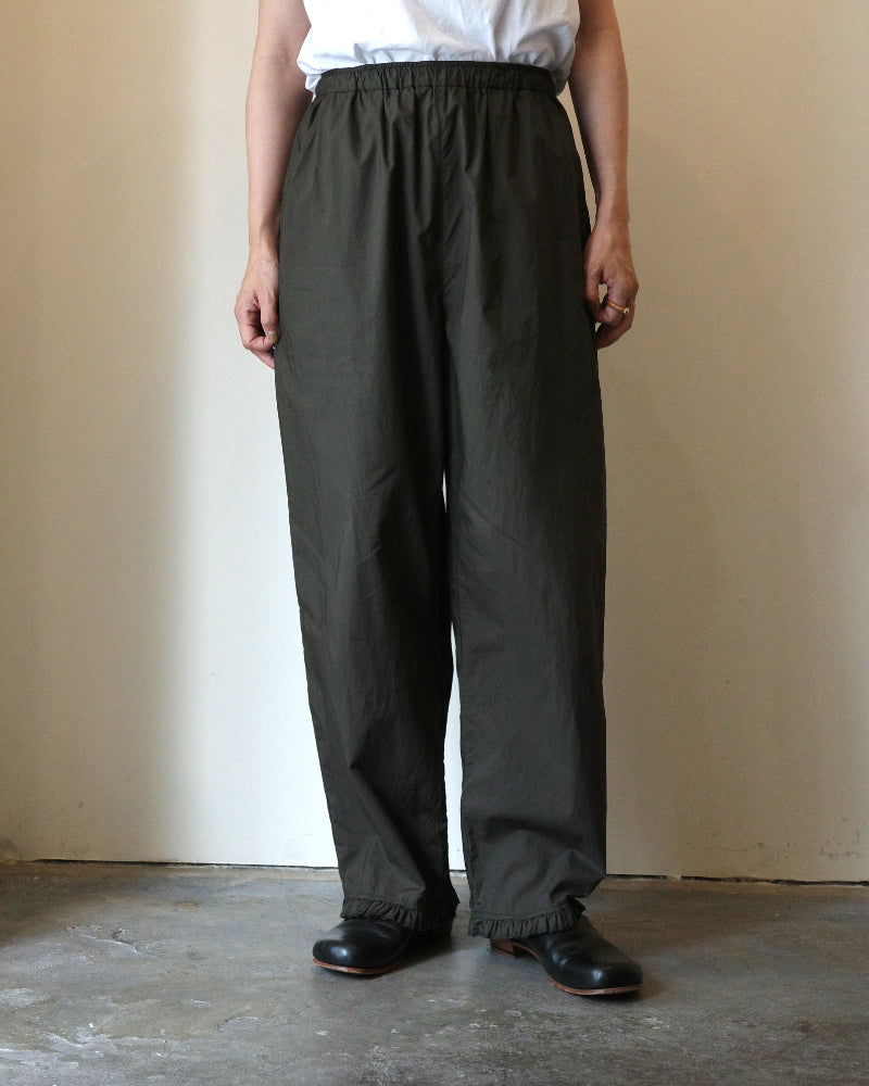 裾に小さめのフリルをあしらったパンツ。軽めのタイプライター素材で、レイヤードにも便利なアイテムです。ストレートシルエットで、レイヤードもしやすく、ちらりと見える裾のフリルが 単調になりがちなコーディネートにアクセントを加えてくれます。軽い素材ですが、ヒップ周りにゆとりがあるので、短め丈のトップスとも合わせやすいです。