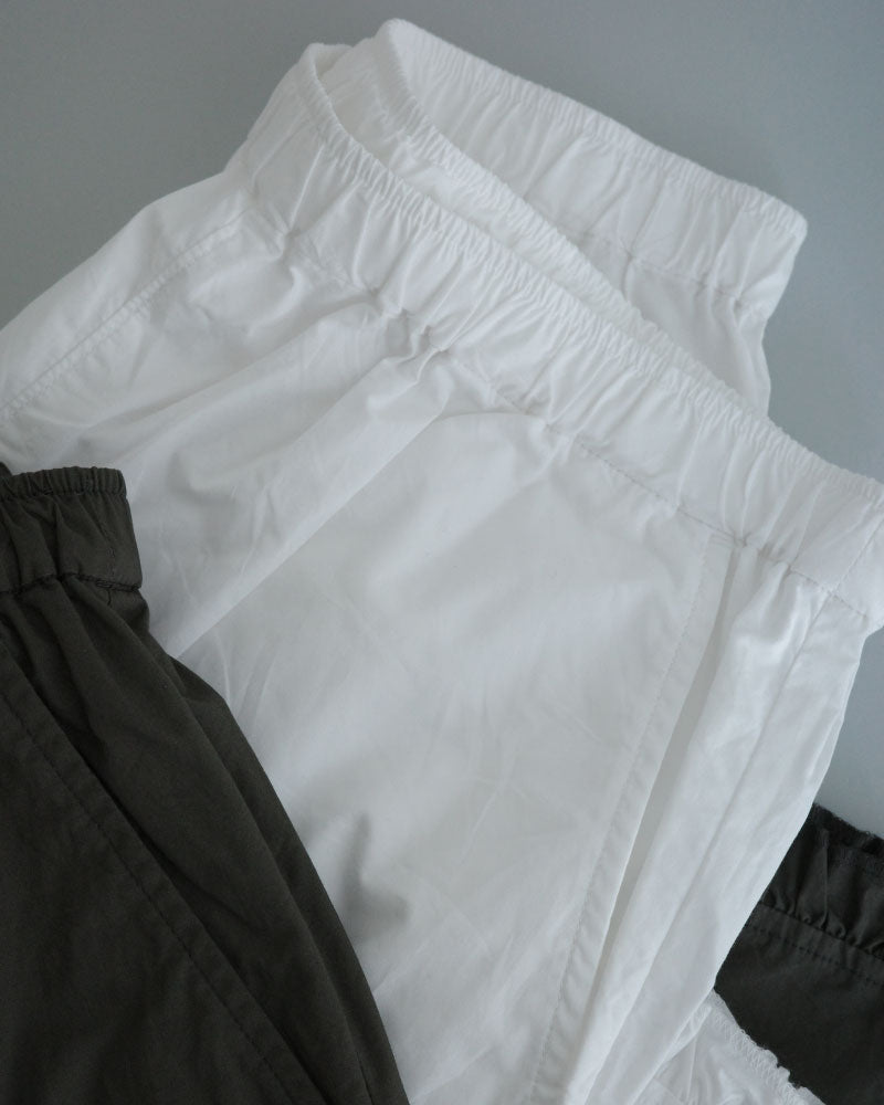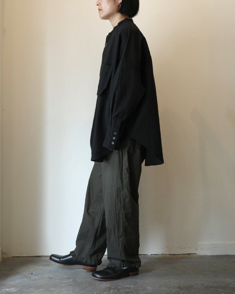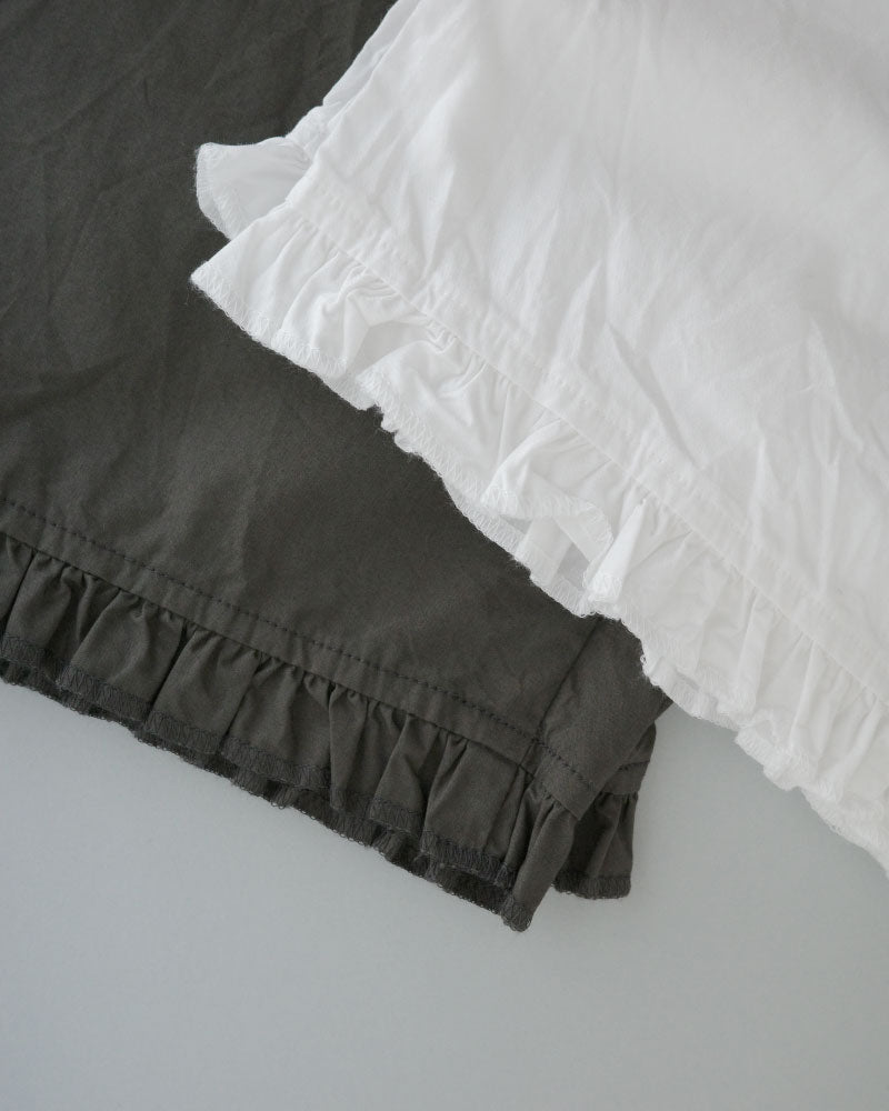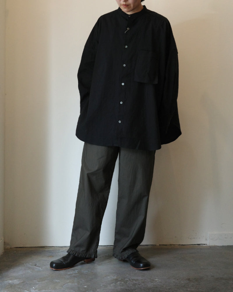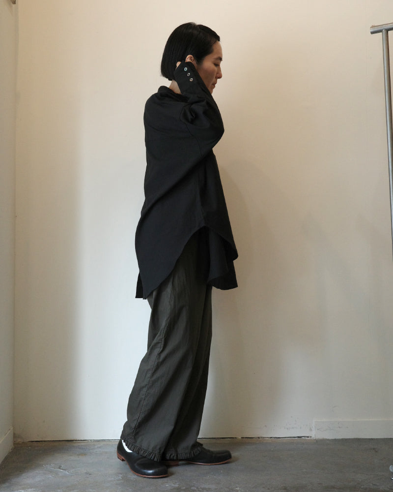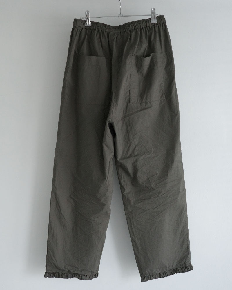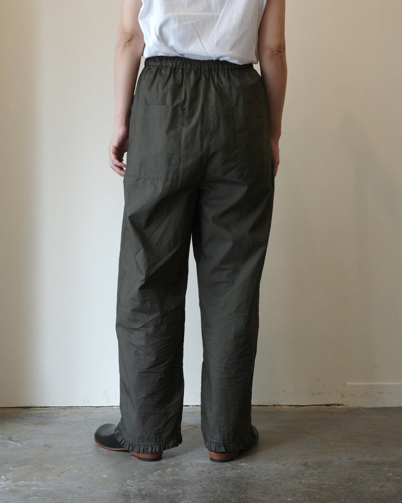 裾に小さめのフリルをあしらったパンツ。軽めのタイプライター素材で、レイヤードにも便利なアイテムです。ストレートシルエットで、レイヤードもしやすく、ちらりと見える裾のフリルが 単調になりがちなコーディネートにアクセントを加えてくれます。軽い素材ですが、ヒップ周りにゆとりがあるので、短め丈のトップスとも合わせやすいです。