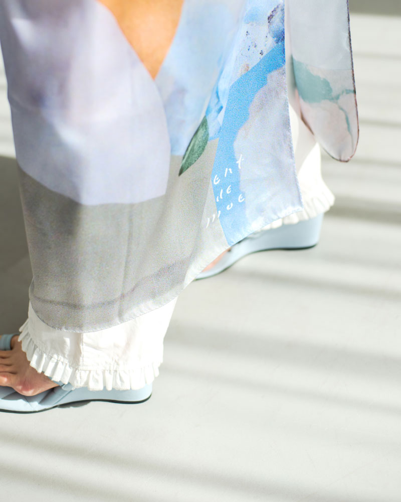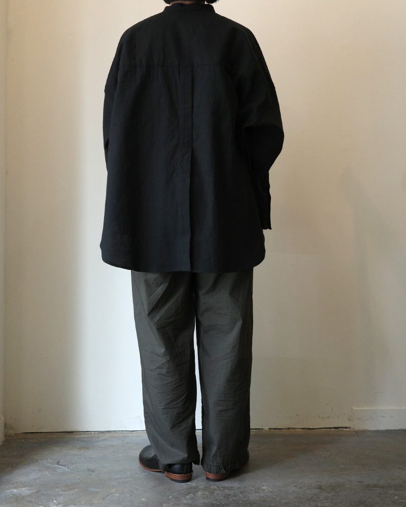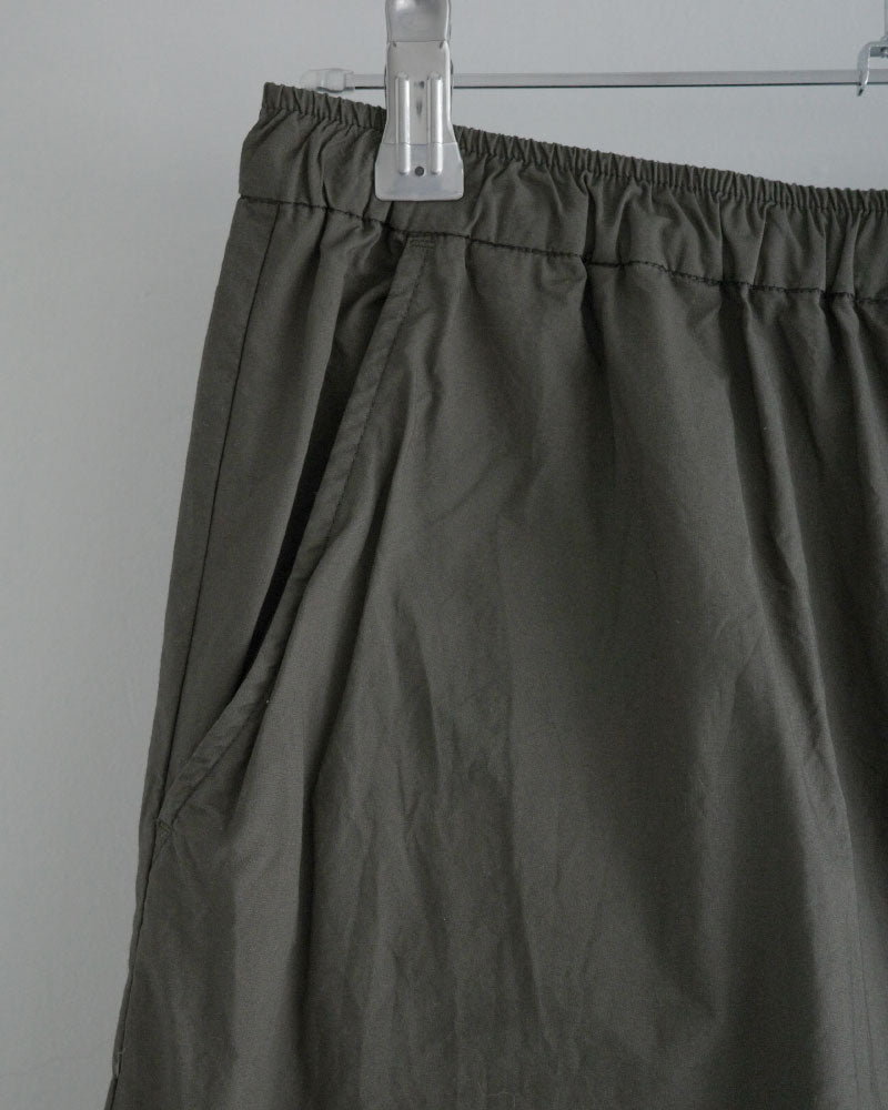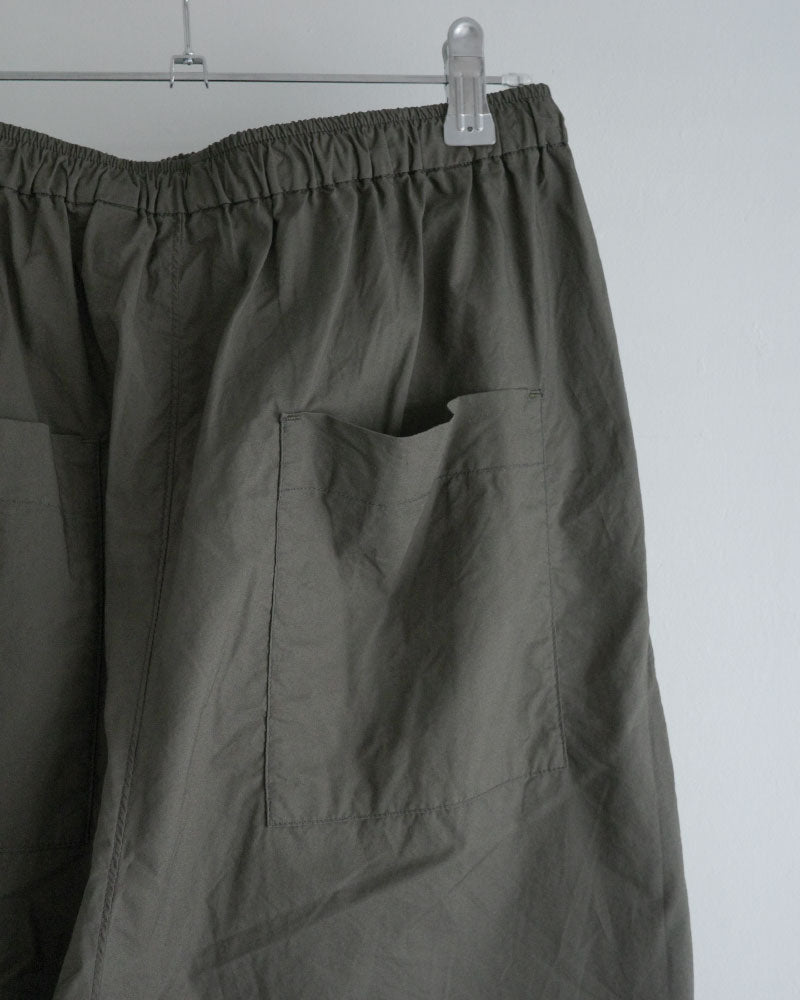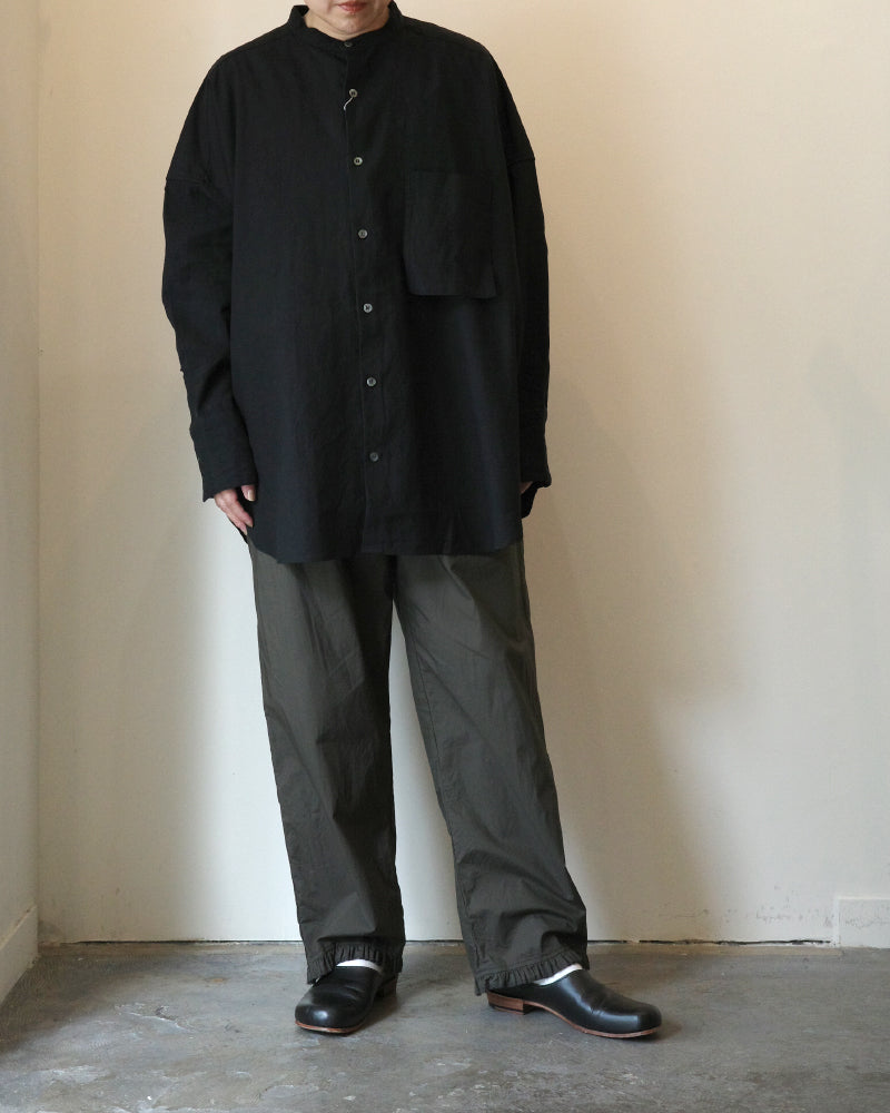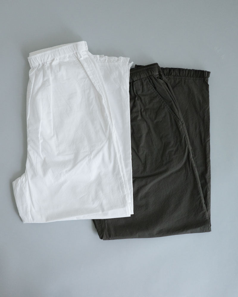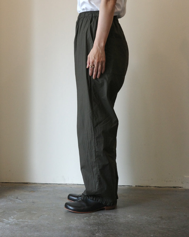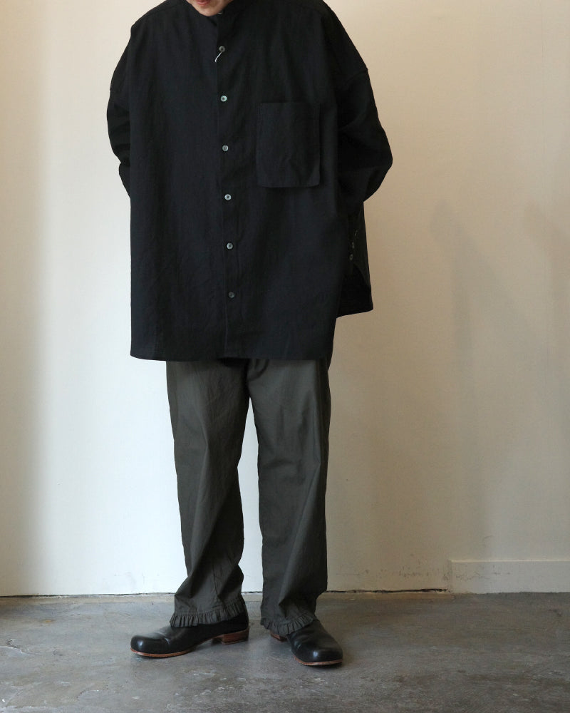 裾に小さめのフリルをあしらったパンツ。軽めのタイプライター素材で、レイヤードにも便利なアイテムです。ストレートシルエットで、レイヤードもしやすく、ちらりと見える裾のフリルが 単調になりがちなコーディネートにアクセントを加えてくれます。軽い素材ですが、ヒップ周りにゆとりがあるので、短め丈のトップスとも合わせやすいです。