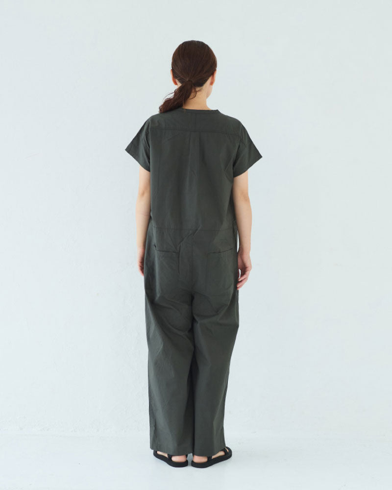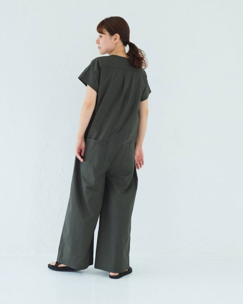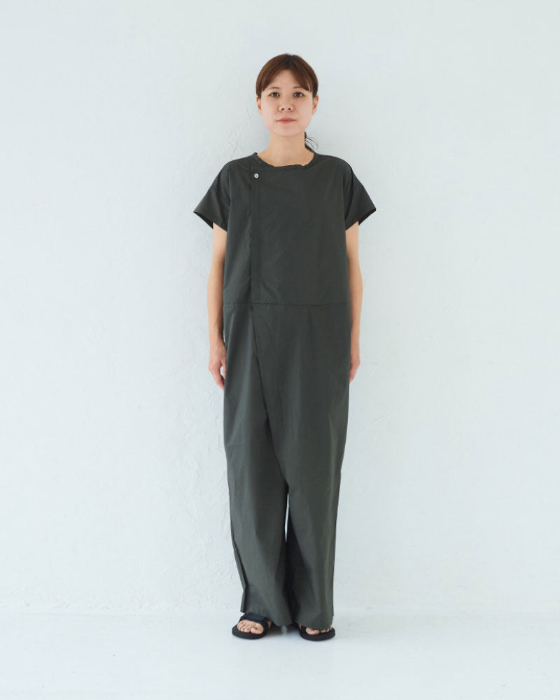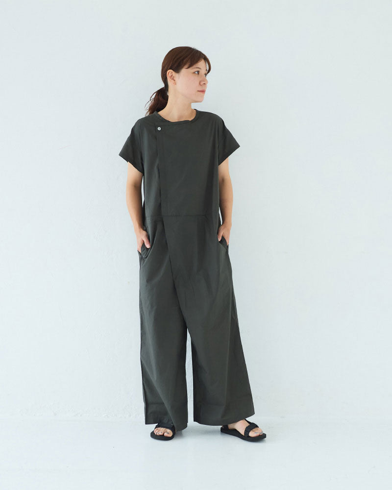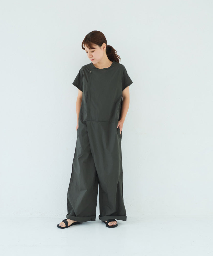 シルキーな手触りのオリジナルタイプライターを使用した半袖のオールインワン。昨年のリバイバルの形です。半袖なので、暑い季節に一枚で楽に着ることができます。ゆったりしたパンツ部分はラップパンツのようなデザインになっていて、涼しいと同時にスタイルもスッキリ見えるのがポイント。