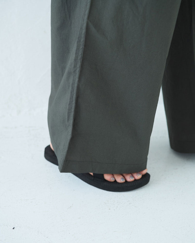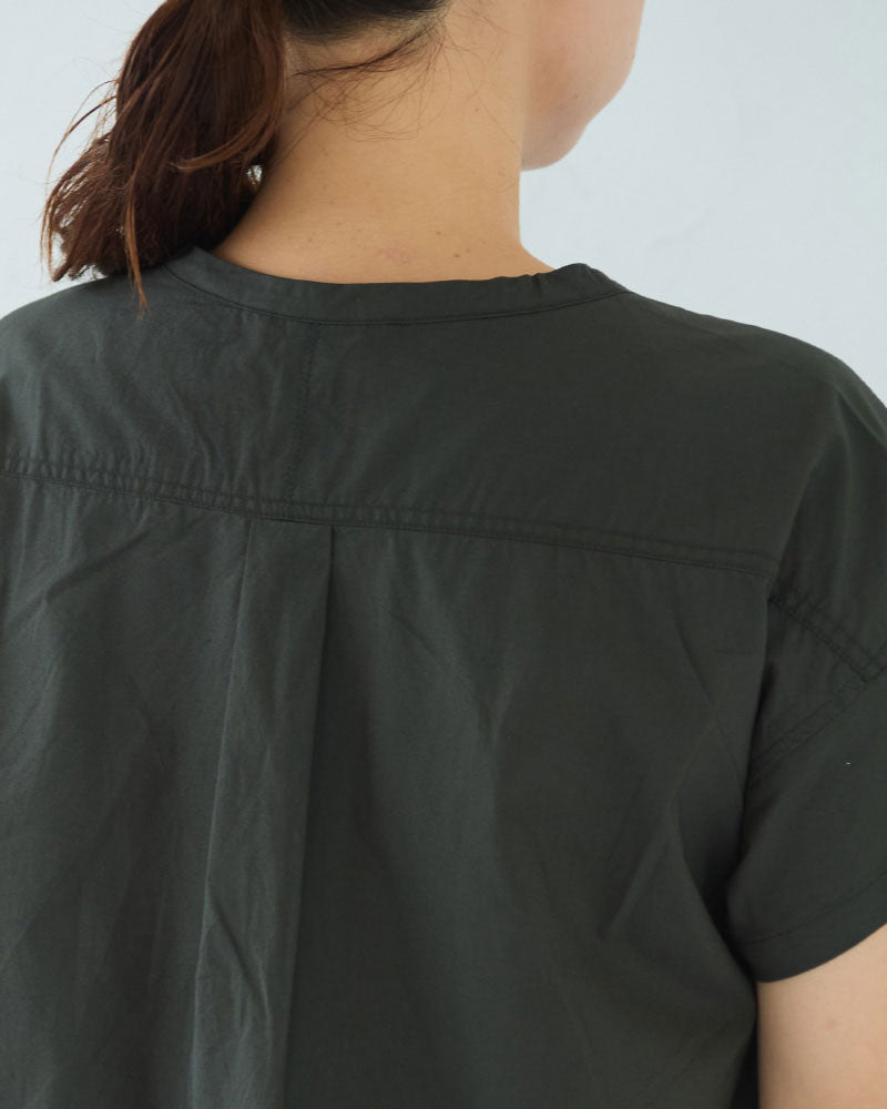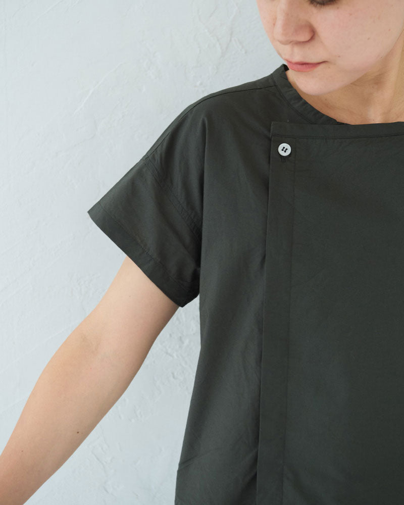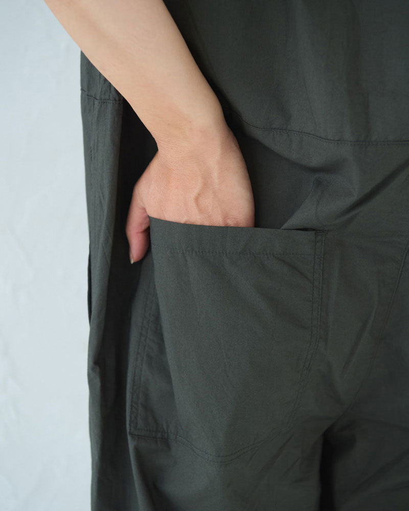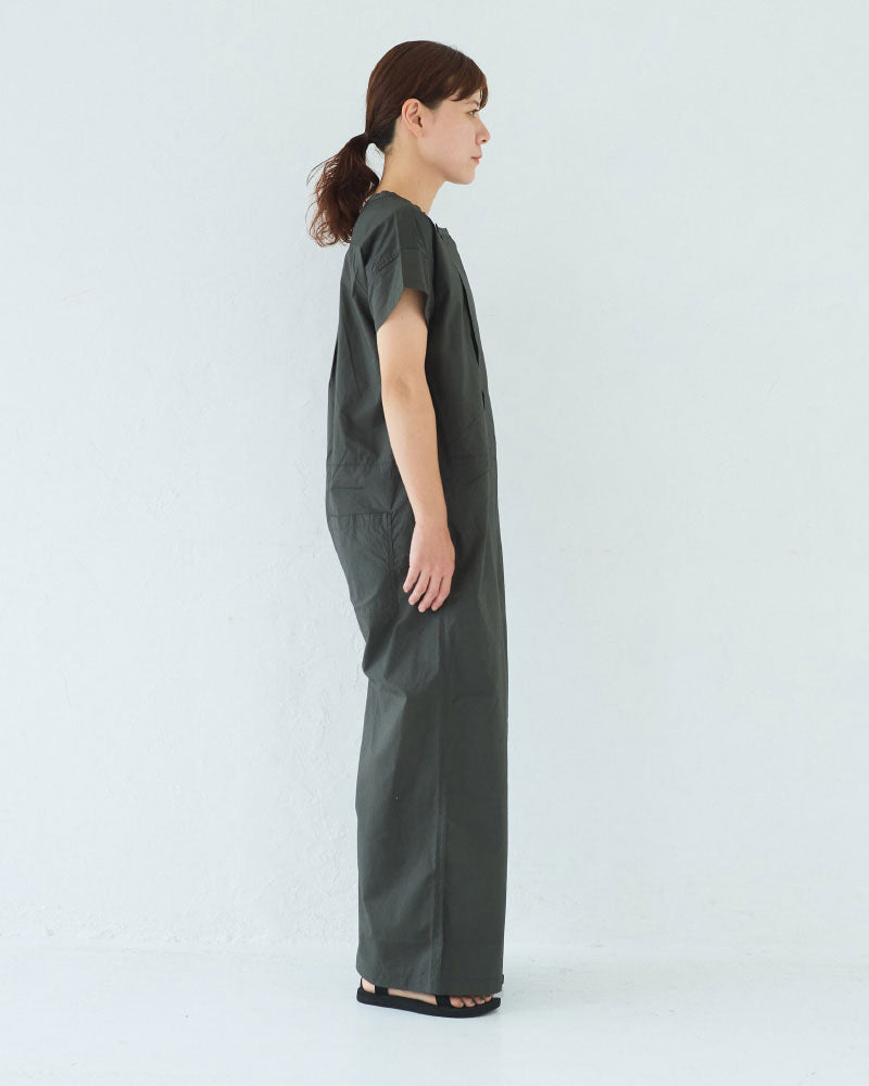 シルキーな手触りのオリジナルタイプライターを使用した半袖のオールインワン。昨年のリバイバルの形です。半袖なので、暑い季節に一枚で楽に着ることができます。ゆったりしたパンツ部分はラップパンツのようなデザインになっていて、涼しいと同時にスタイルもスッキリ見えるのがポイント。
