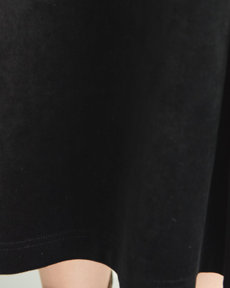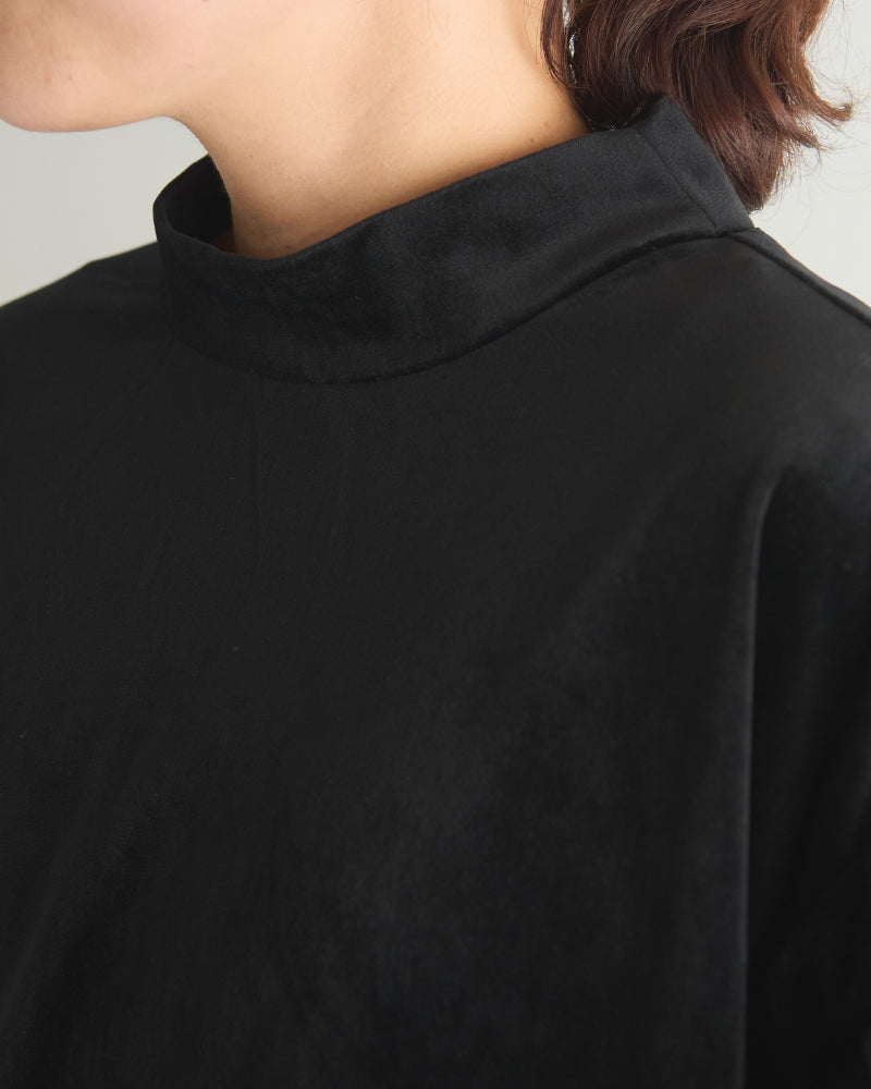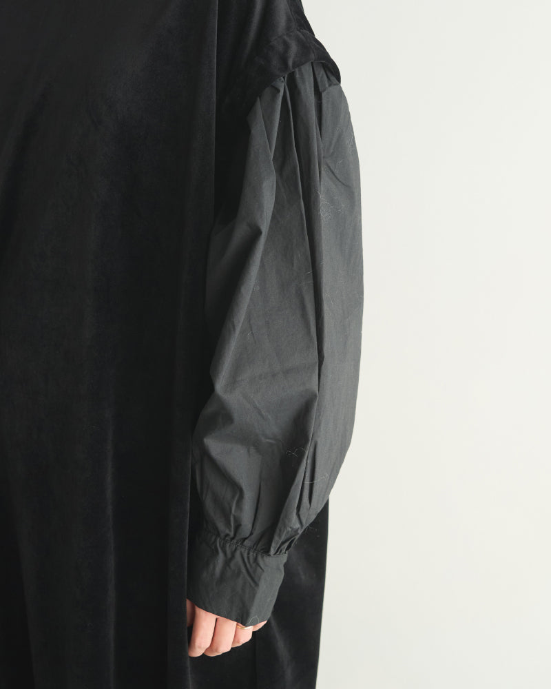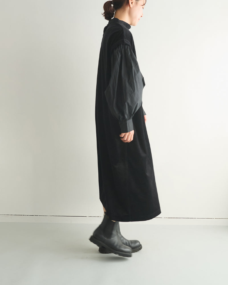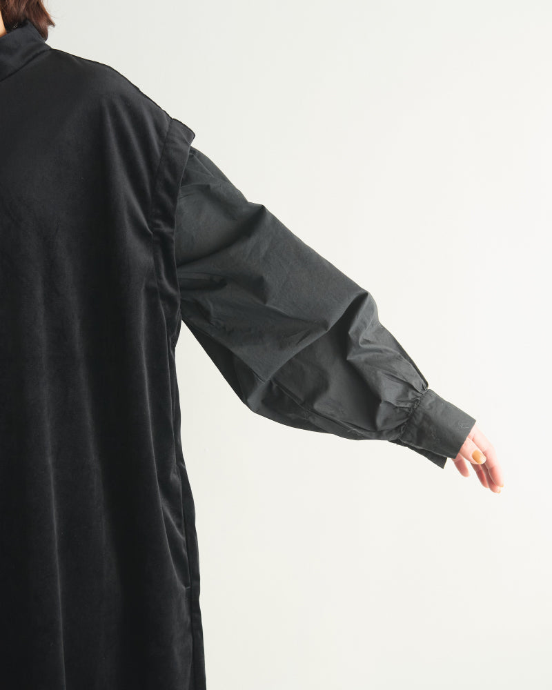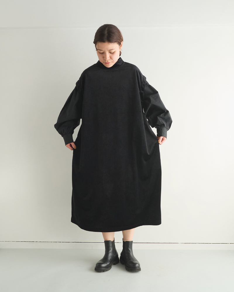 身頃にベロア、袖にタイプライター生地を組み合わせたワンピース。すっきりとしたシルエットのボディに、ふわりとした袖のデザインがアクセントに。モックネックの襟元も上品です。華やかさがあり、アクセサリーを合わせて堅苦しくないオケージョンのシーンでも着ることができそうです。