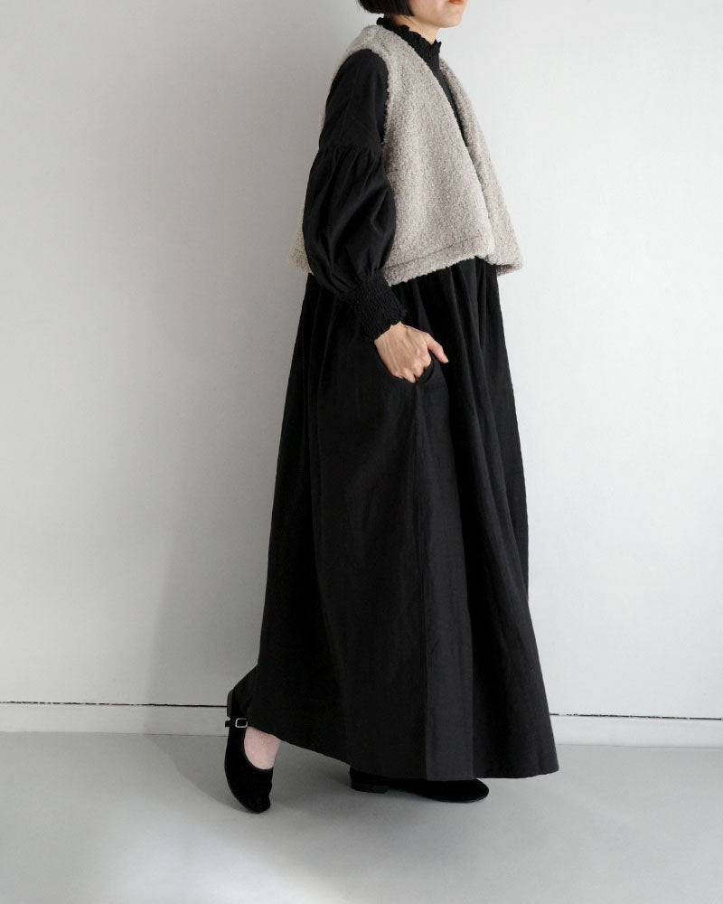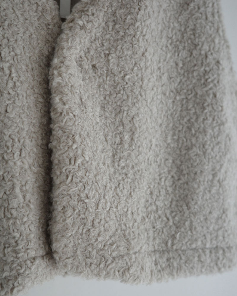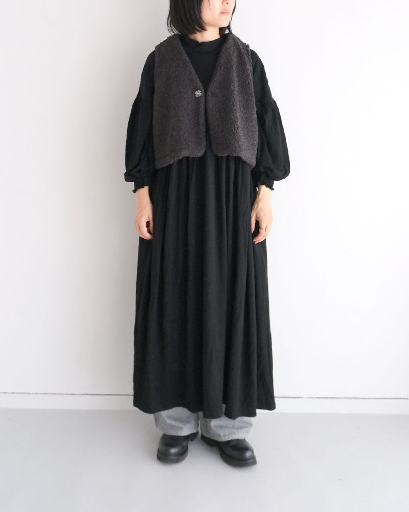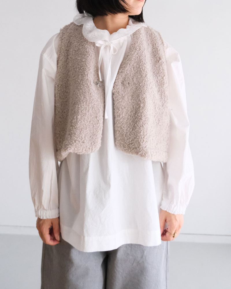 裏地なしの軽やかな作りで、ボアのボリュームが大げさすぎず、アウターの中にインナーベストとしても着られます。フロント部分はスナップボタンあきですっきりとしたデザインに。カジュアルな装いにはもちろん、シアーな素材のアイテムと合わせて素材感を楽しむコーディネートもおすすめです。