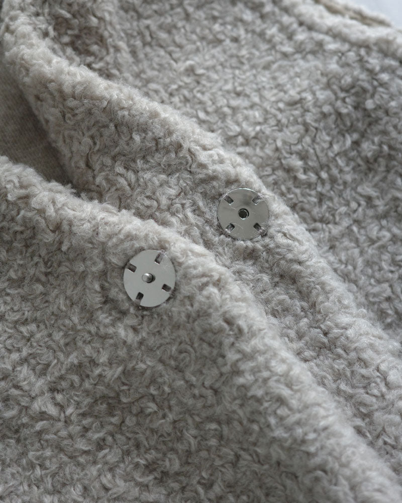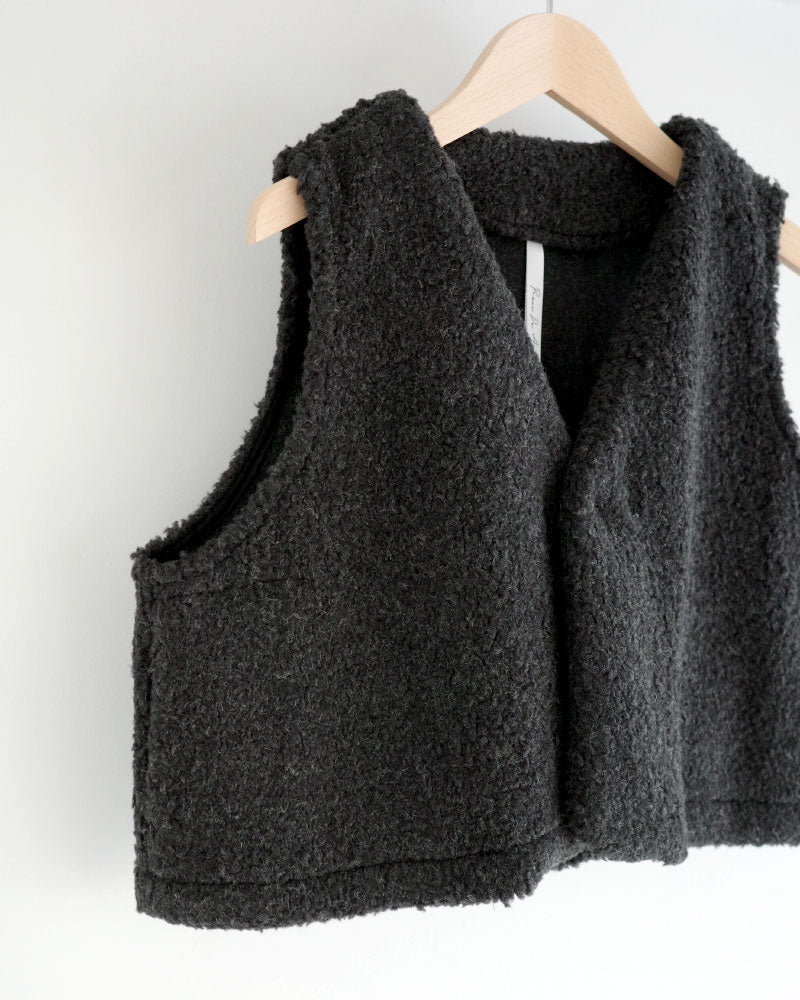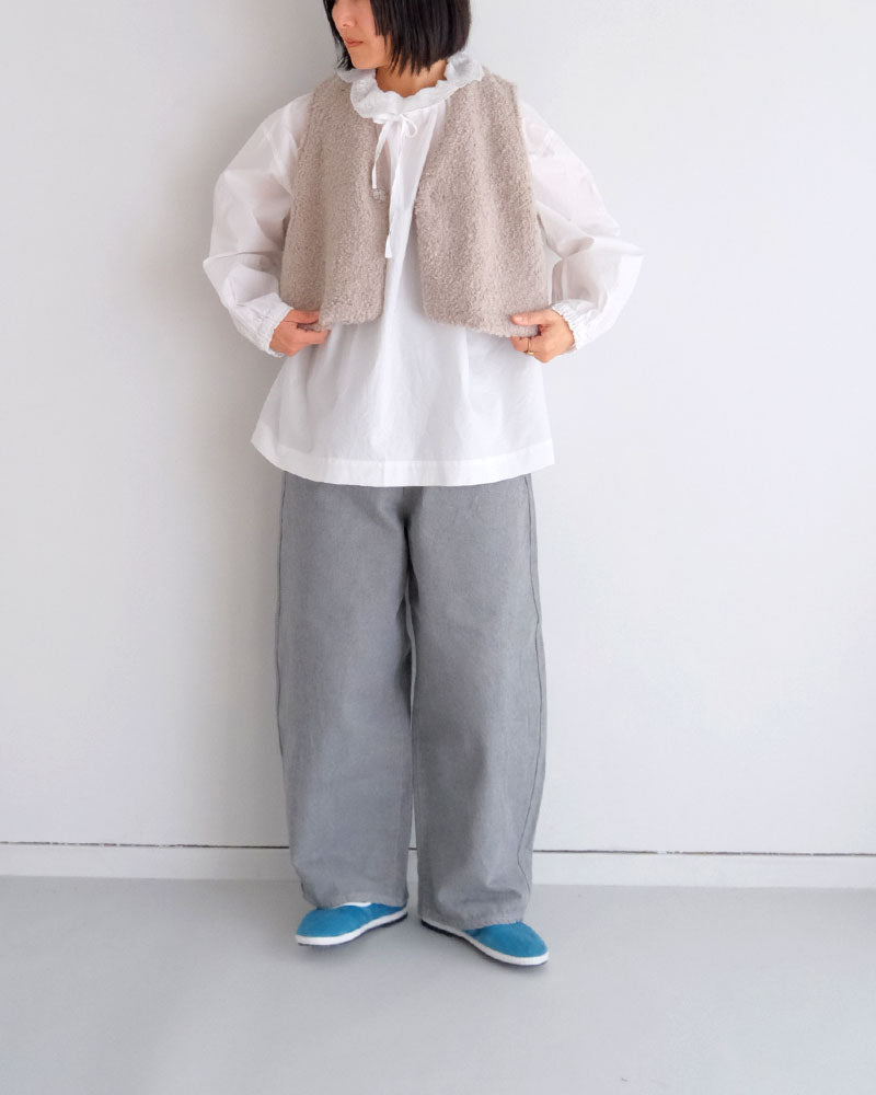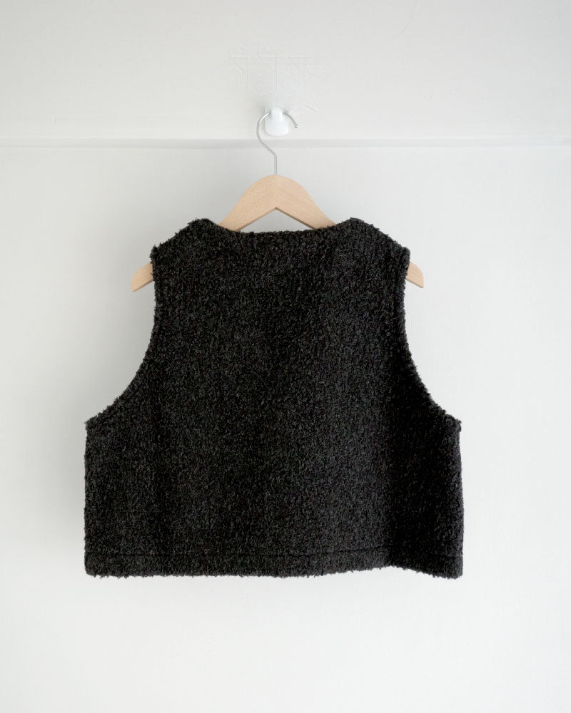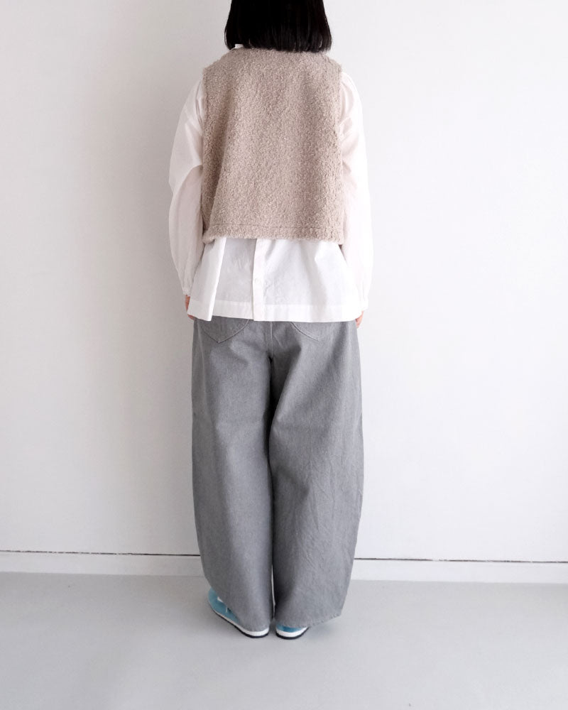 裏地なしの軽やかな作りで、ボアのボリュームが大げさすぎず、アウターの中にインナーベストとしても着られます。フロント部分はスナップボタンあきですっきりとしたデザインに。カジュアルな装いにはもちろん、シアーな素材のアイテムと合わせて素材感を楽しむコーディネートもおすすめです。