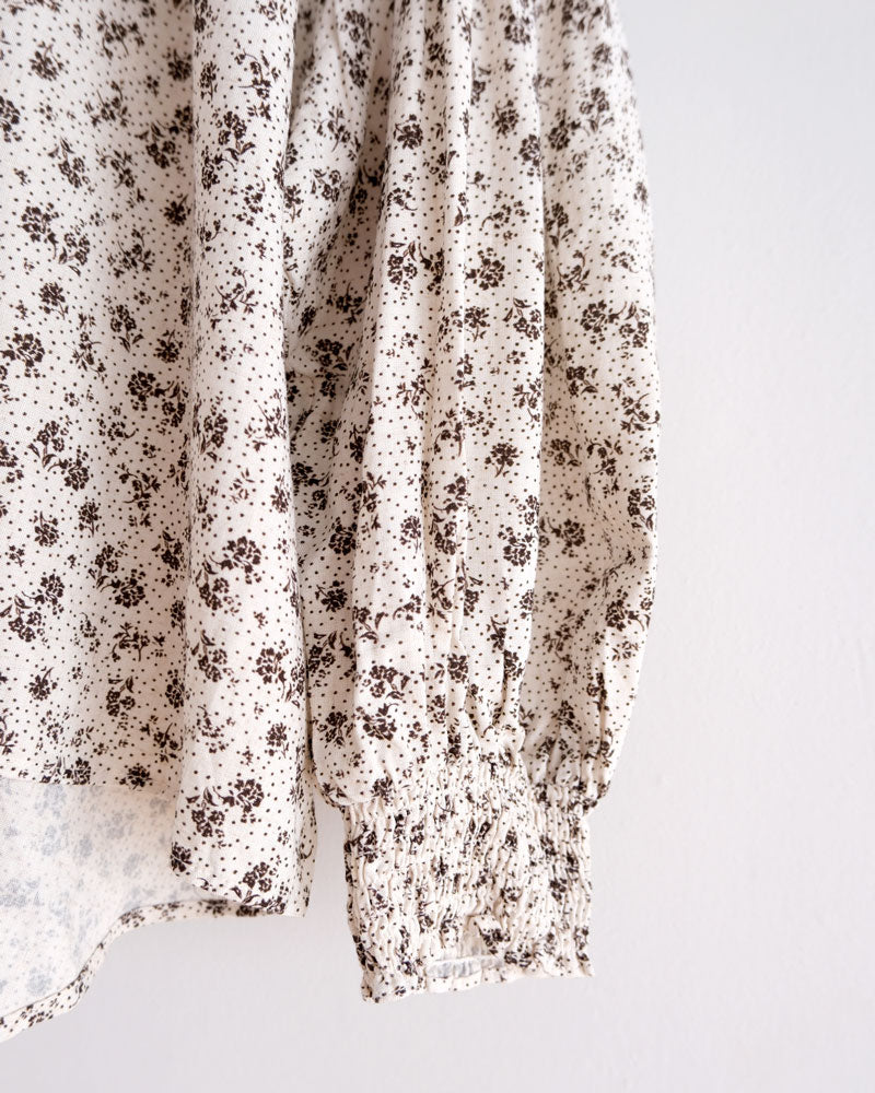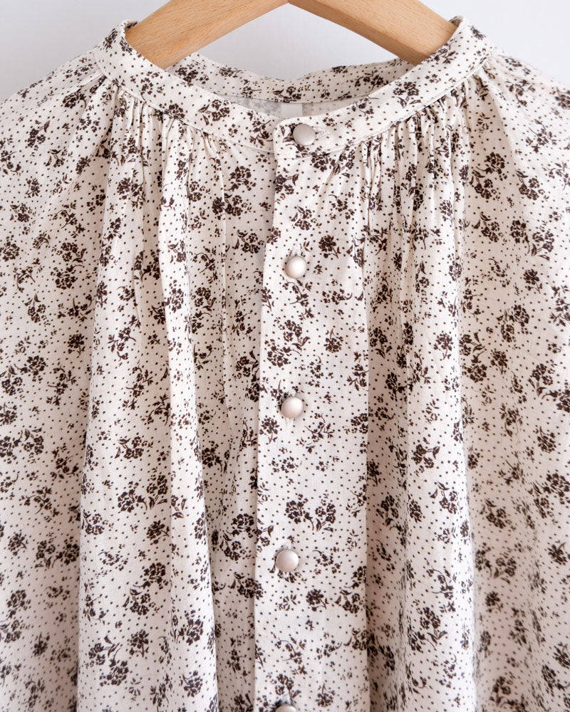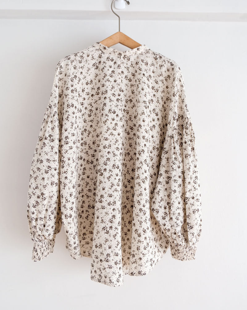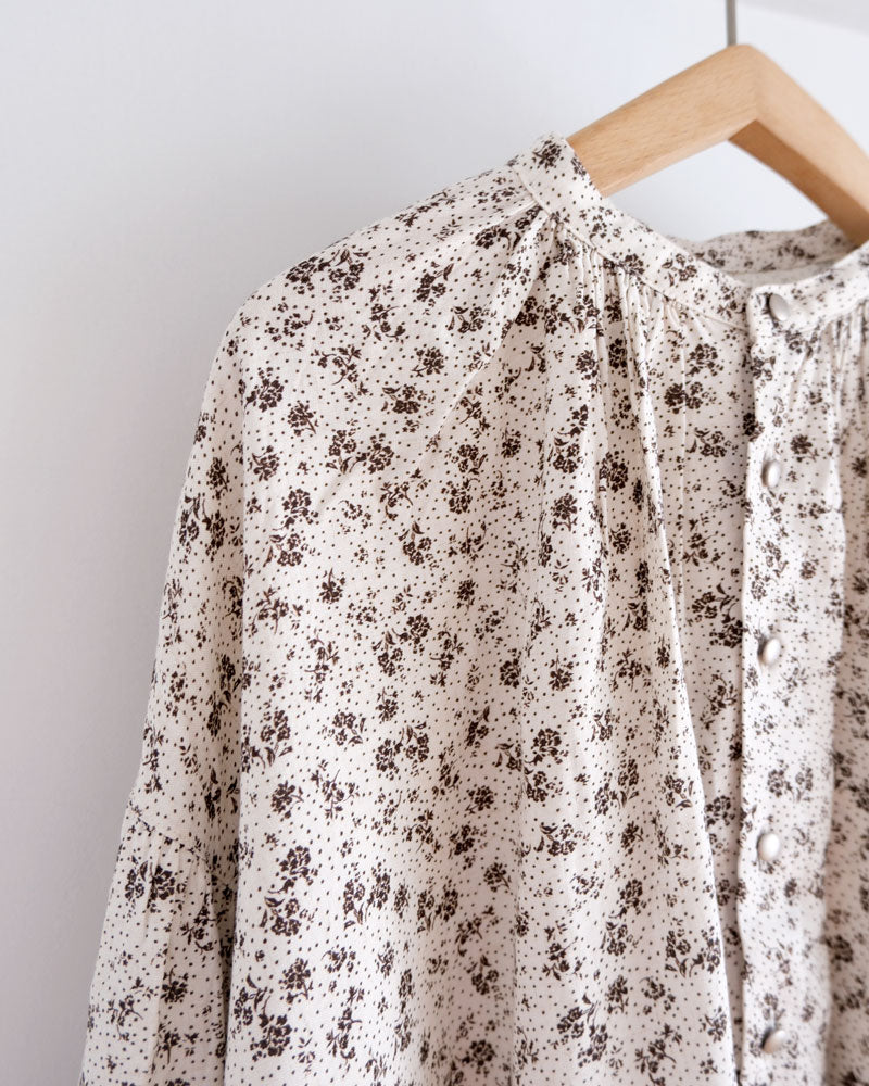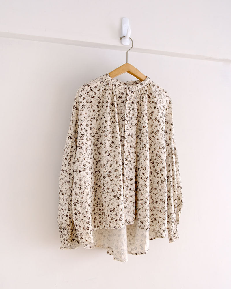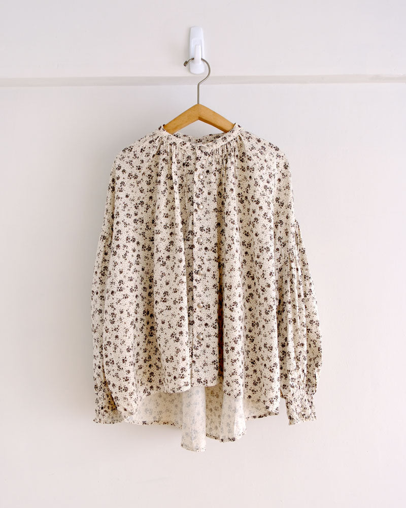 とろみのある素材で、小花柄ですが、甘くなりすぎず、ボタンの開け具合を調整することで抜け感を演出できます。ふわりとしたボリュームのある袖が軽やかで、オーバーオールやジャンパースカートと組み合わせていただくのも素敵です。