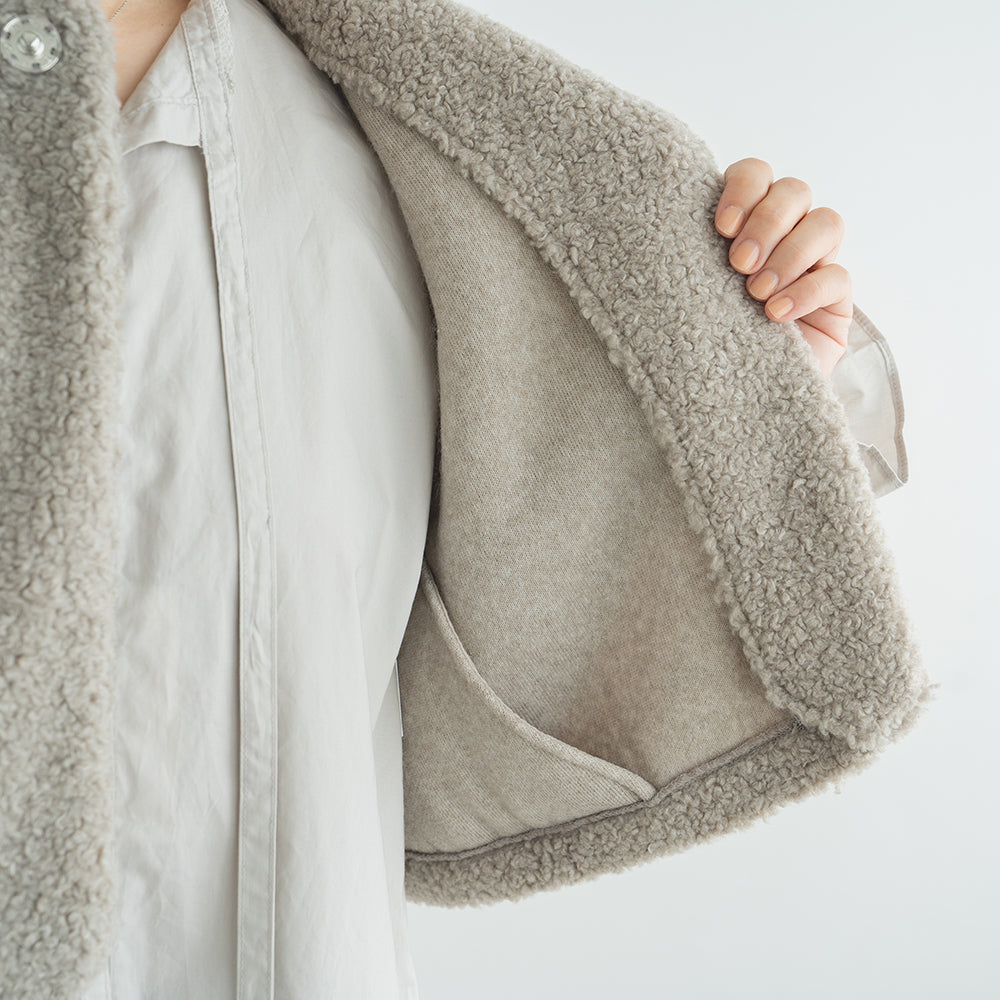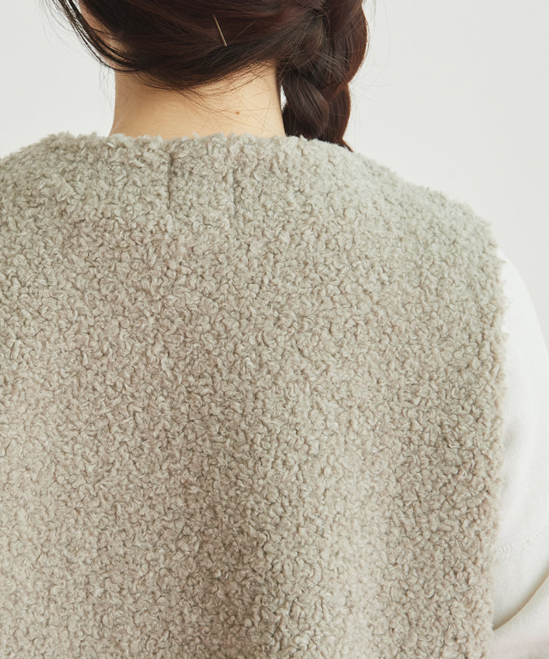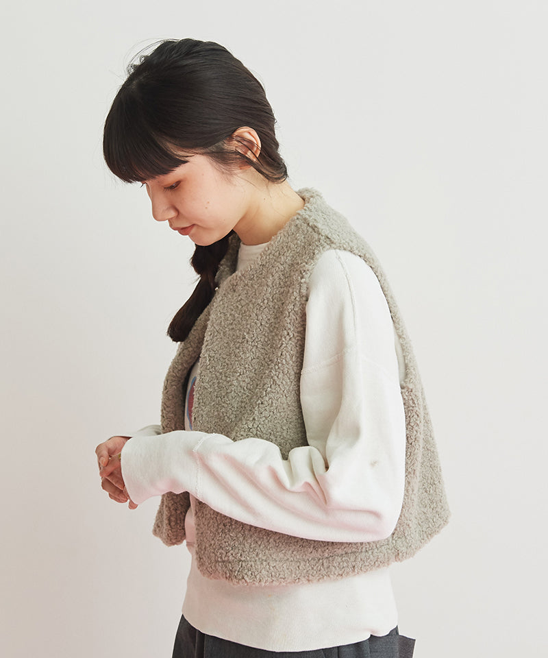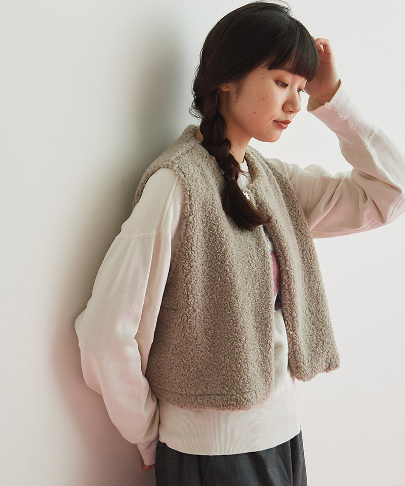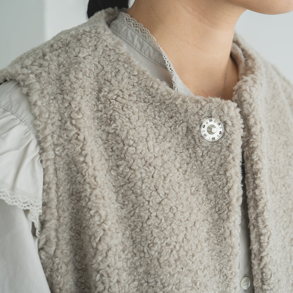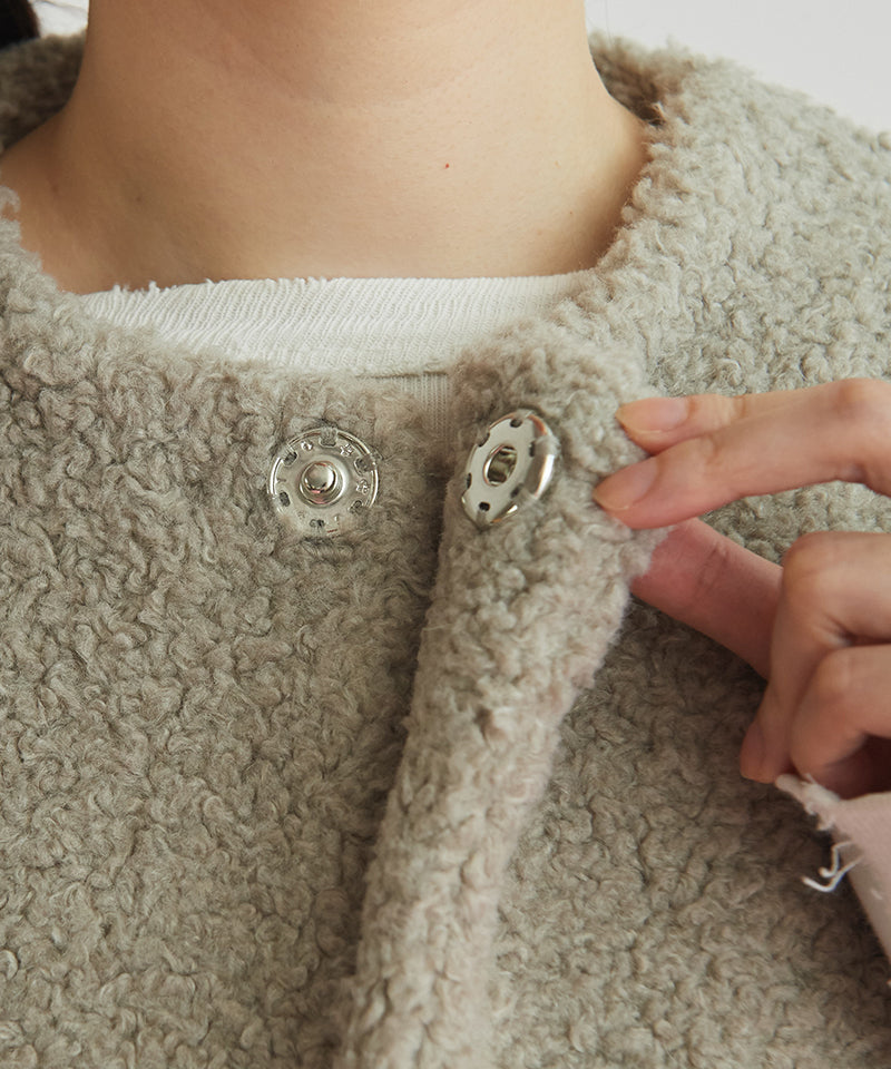 裏地なしの軽やかな作りで、ボアのボリュームが大げさすぎず、アウターの中にインナーベストとしても着られます。フロント部分はスナップボタンあきですっきりとしたデザインに。