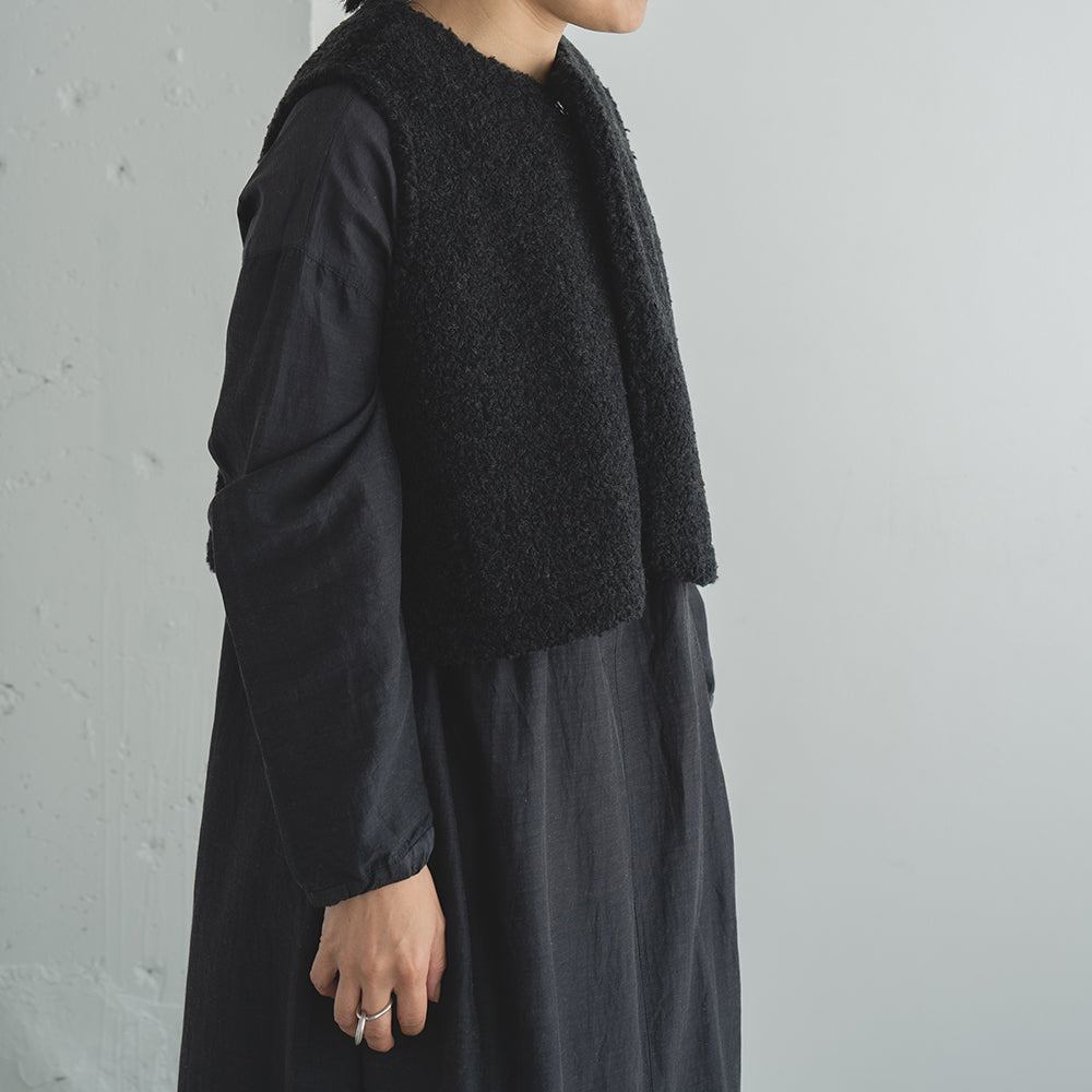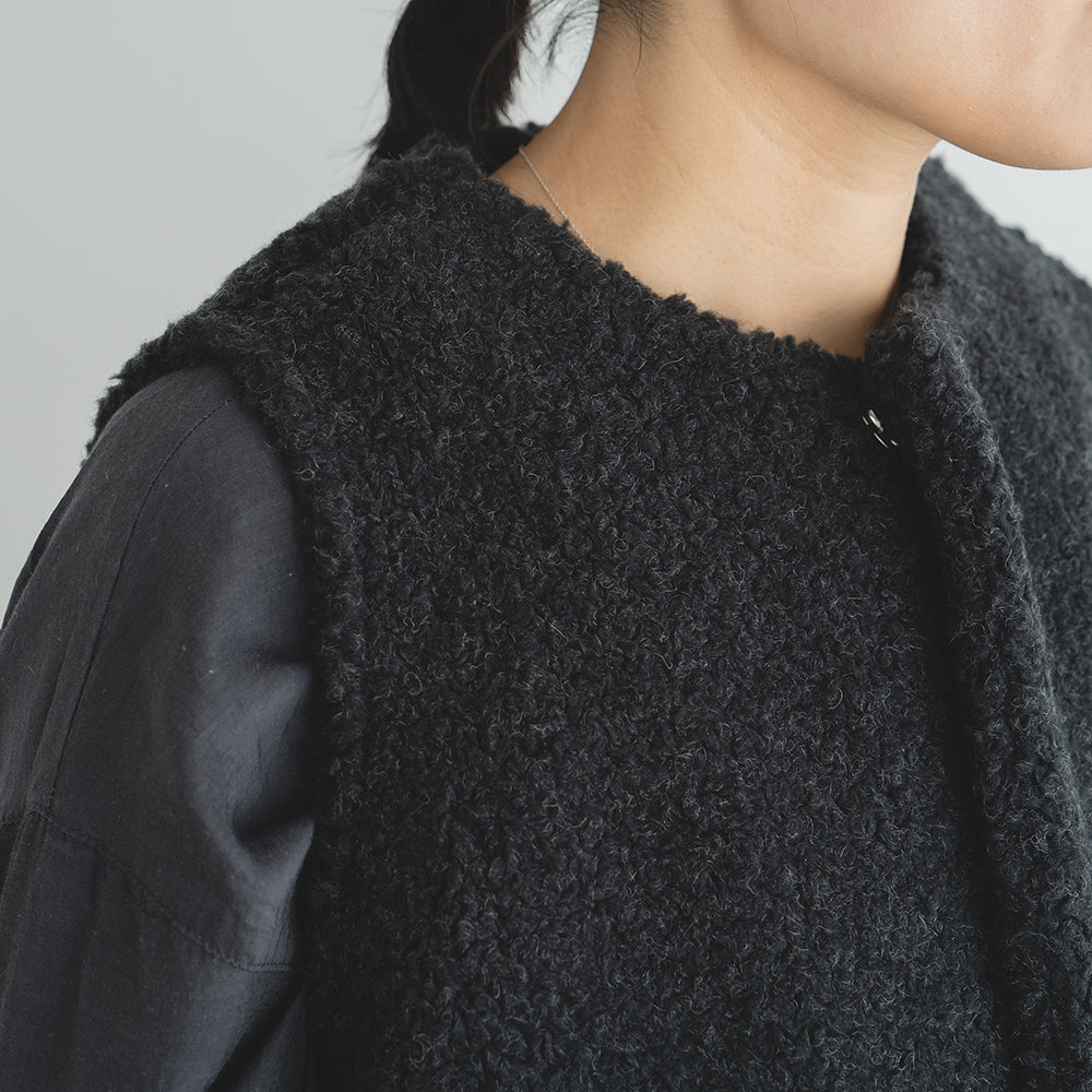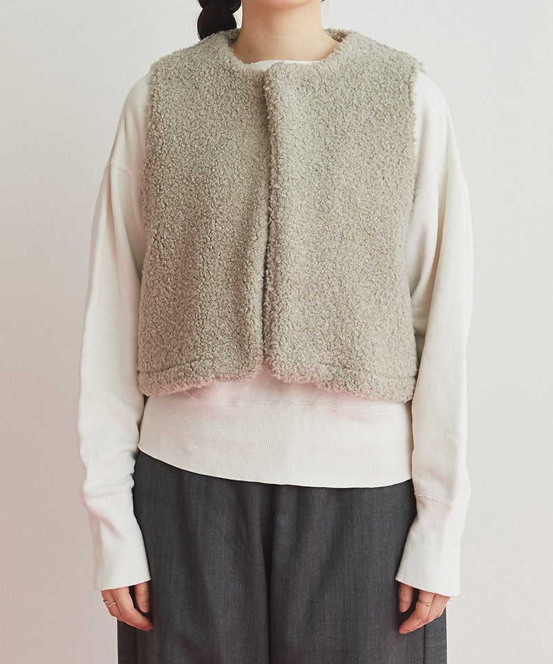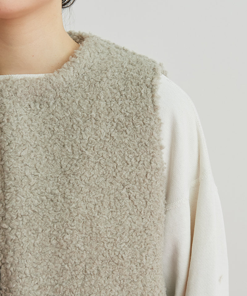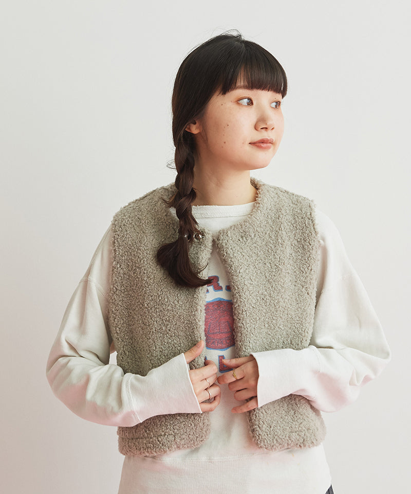 裏地なしの軽やかな作りで、ボアのボリュームが大げさすぎず、アウターの中にインナーベストとしても着られます。フロント部分はスナップボタンあきですっきりとしたデザインに。