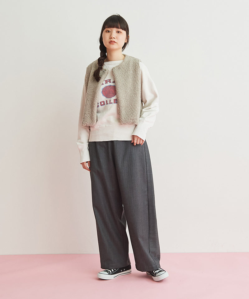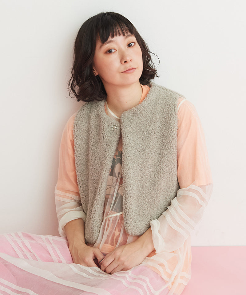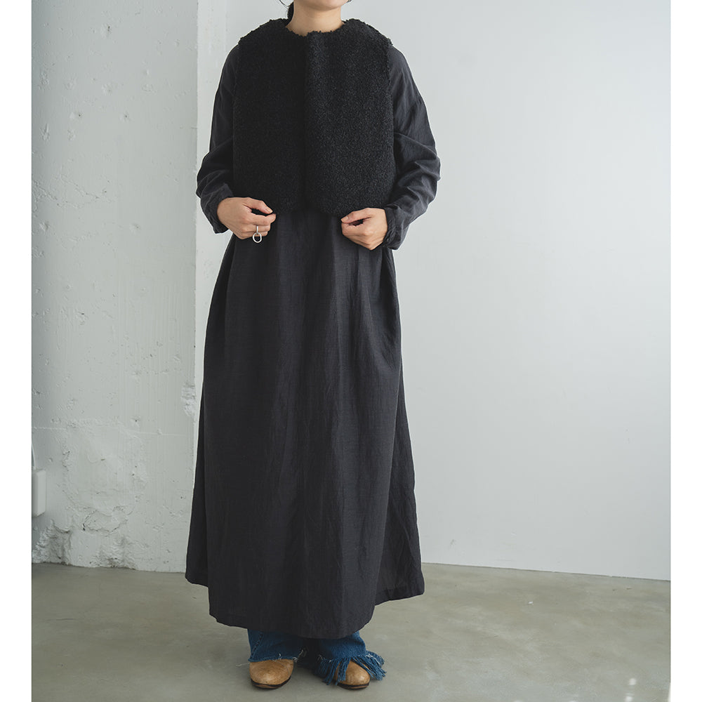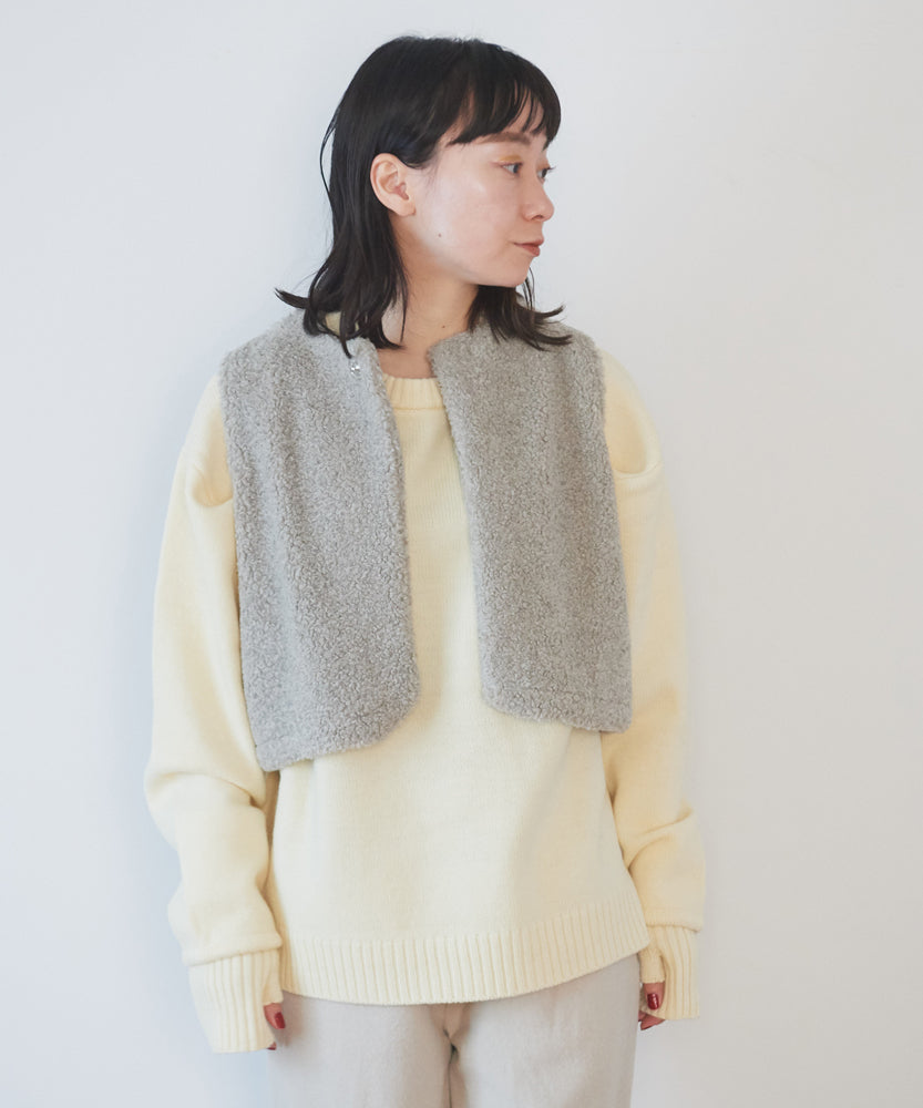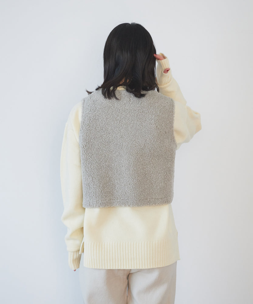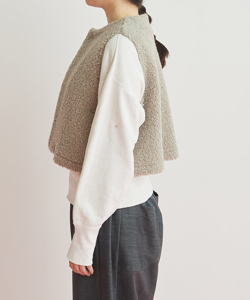 裏地なしの軽やかな作りで、ボアのボリュームが大げさすぎず、アウターの中にインナーベストとしても着られます。フロント部分はスナップボタンあきですっきりとしたデザインに。