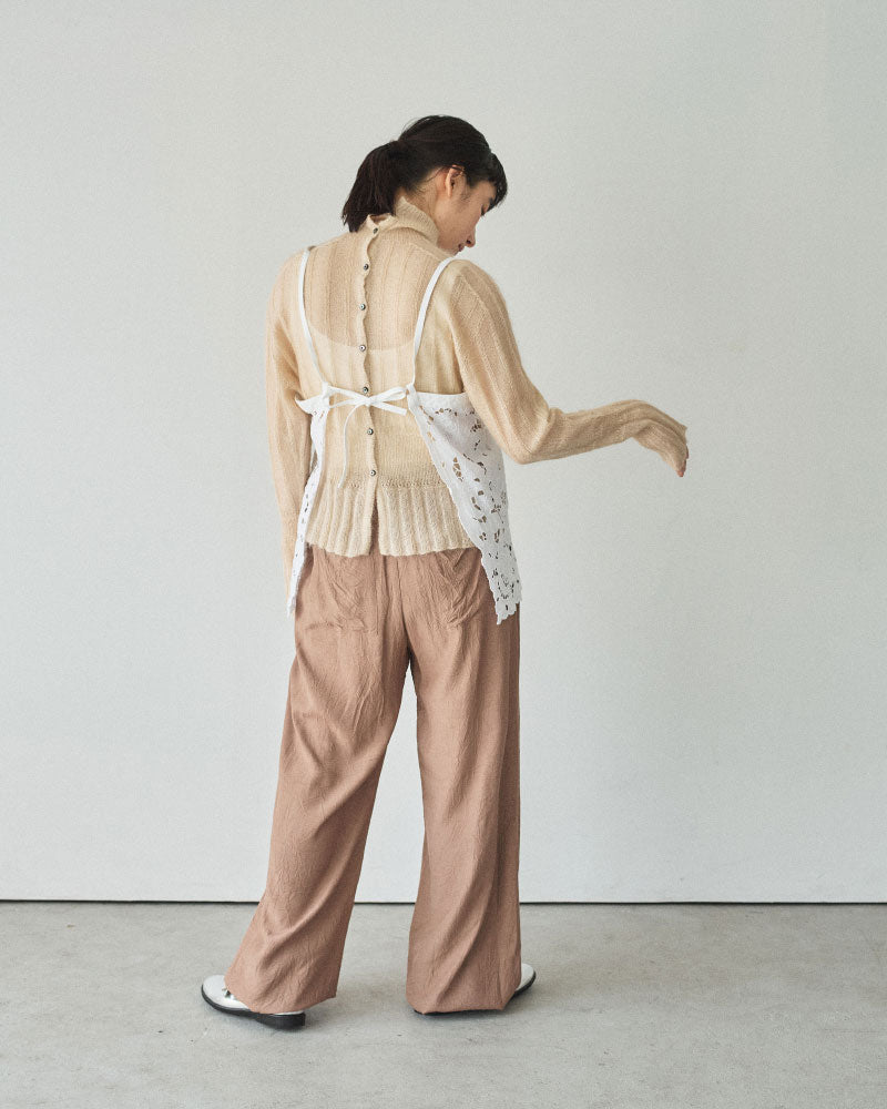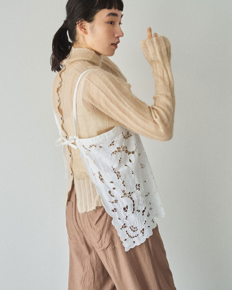 中国の汕頭でヨーロッパ向けに作られていた、デットストックのカットワーク刺繍のテーブルクロスをリメイクしたキャミソールです。カットワーク刺繍は全て手仕事で作られています。肩紐は、後ろでリボン結びする使用なので、長さの調整ができます。パンツの上から腰に巻いて、タブリエのように着ていただいても素敵です。