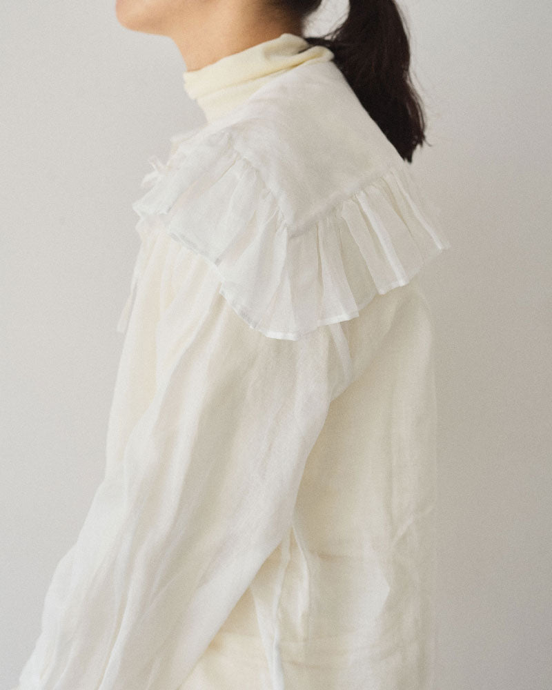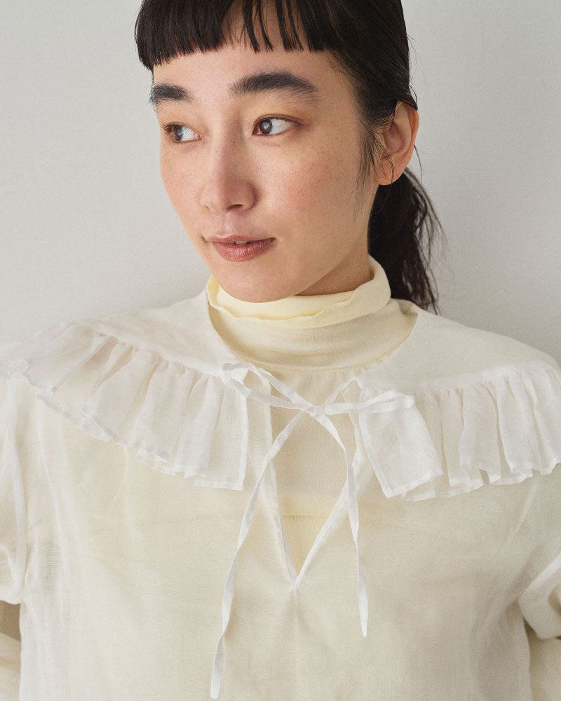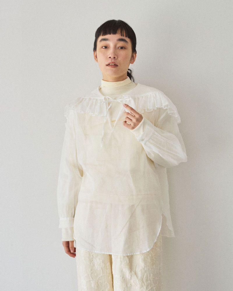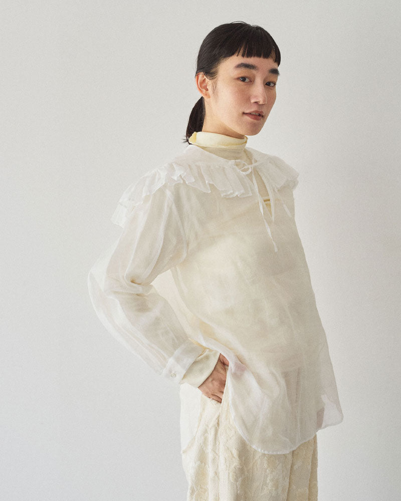 日本製の上質なコットンオーガンジーを使用したブラウスです。たっぷりとギャザーが入った襟がポイント。袖のカーブやラインをシャープにすることにより、甘くなりすぎないようにバランスにこだわりました。袖口にボタンが二つ付いており、調整が可能です。透け感があるのでレイヤードを楽しんでいただけます。