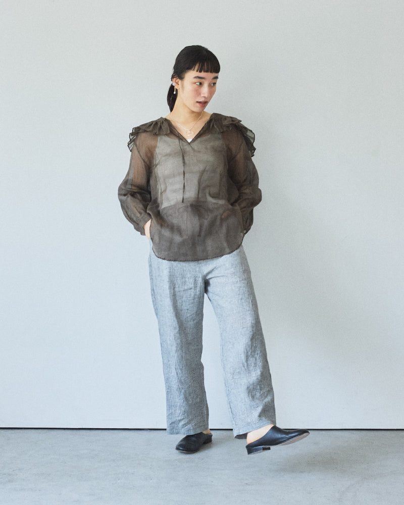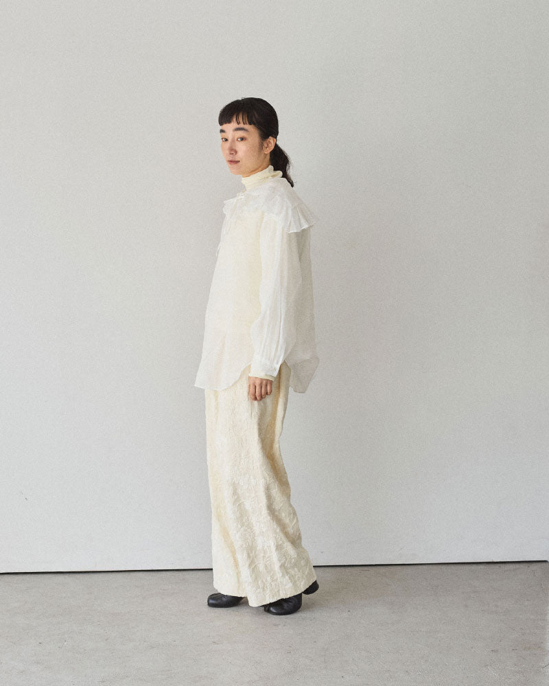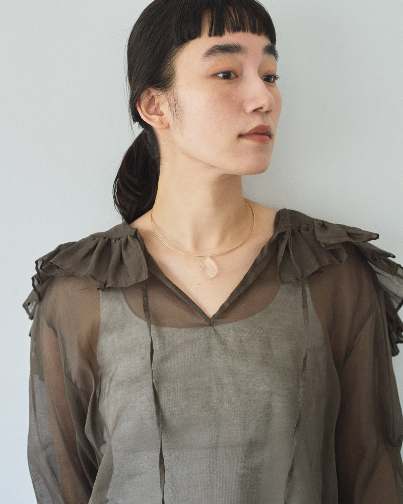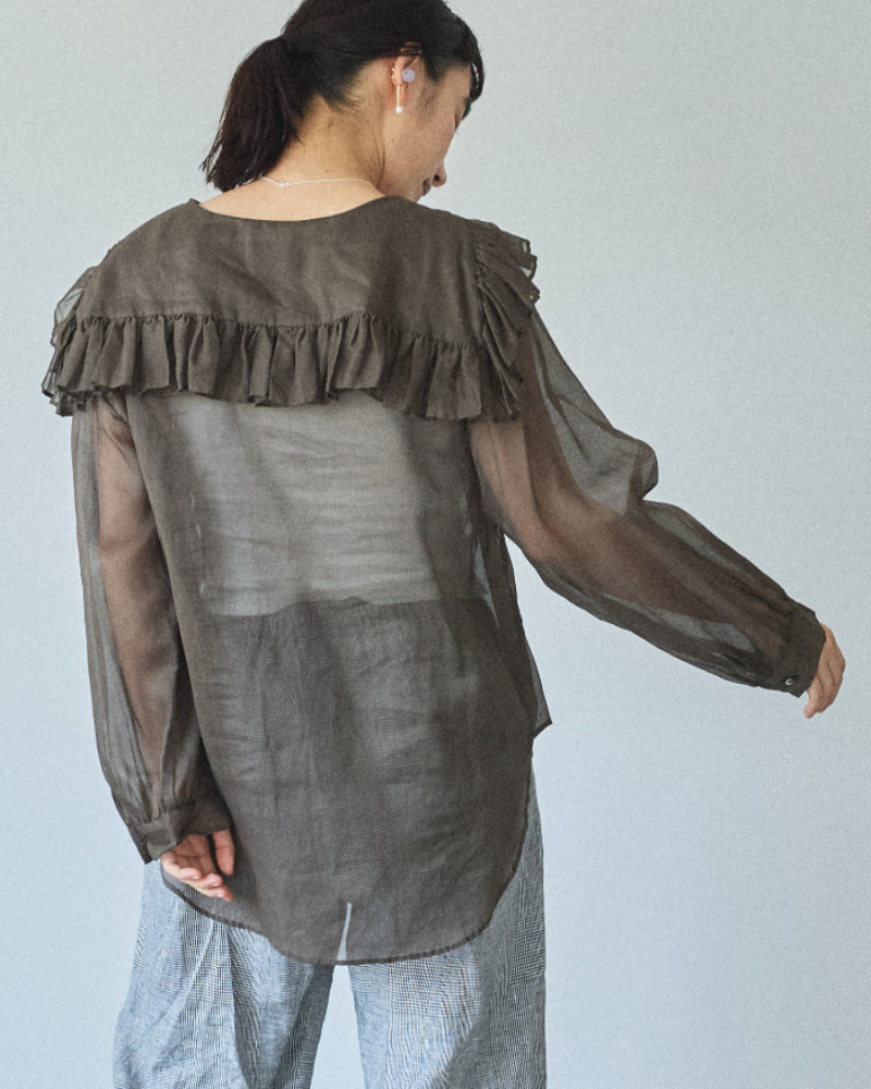 日本製の上質なコットンオーガンジーを使用したブラウスです。たっぷりとギャザーが入った襟がポイント。袖のカーブやラインをシャープにすることにより、甘くなりすぎないようにバランスにこだわりました。袖口にボタンが二つ付いており、調整が可能です。透け感があるのでレイヤードを楽しんでいただけます。