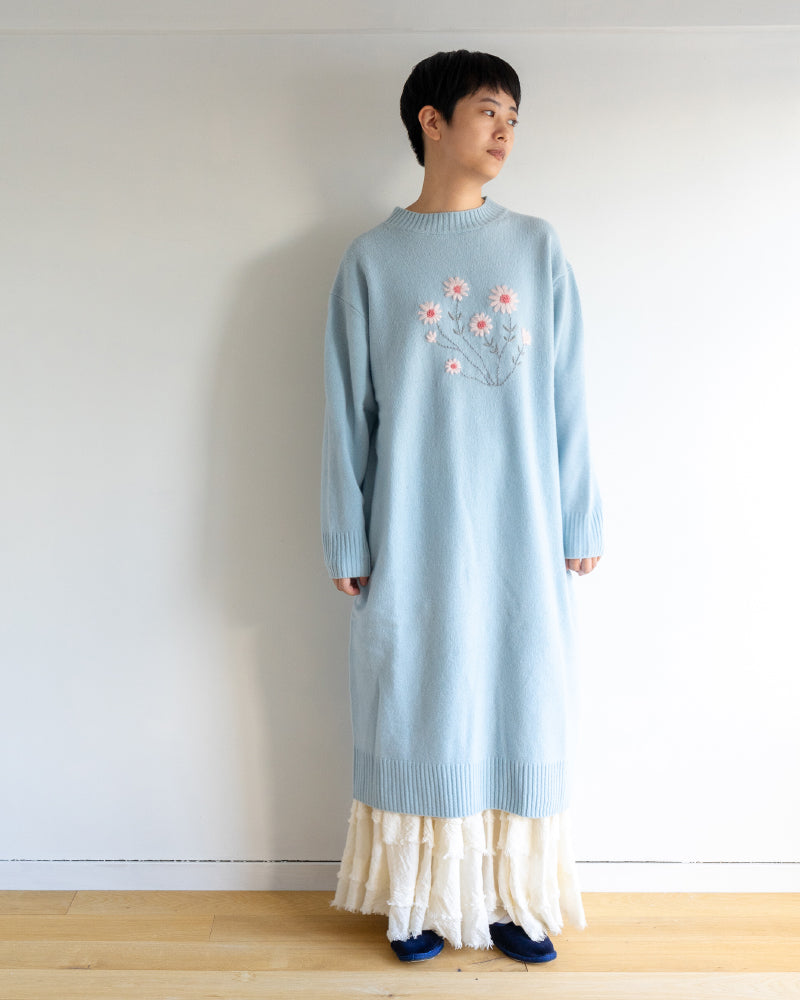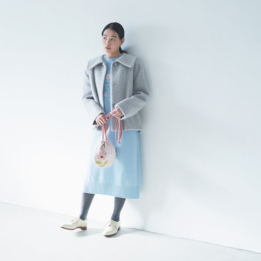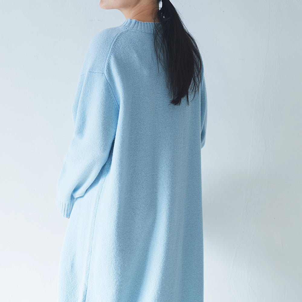 ワンピースはストンとしたシンプルな形。身幅が広めのドロップショルダーの形でリラックス感のある着心地です。ウール100%、チクチク感の少ないラムウールを使用しています。透け感は気にならないので、一枚でも着やすいですが、ペチコートを合わせていただくと安心感があります。