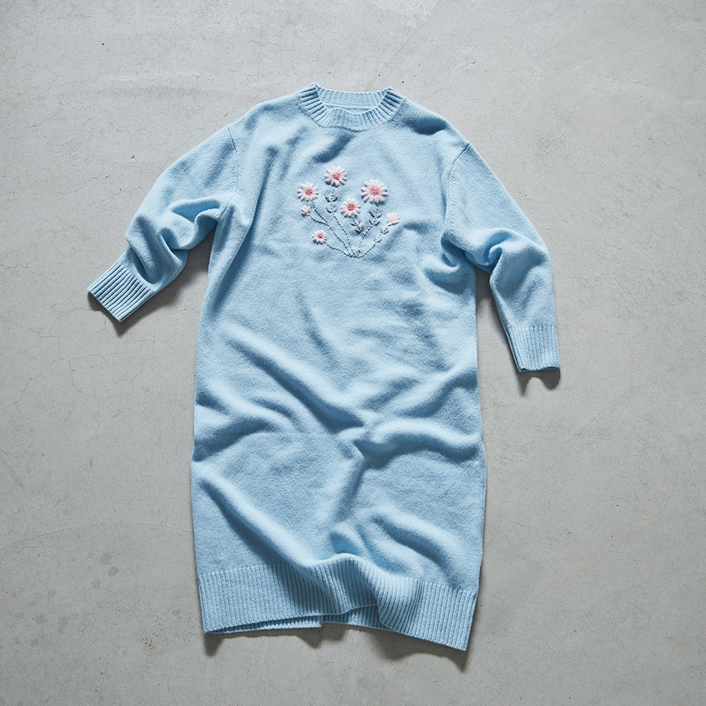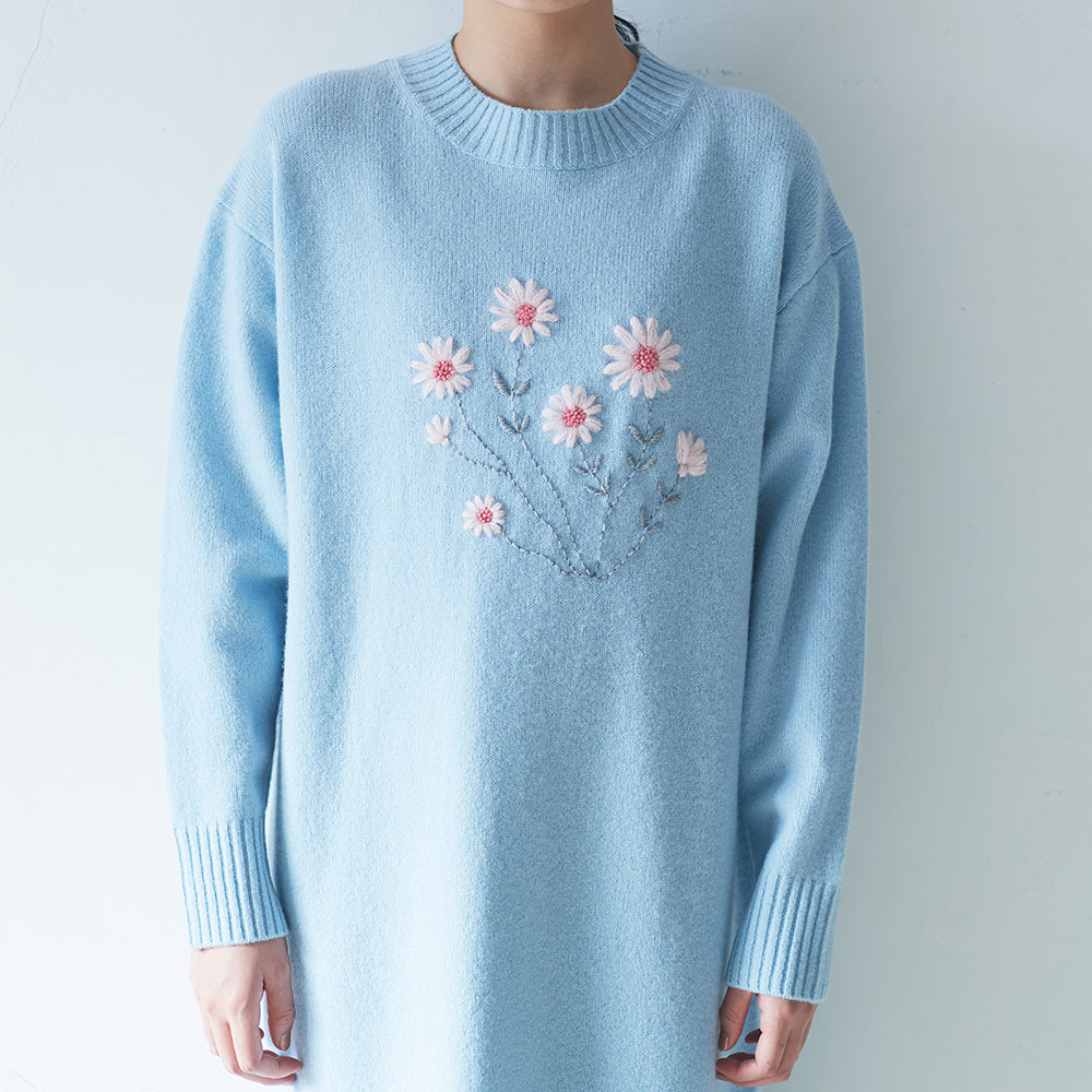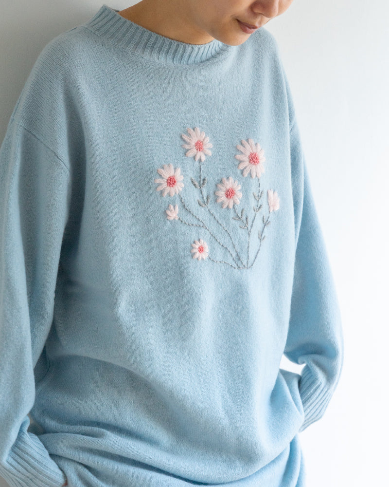 ニットの形、色に合わせて下書きなしで刺繍しています。毛糸を使ってし刺繍してあるためふっくらと立体感のある仕上がりになっています。ピンクの部分は、モヘアの糸を使っていて、ふわふわとした風合いが可愛く一枚で主役になる特別なニットです。