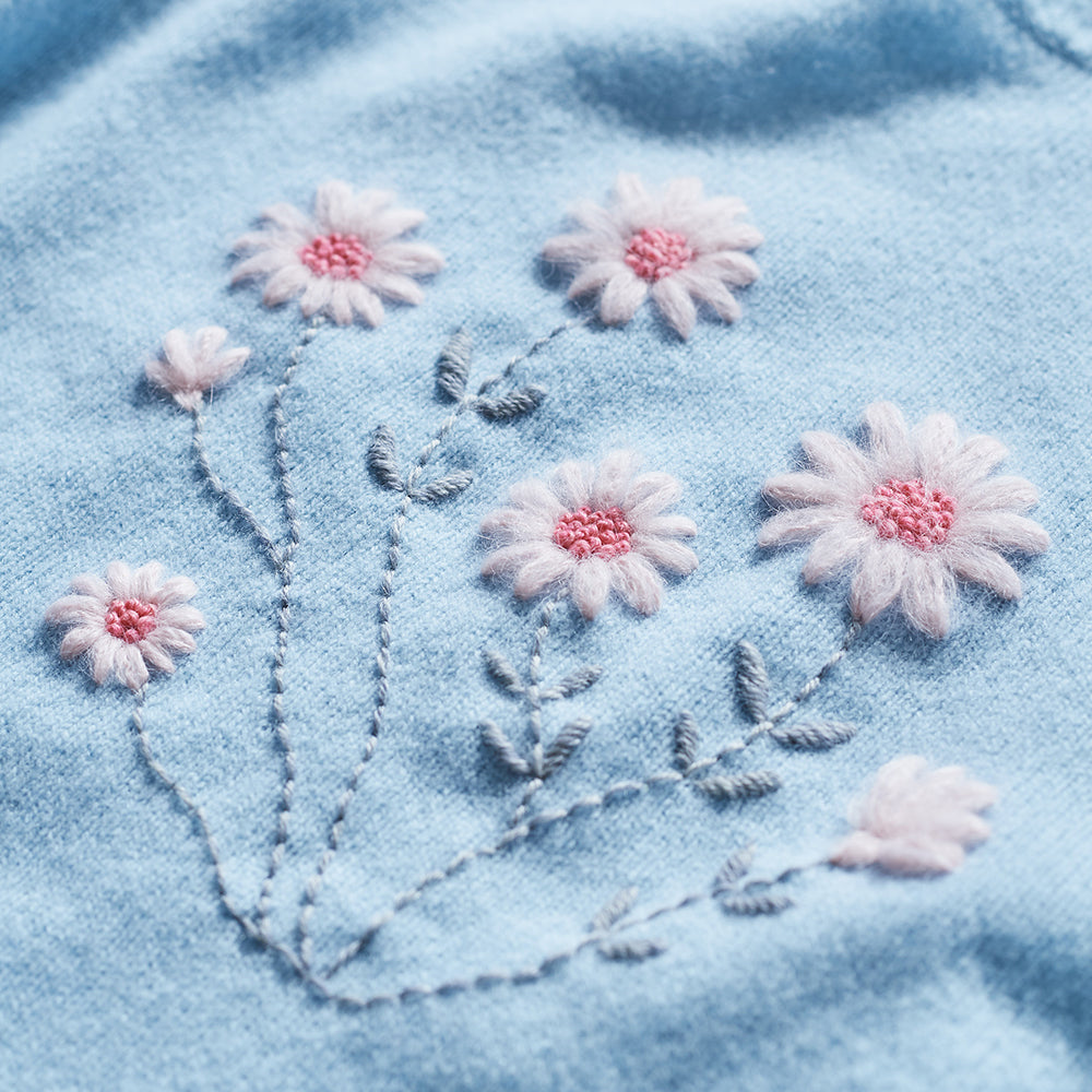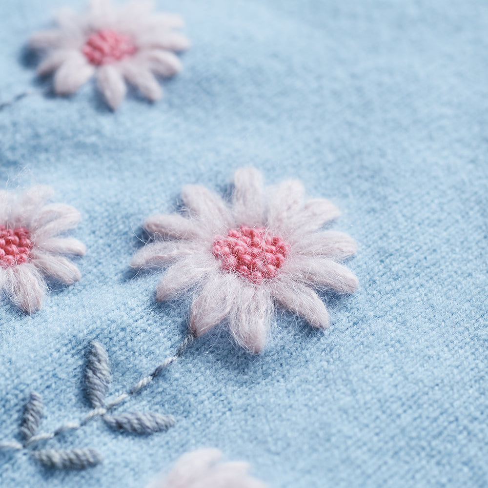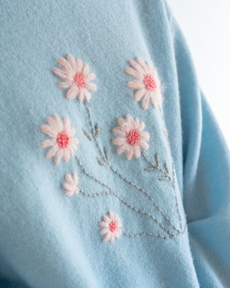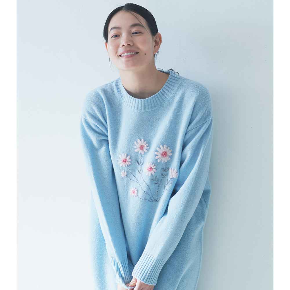 ニットの形、色に合わせて下書きなしで刺繍しています。毛糸を使ってし刺繍してあるためふっくらと立体感のある仕上がりになっています。ピンクの部分は、モヘアの糸を使っていて、ふわふわとした風合いが可愛く一枚で主役になる特別なニットです。