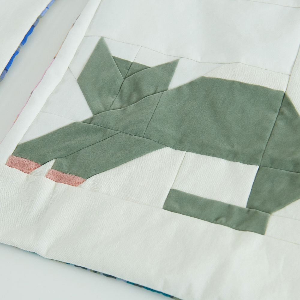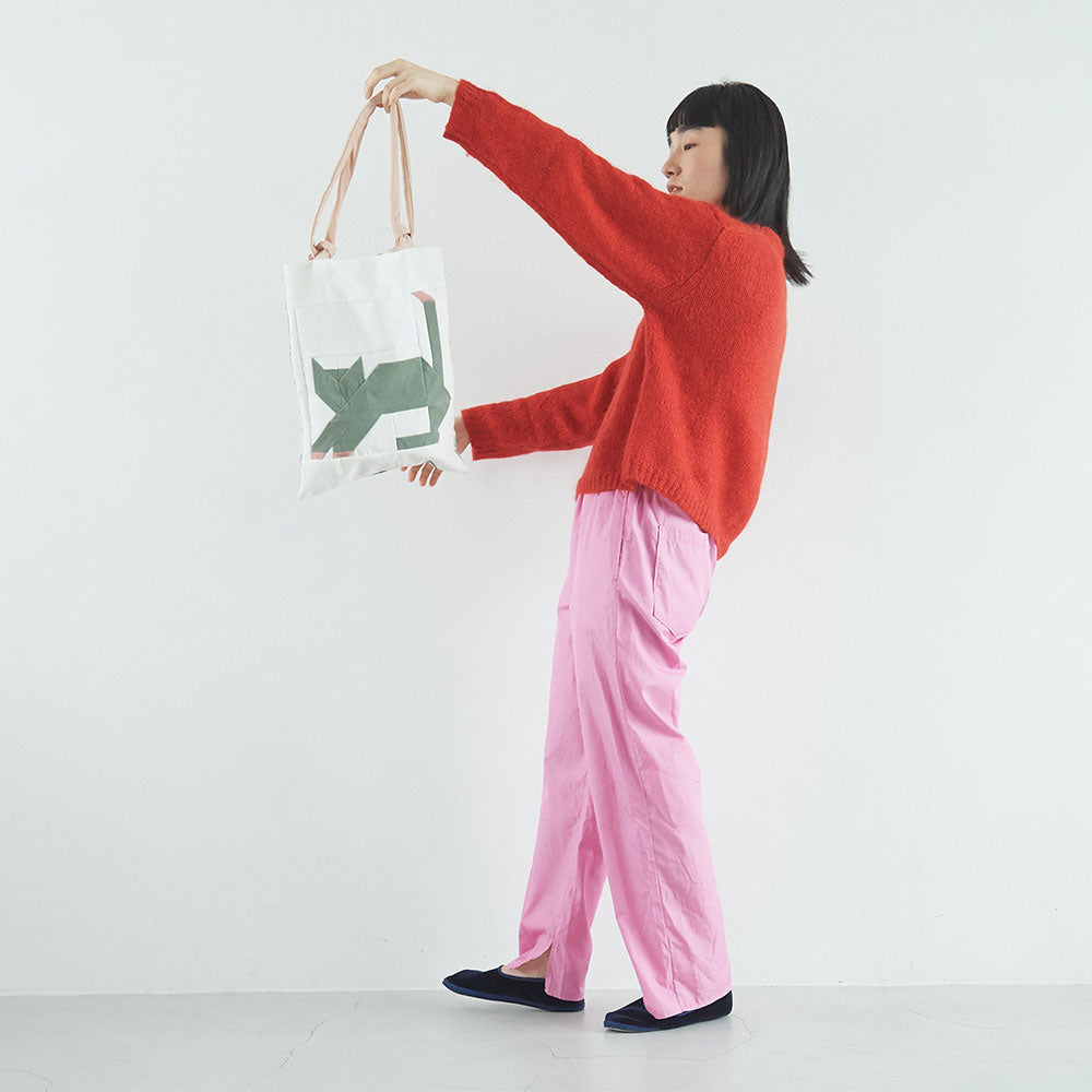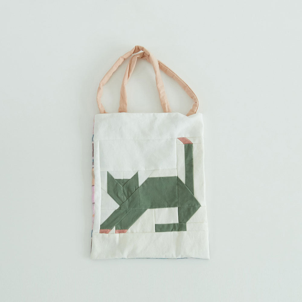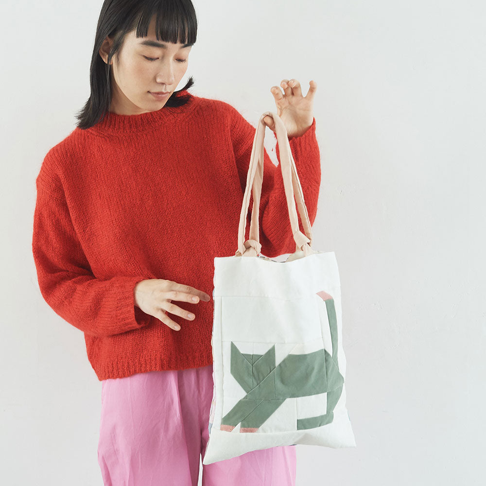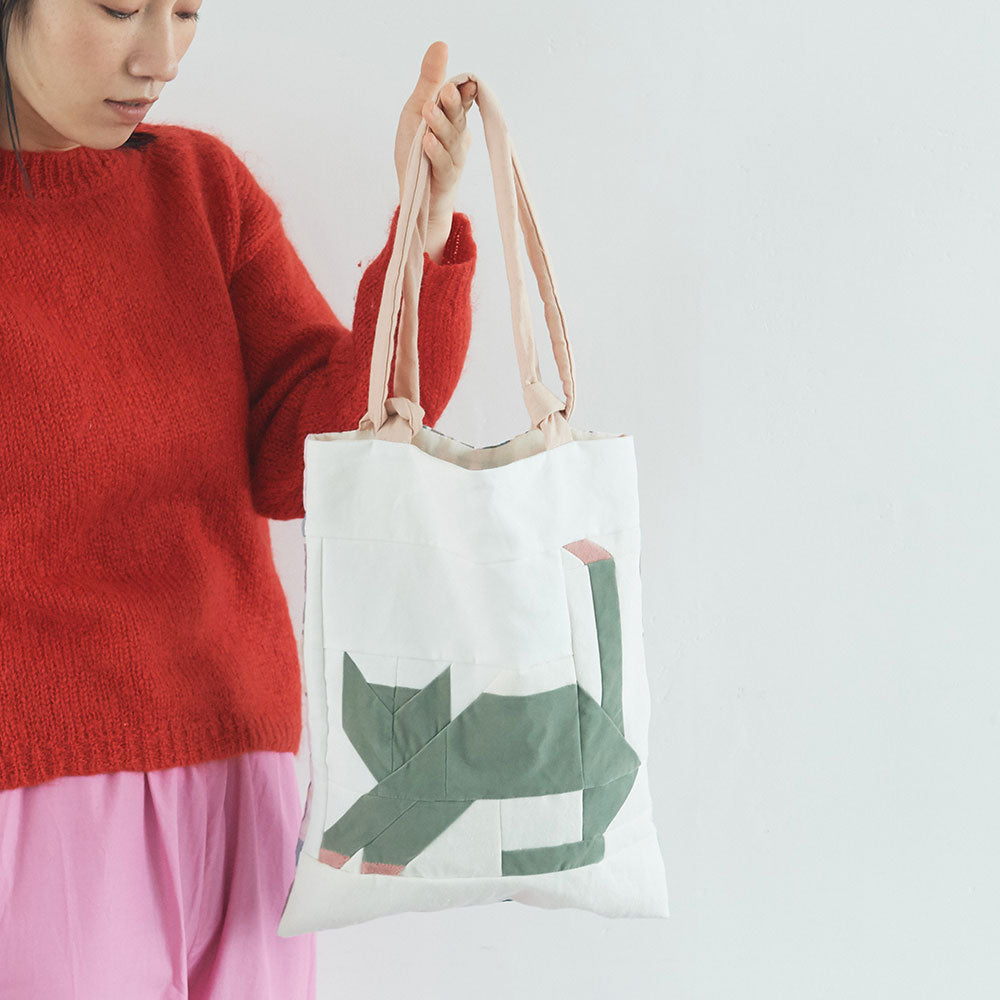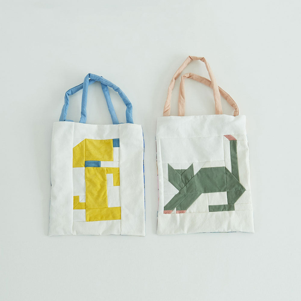 犬と猫の形をパッチワークで表現したバッグです。裏側はチェックの生地を合わせてあります。色の組み合わせやモチーフの愛らしさが目を引きます。