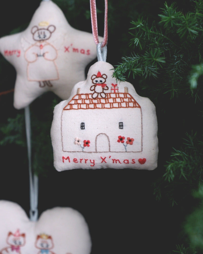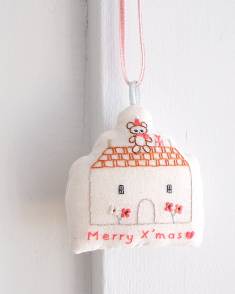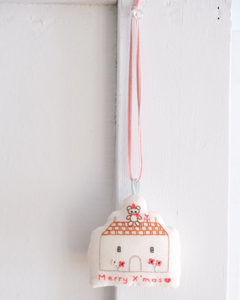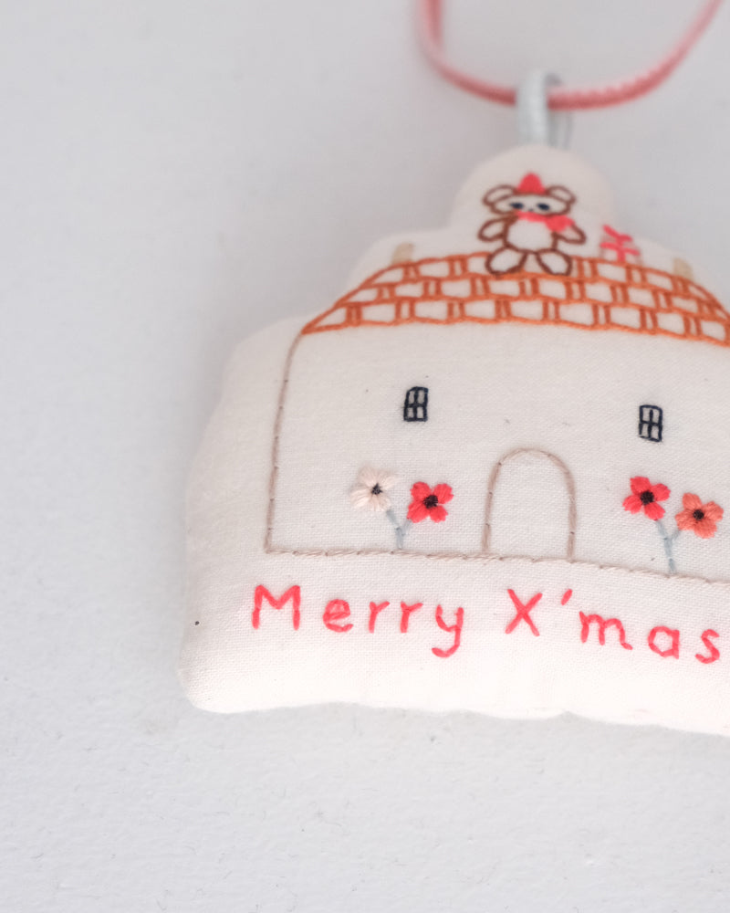 お家形をしたオーナメント。綿をしっかりと詰めて、ふっくらと仕上げました。お手持ちのオーナメントと合わせてツリーに飾ったり、壁に飾ったり、お気に入りのコーナーにそっと置いみたり。扱いやすい布製品で、好きな場所に気軽に飾ってクリスマス気分を楽しめます。リボンはベルベットのリボン。取り外しができるので、お好みのものと組み合わせたり長さの調整も可能です。