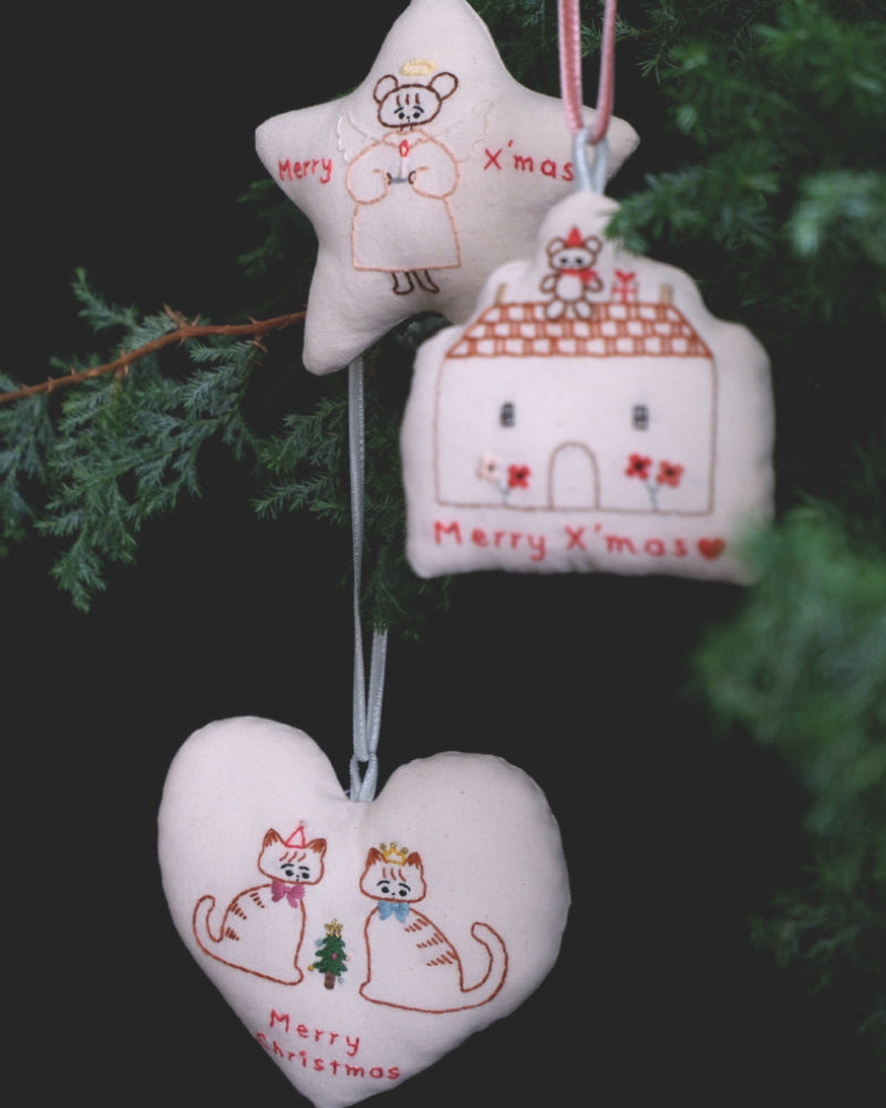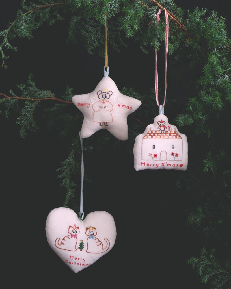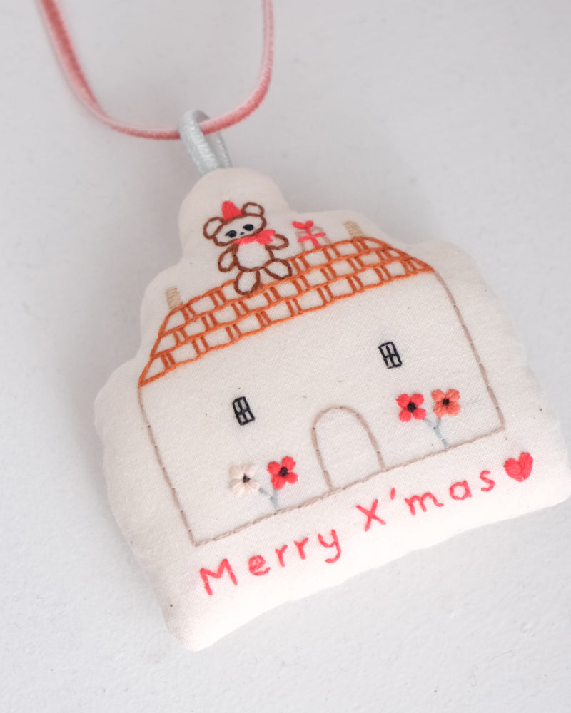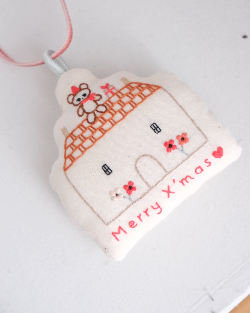 お家形をしたオーナメント。綿をしっかりと詰めて、ふっくらと仕上げました。お手持ちのオーナメントと合わせてツリーに飾ったり、壁に飾ったり、お気に入りのコーナーにそっと置いみたり。扱いやすい布製品で、好きな場所に気軽に飾ってクリスマス気分を楽しめます。リボンはベルベットのリボン。取り外しができるので、お好みのものと組み合わせたり長さの調整も可能です。