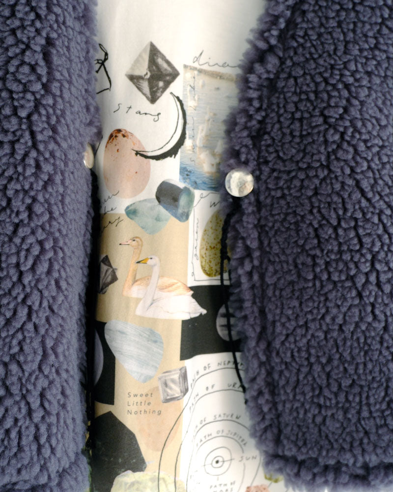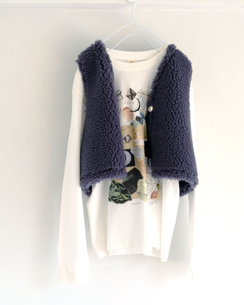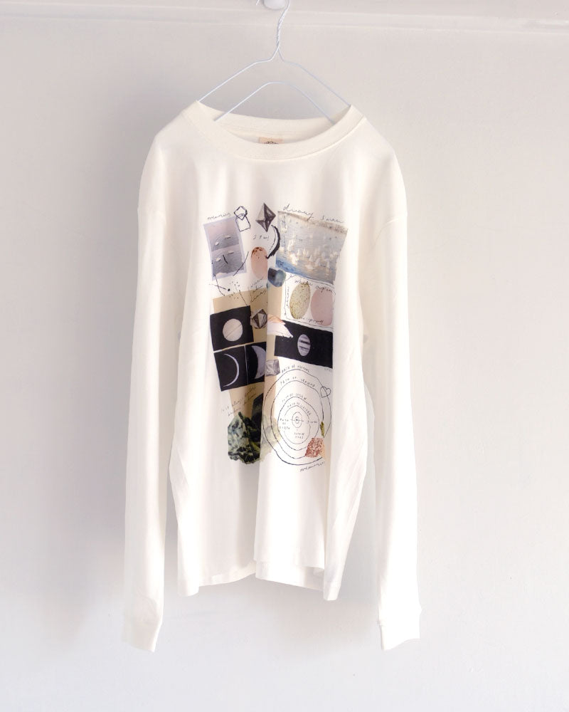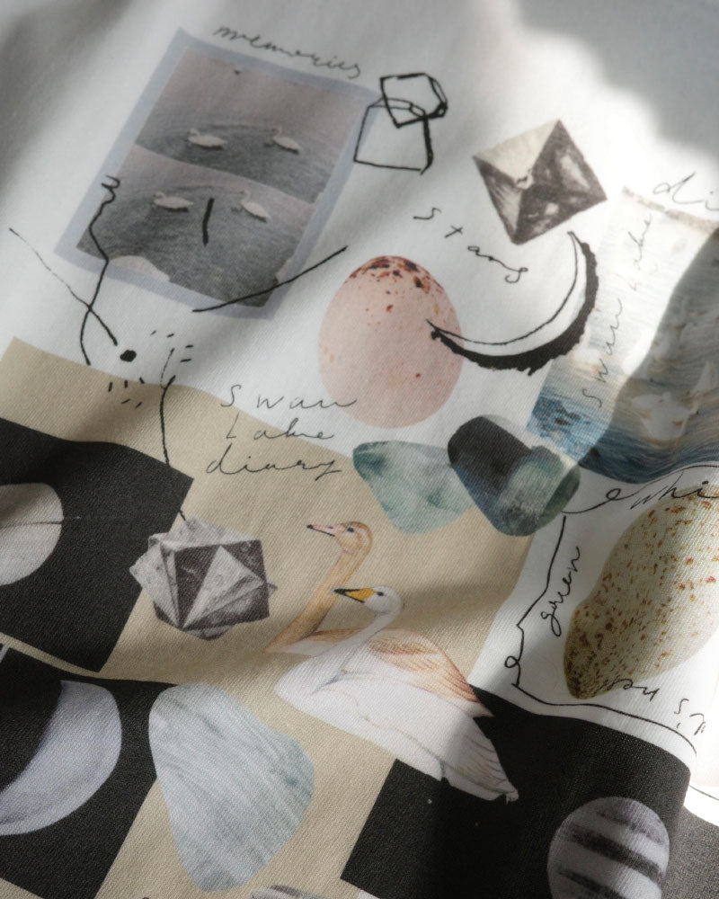 月の満ち欠けと、天体・鉱石を組み合わせた、どこか神秘的なイメージのグラフィック。白鳥座を思わせる、白鳥たちの群れと卵のモチーフから優しくおおらかな雰囲気も感じられます。落ち着いたトーンで、カーディガンやベストとも好相性。