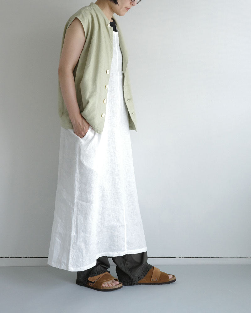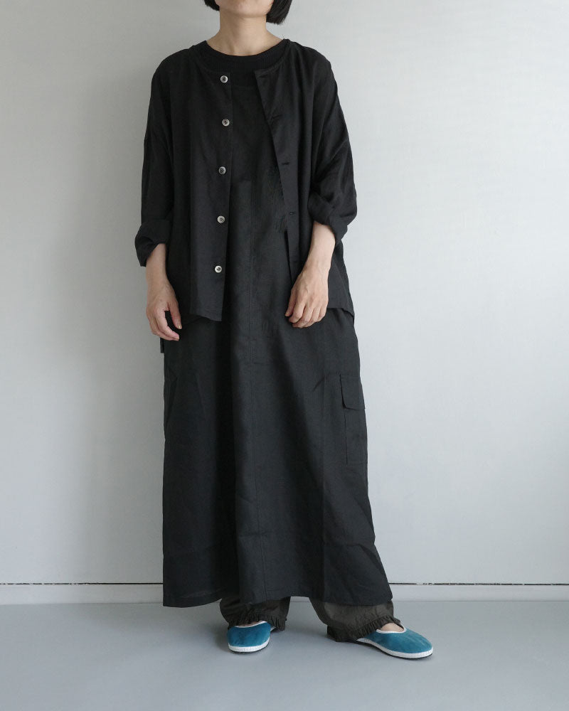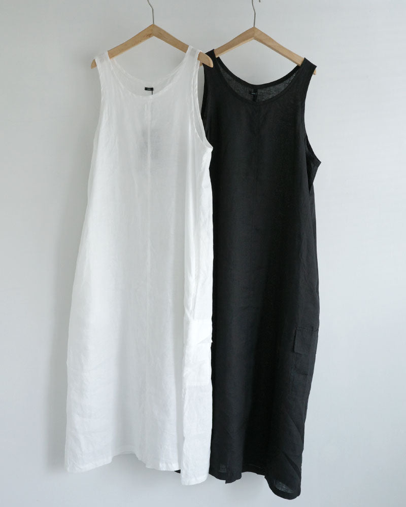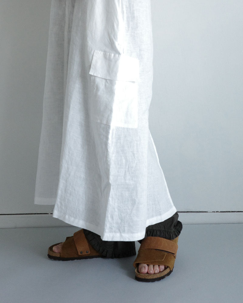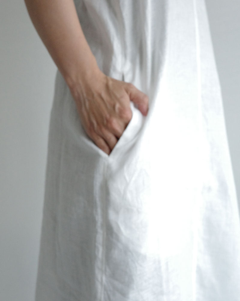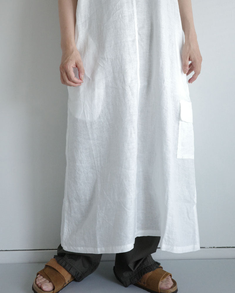 涼やかで、リネンの風合いが映える シンプルな大人のワンピース。低めの位置に左側だけに設けたフラップ付きの カーゴポケットがアクセントになり 一枚でコーディネートの主役になってくれます。 後ろスリットも抜け感を演出してくれます 。中に半袖を合わせたり、上に同じフレンチリネンのジャケットを羽織ったり、着回しやすさも魅力です。
