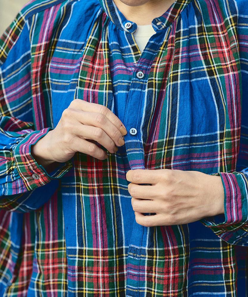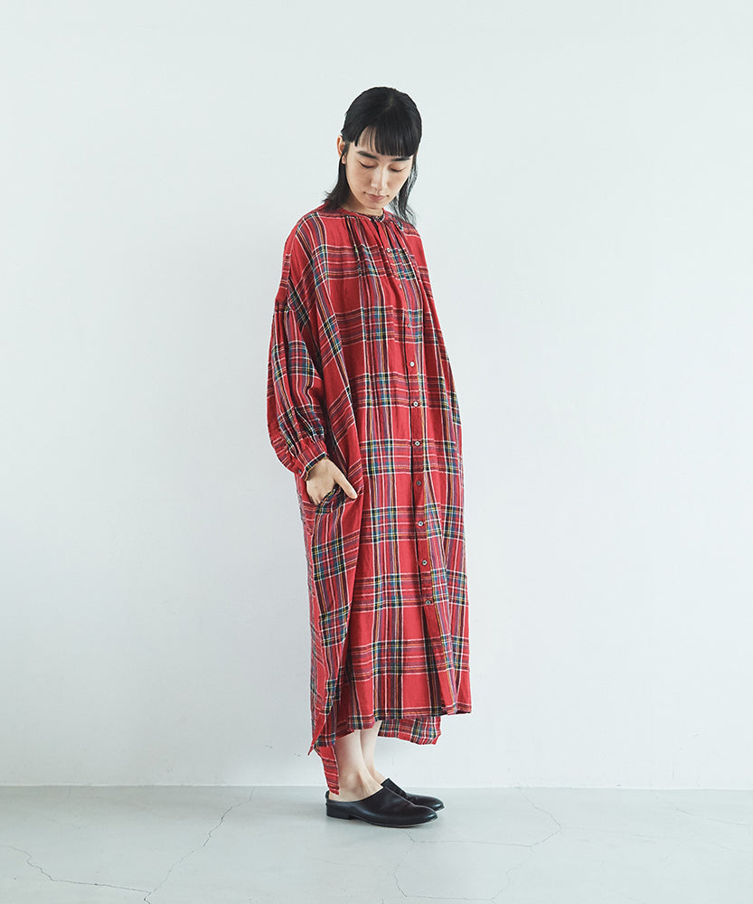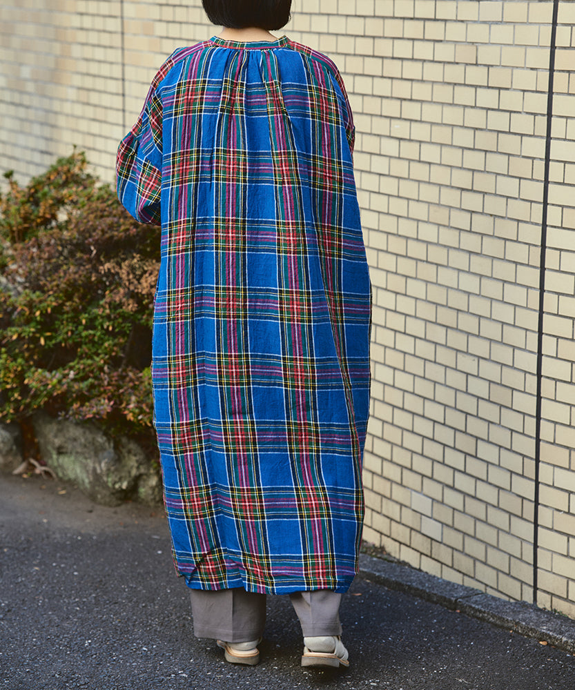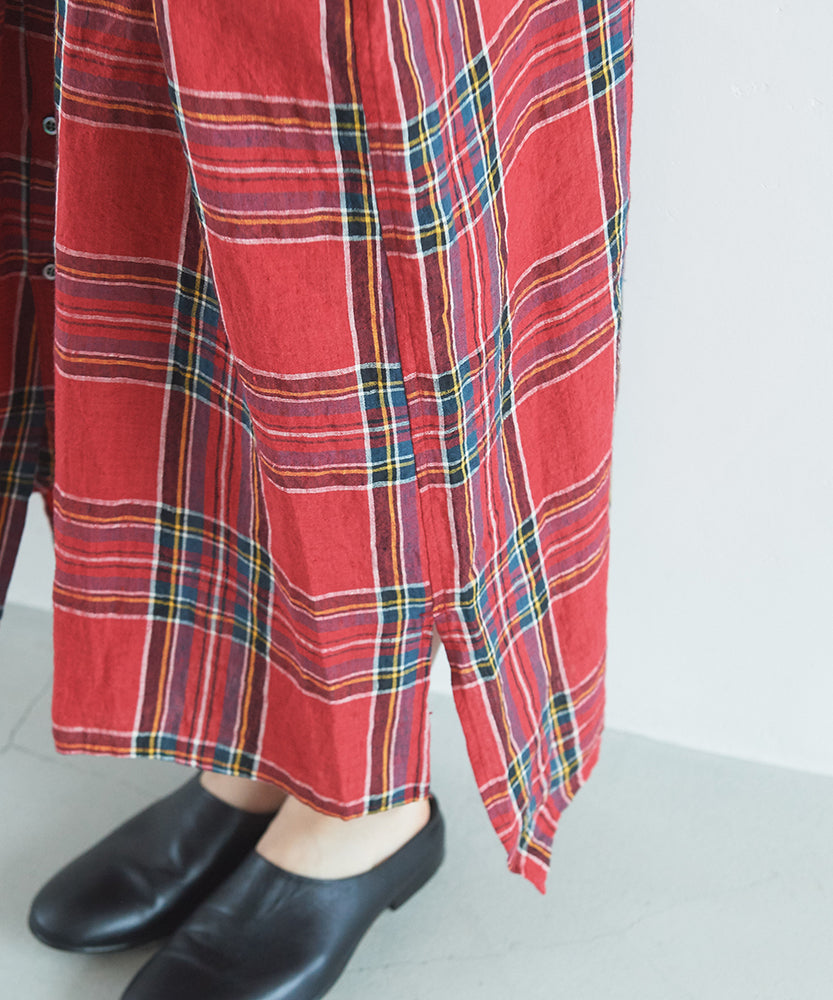 鮮やかな色のリネンチェックが、シンプルな装いに映えます。透け感はほとんどありませんが、ワンピースとして着用するときにはペチコートを合わせていただくと安心です。洗いざらしで着られるのもポイント。