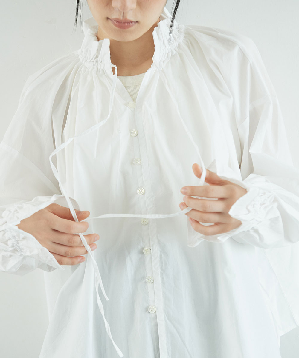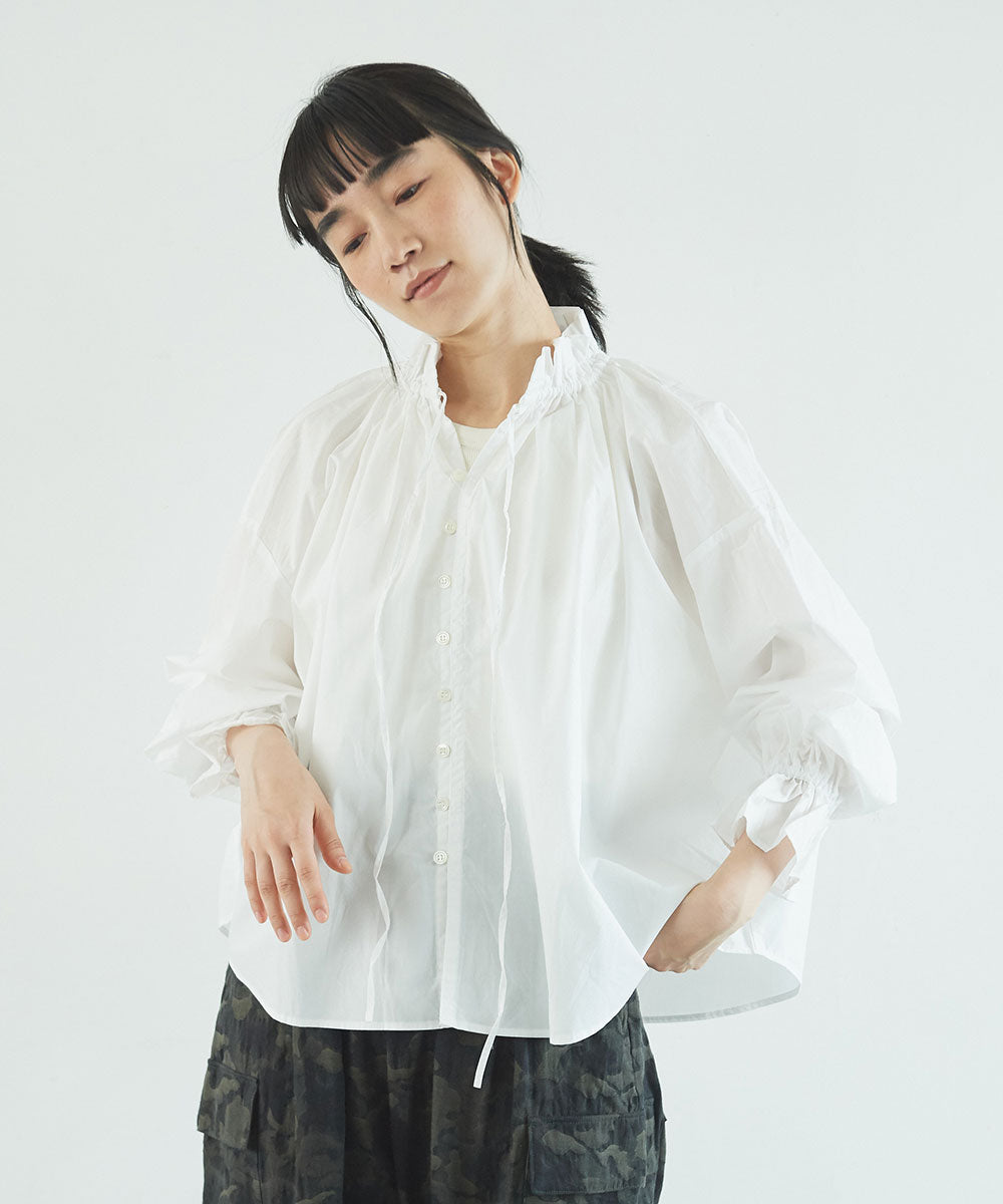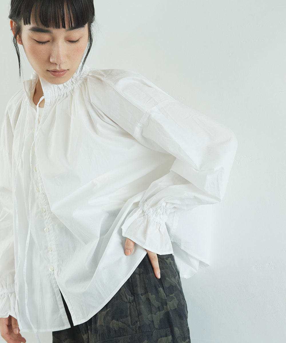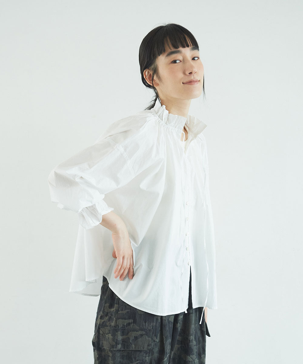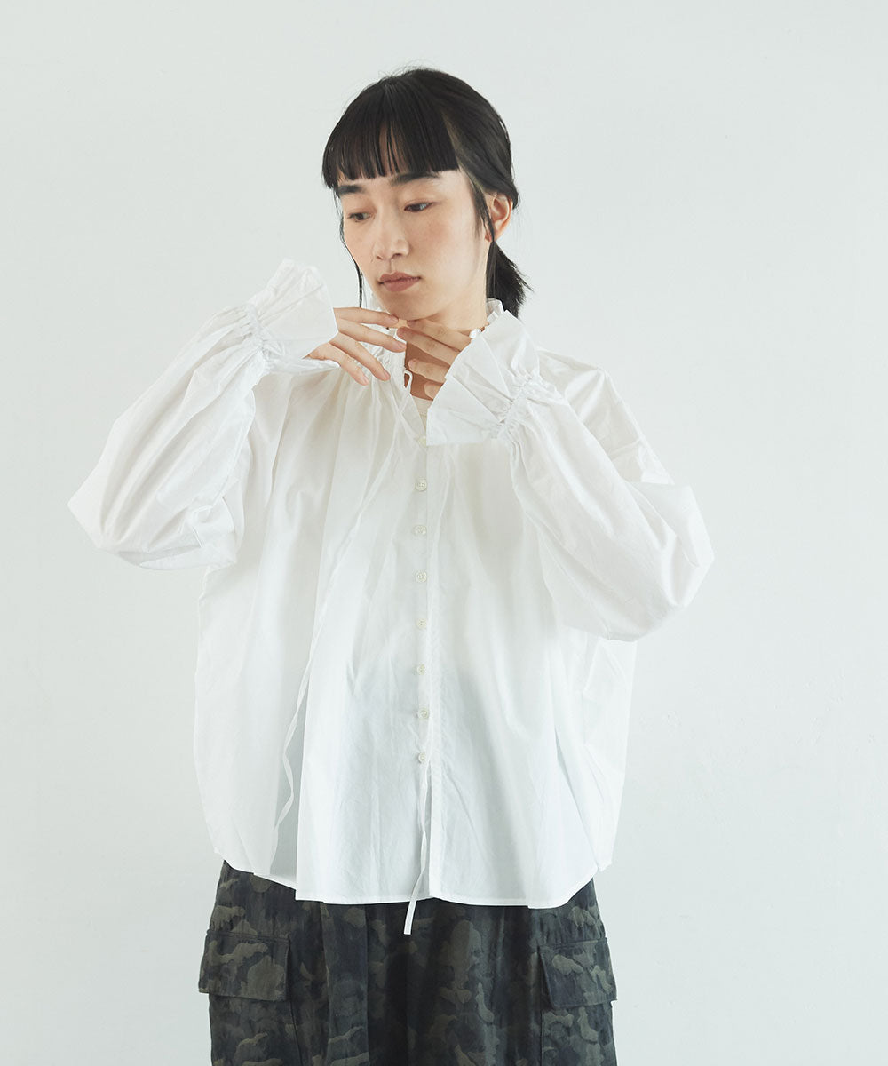 ゆったりとした身幅で、襟のリボンを外して着るとリラックス感のあるこなれた雰囲気になります。袖口はゴムなので、そのままたくし上げてるとボリュームのある袖の形に。