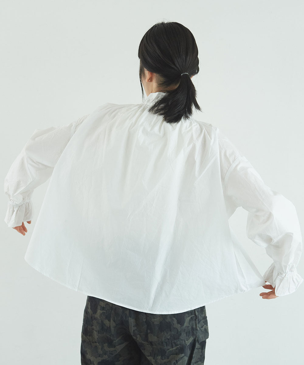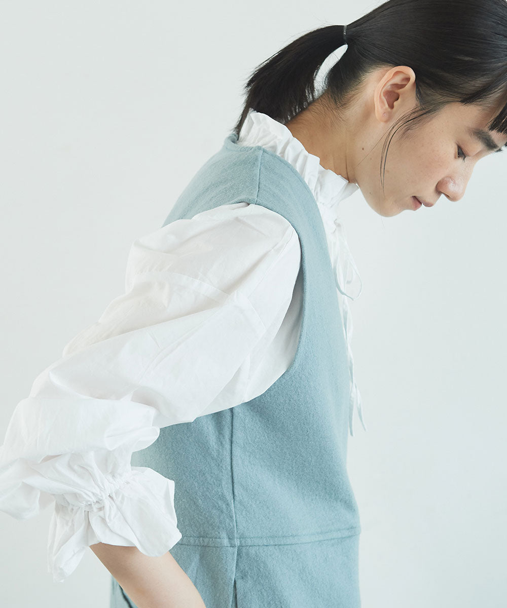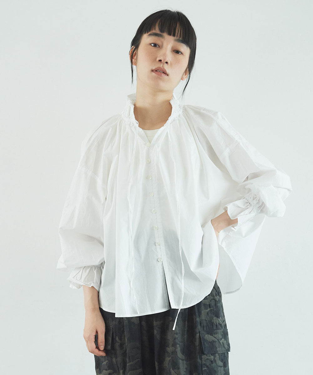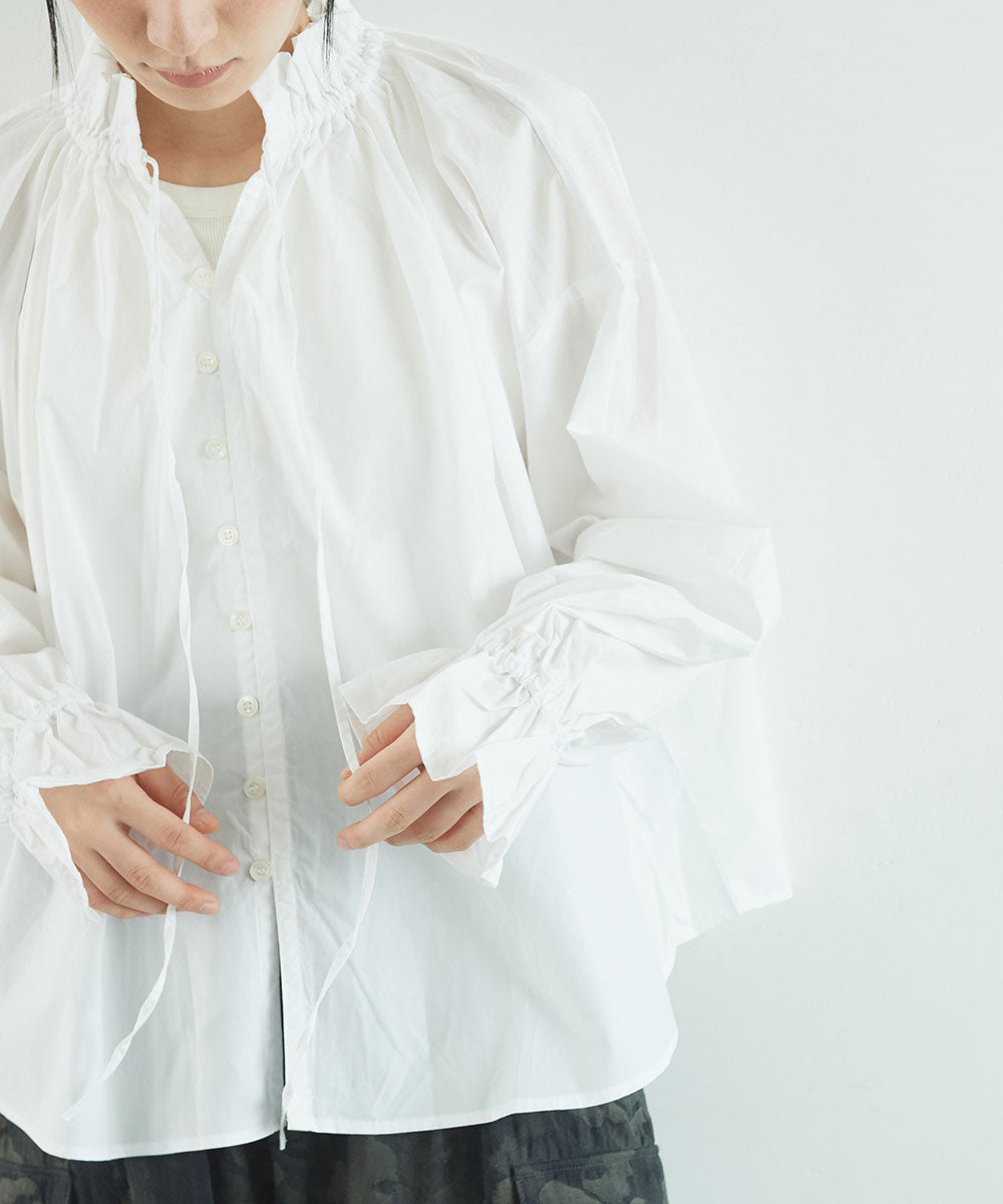 ゆったりとした身幅で、襟のリボンを外して着るとリラックス感のあるこなれた雰囲気になります。袖口はゴムなので、そのままたくし上げてるとボリュームのある袖の形に。