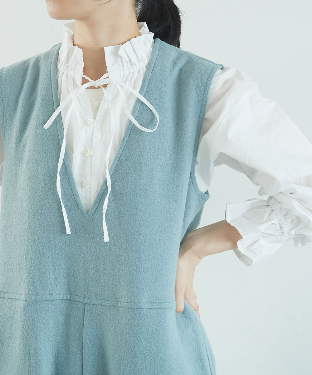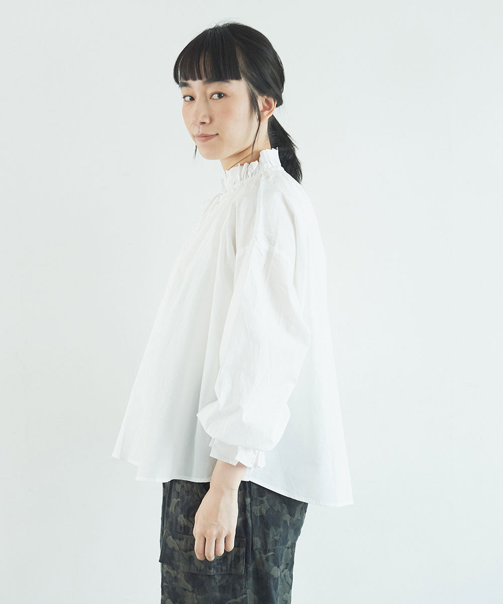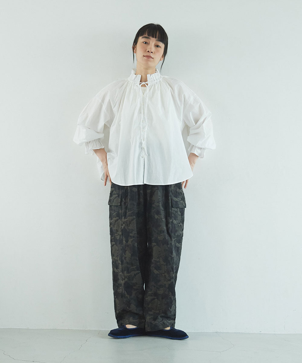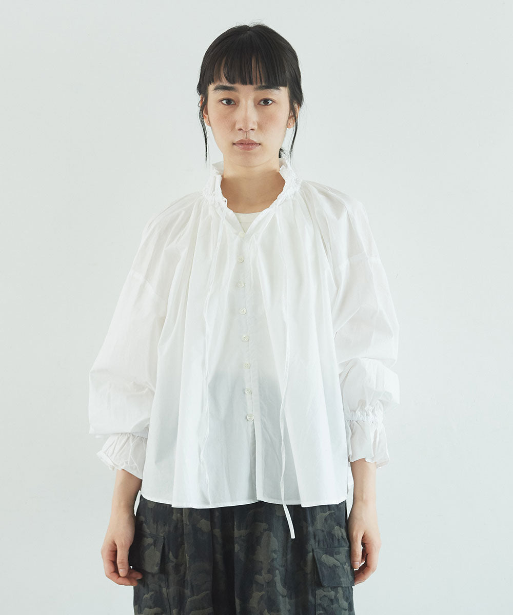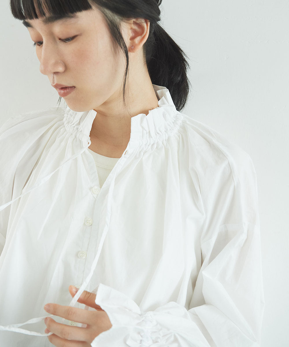 ゆったりとした身幅で、襟のリボンを外して着るとリラックス感のあるこなれた雰囲気になります。袖口はゴムなので、そのままたくし上げてるとボリュームのある袖の形に。