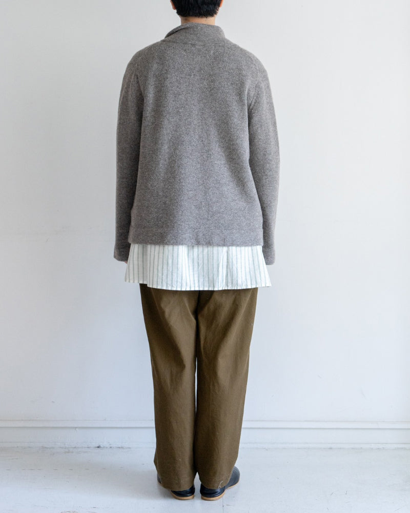 ヤク混の柔らかいニットを縮絨させたジャケット風カーディガンです。洗いをかけたくたっとした柔らかな風合いで、暖かく肌触りの良いニットです。秋の始まりにはアウターとして、寒い季節にはカーディガンとしてコートの中も着られる程よいサイズ感です。