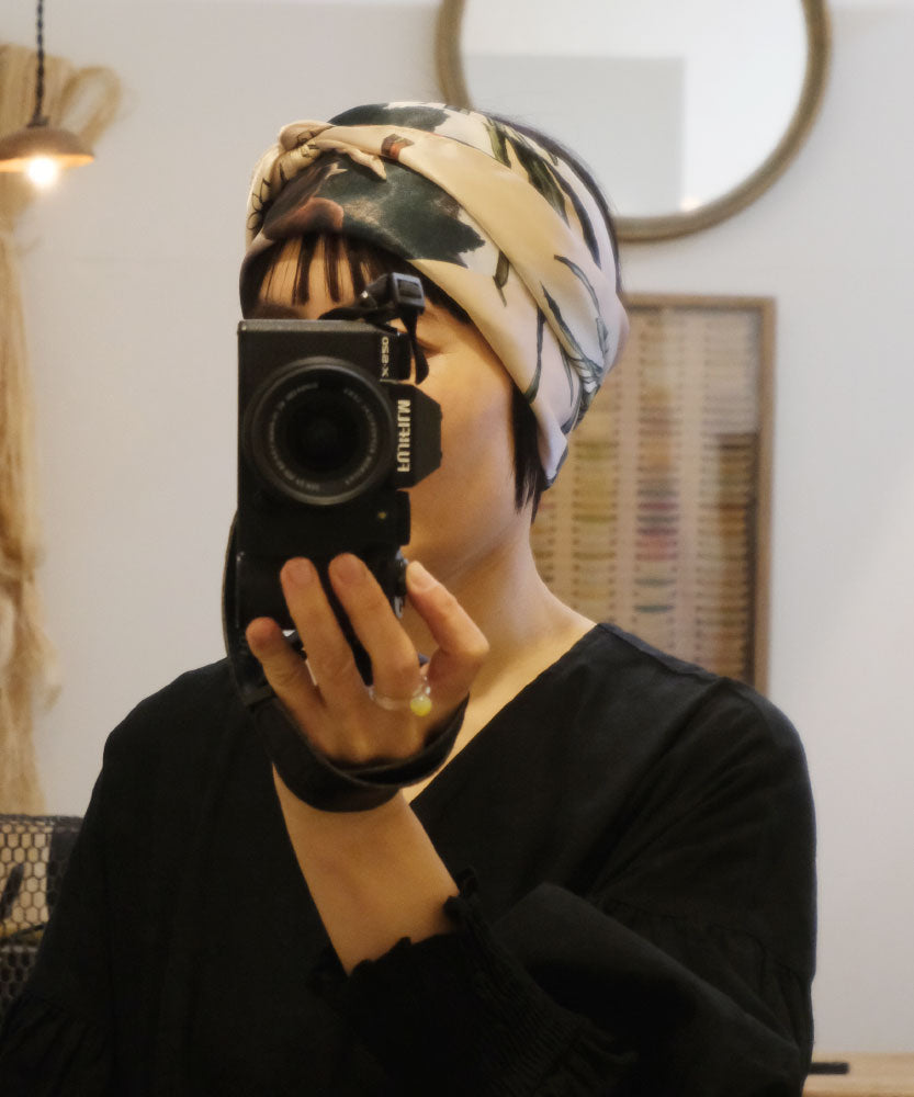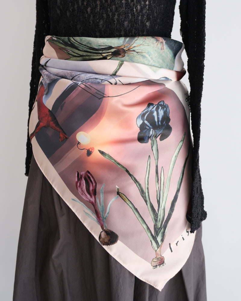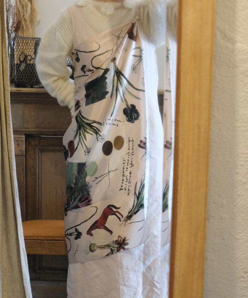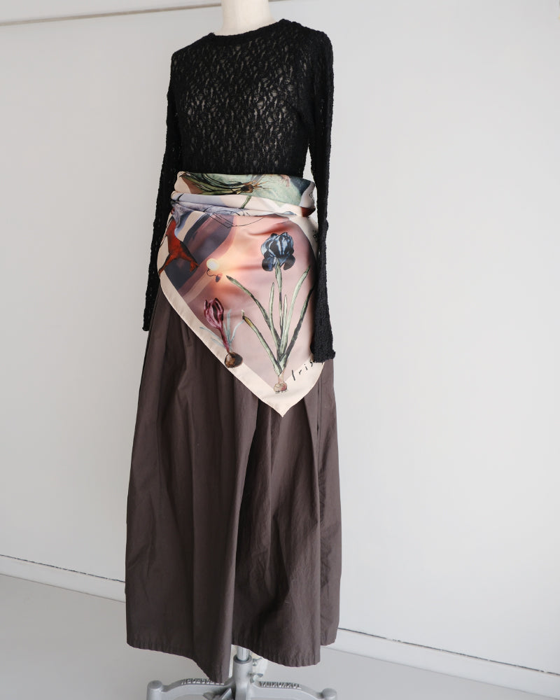 大判のスカーフです。ゆったりと肩に巻いたり、胸元に巻いてビスチェのように使ったり、腰に巻いたりすることができます。夏には日除のアイテムとして、寒い季節には防寒アイテムとしてアクセサリーのように日々楽しむことができます。