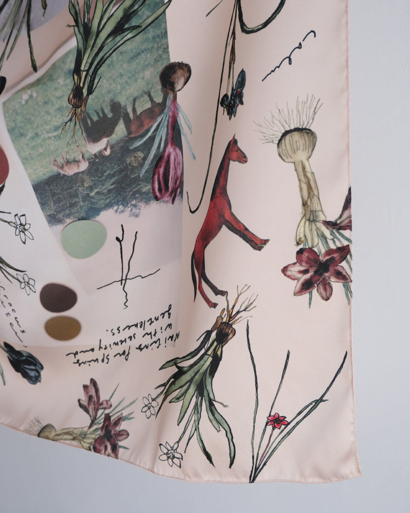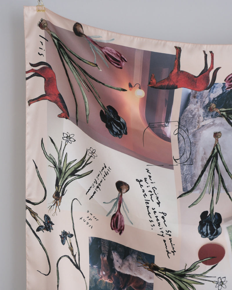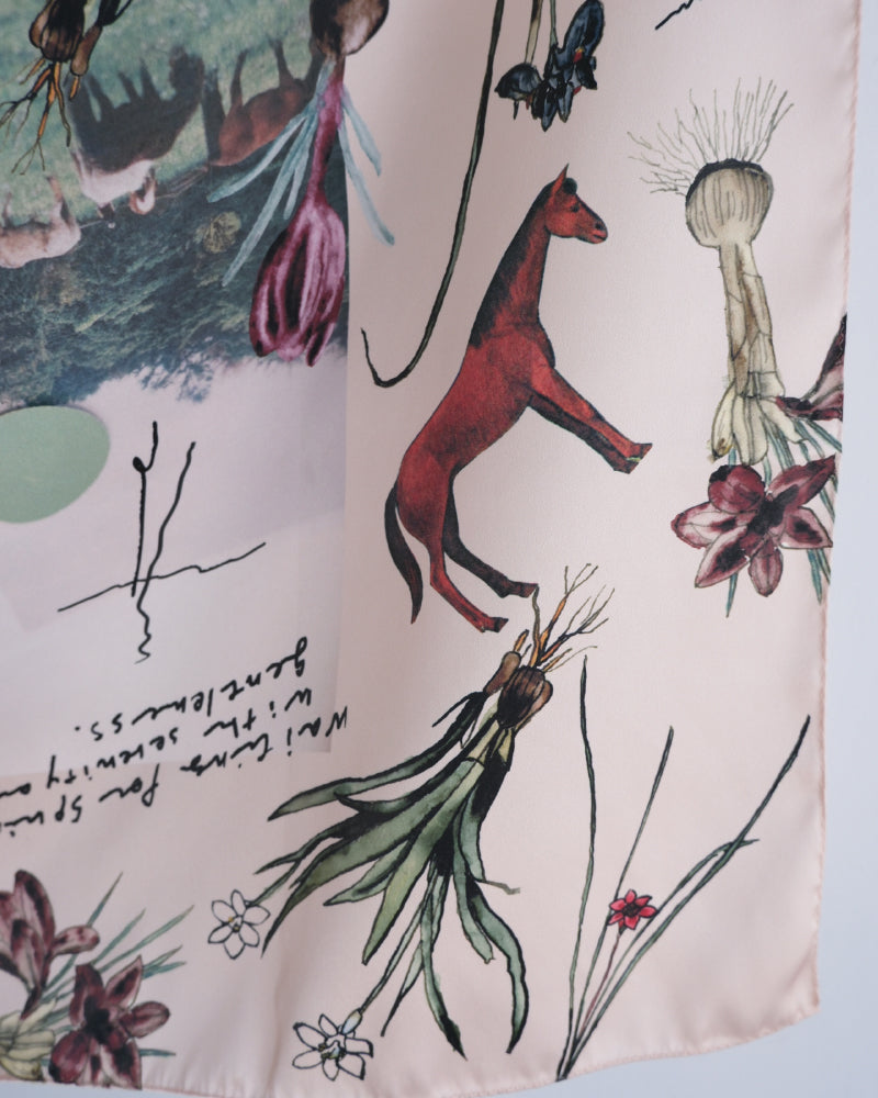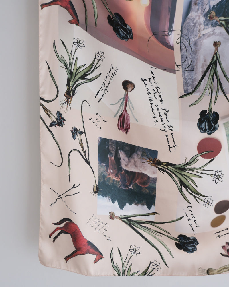 大判のスカーフです。ゆったりと肩に巻いたり、胸元に巻いてビスチェのように使ったり、腰に巻いたりすることができます。夏には日除のアイテムとして、寒い季節には防寒アイテムとしてアクセサリーのように日々楽しむことができます。
