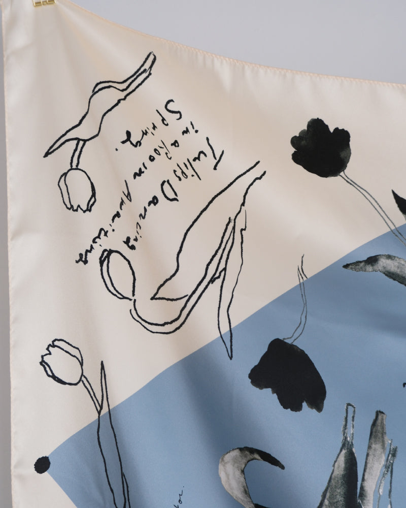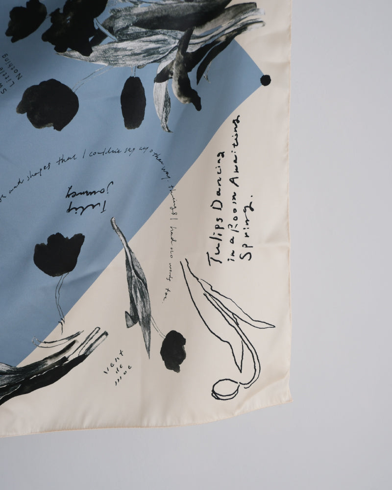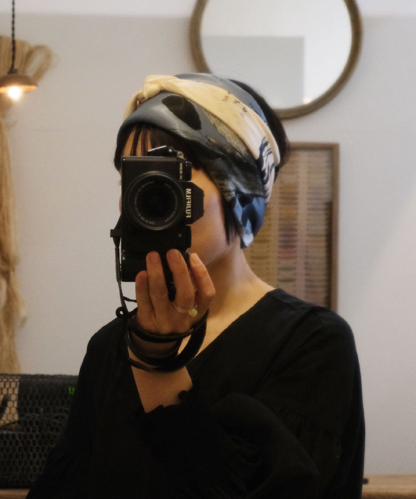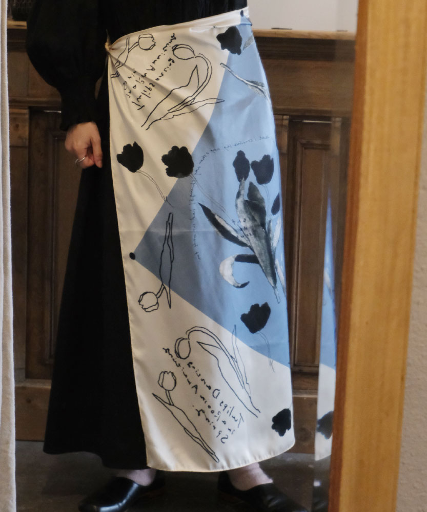 大判のスカーフです。ゆったりと肩に巻いたり、胸元に巻いてビスチェのように使ったり、腰に巻いたりすることができます。夏には日除のアイテムとして、寒い季節には防寒アイテムとしてアクセサリーのように日々楽しむことができます。